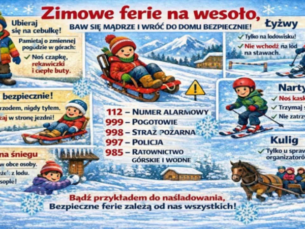Zapraszamy wszystkie dzieci naszej szkoły do włączenia się w szkolny konkurs plastyczny „Bezpieczne ferie zimowe”, którego celem jest promowanie zasad bezpieczeństwa podczas zimowego wypoczynku oraz rozwijanie kreatywności uczniów.