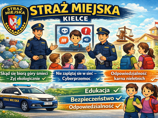 W naszej szkole odbyła się wizyta funkcjonariusza Straży Miejskiej w Kielcach, podczas której przeprowadził prelekcje profilaktyczno-edukacyjne dla uczniów. Spotkanie dotyczyło zagadnień związanych z ochroną środowiska, bezpieczeństwem w sieci oraz odpowiedzialnością prawną osób nieletnich.