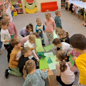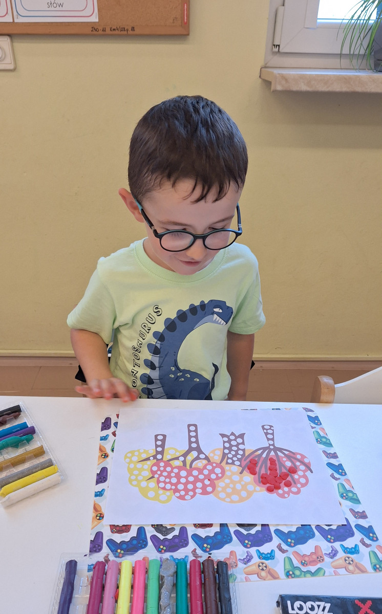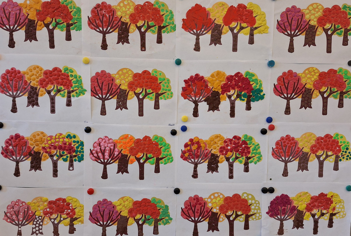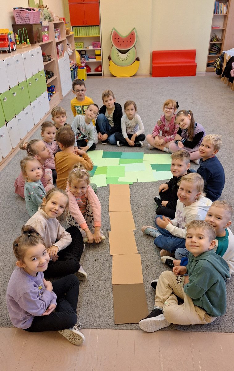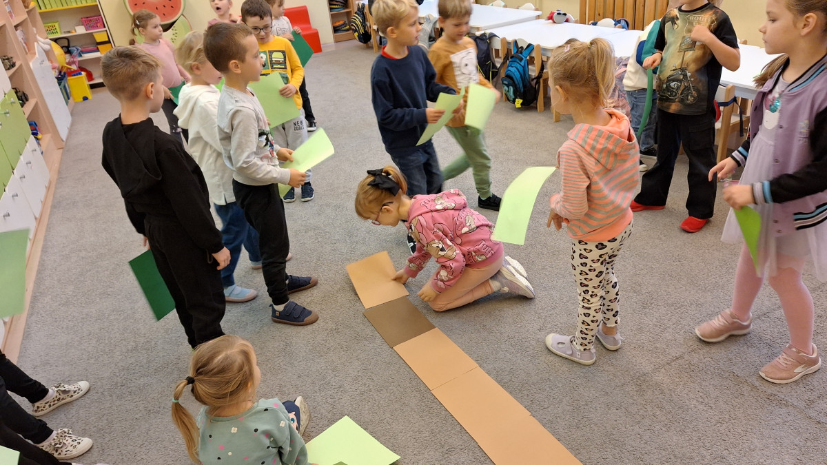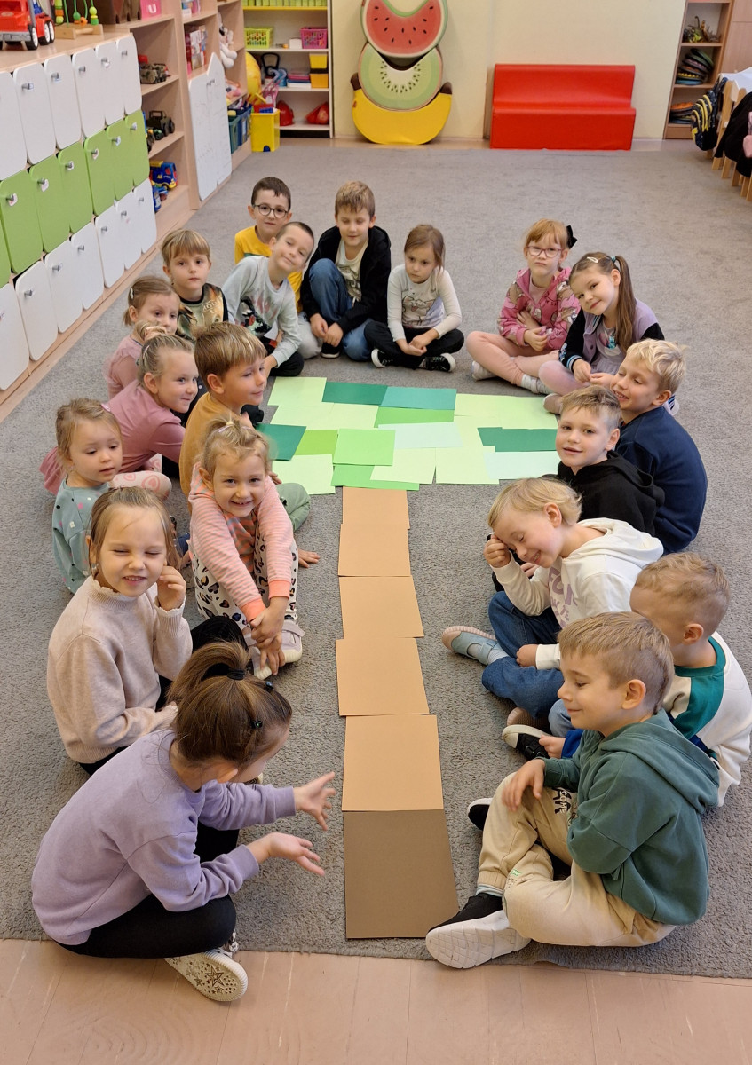 W ramach wspólnej zabawy i nauki dzieci ułożyły napis oraz symboliczne drzewo z kartek, a następnie wykonały piękne prace plastyczne pt. „Jesienne drzewa”, które ozdobiły naszą salę, wprowadzając do niej prawdziwie jesienny nastrój.