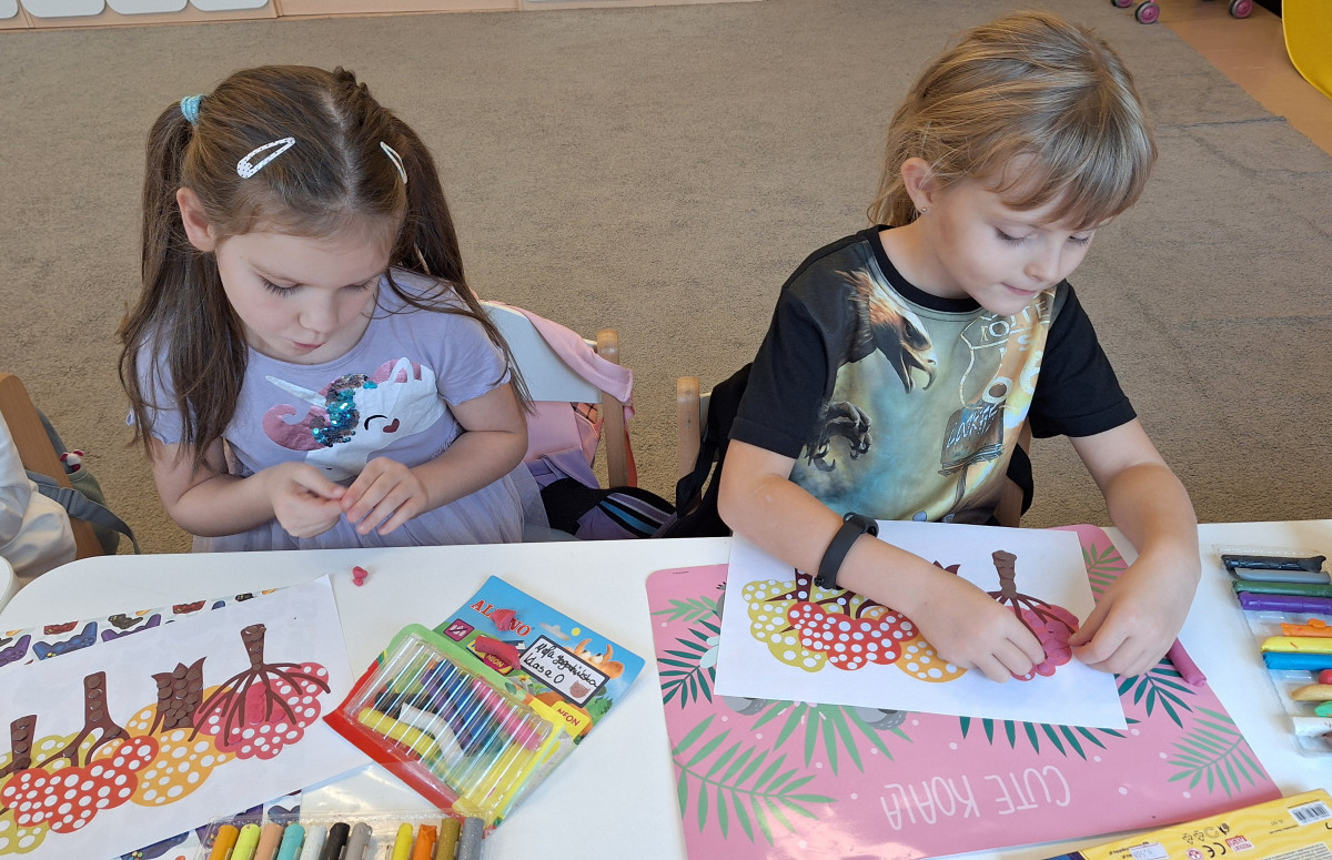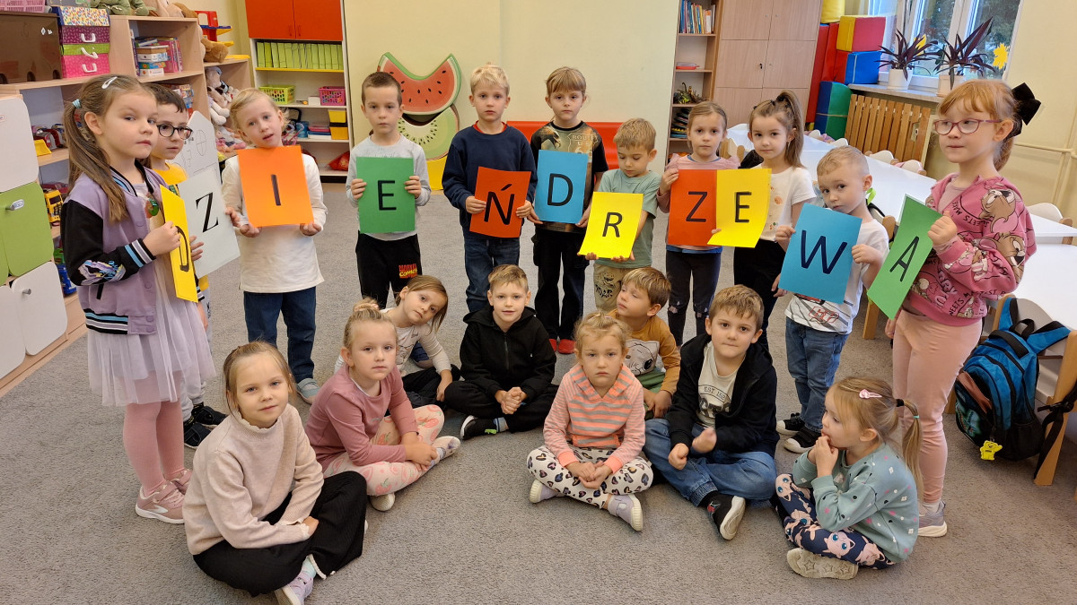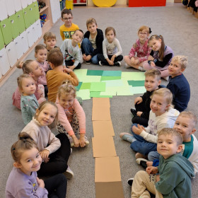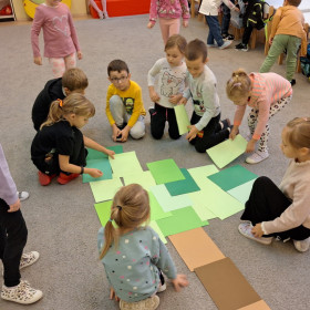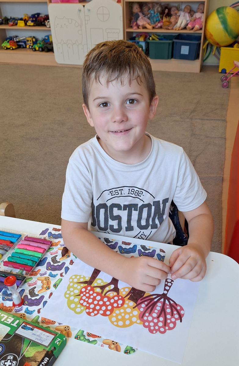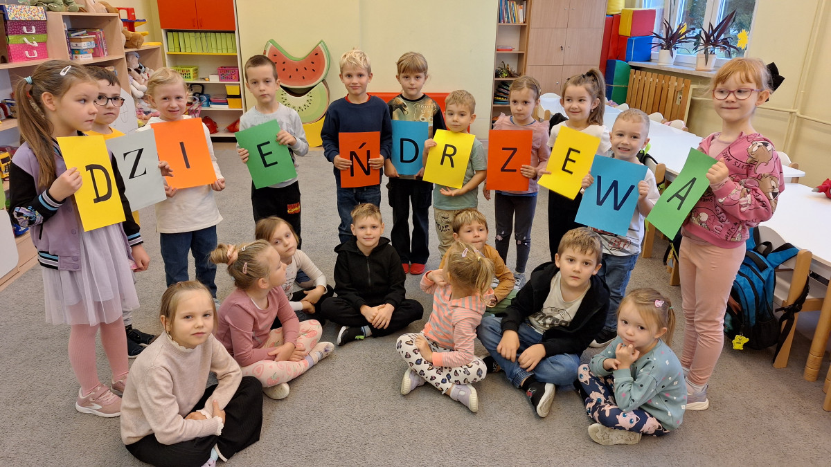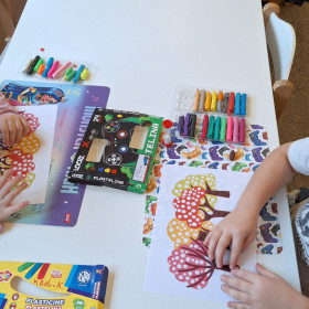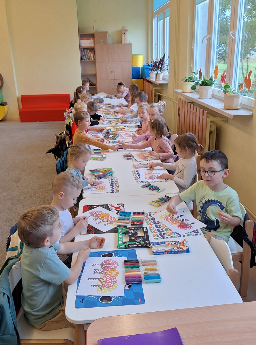 W ramach wspólnej zabawy i nauki dzieci ułożyły napis oraz symboliczne drzewo z kartek, a następnie wykonały piękne prace plastyczne pt. „Jesienne drzewa”, które ozdobiły naszą salę, wprowadzając do niej prawdziwie jesienny nastrój.