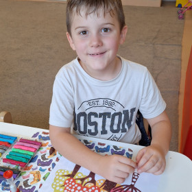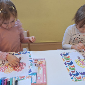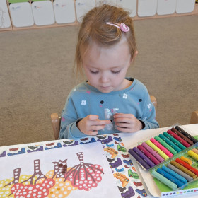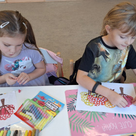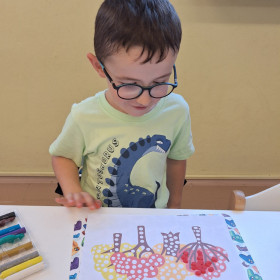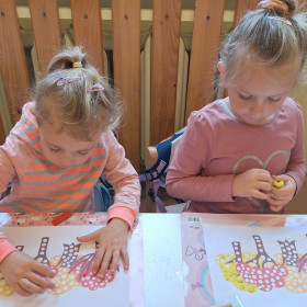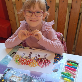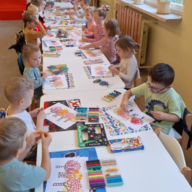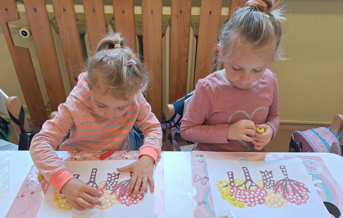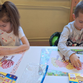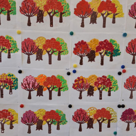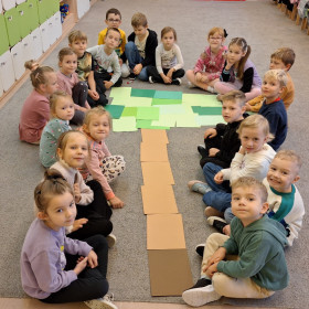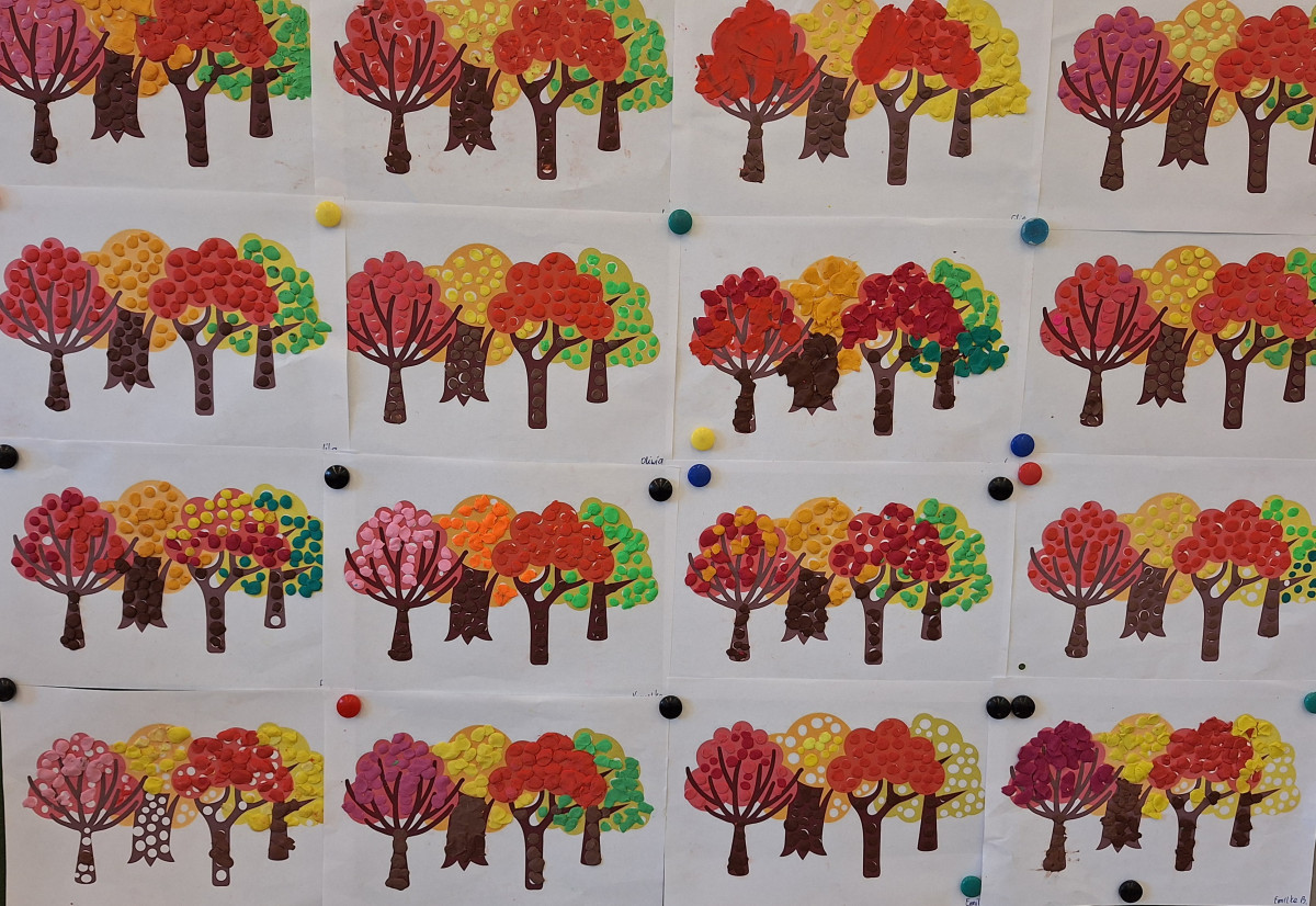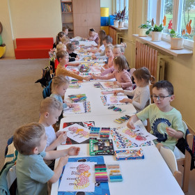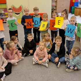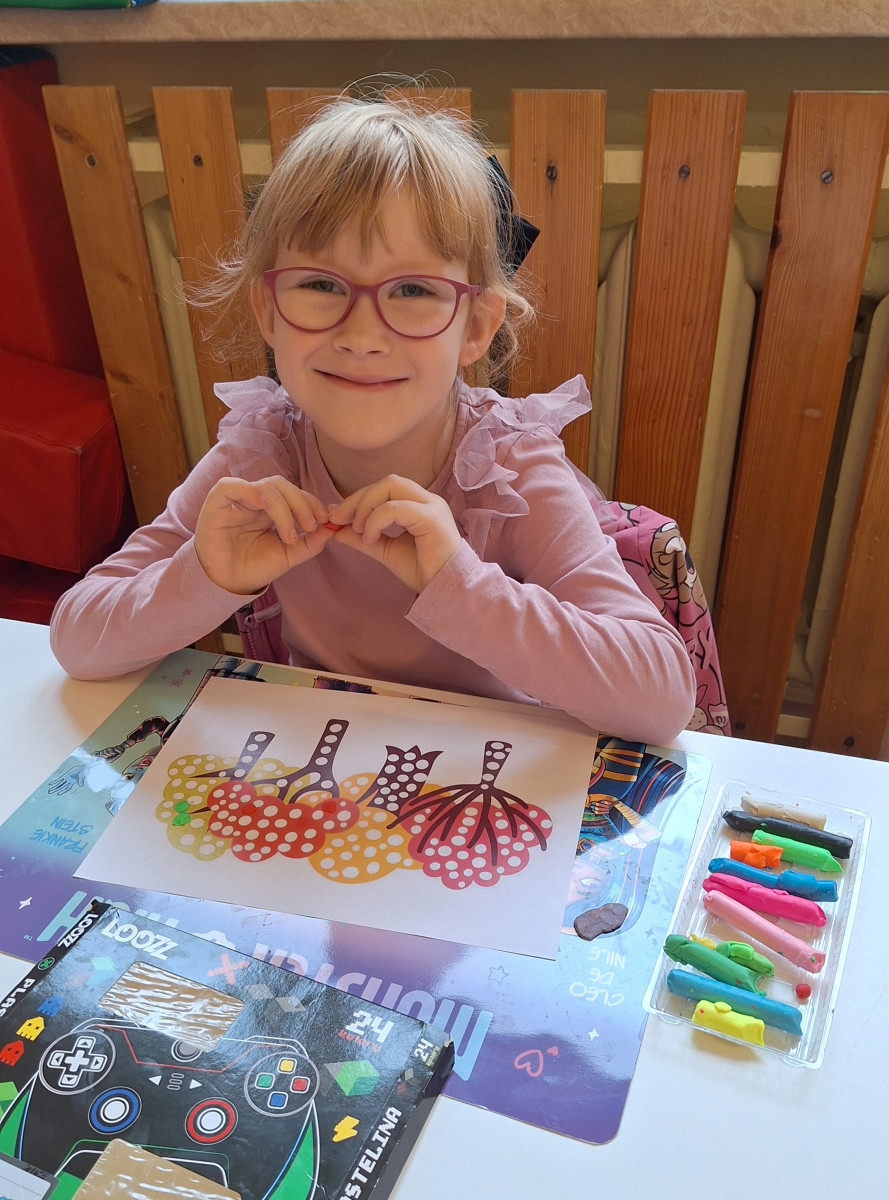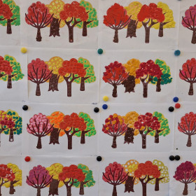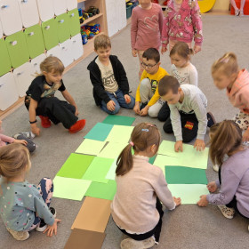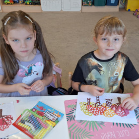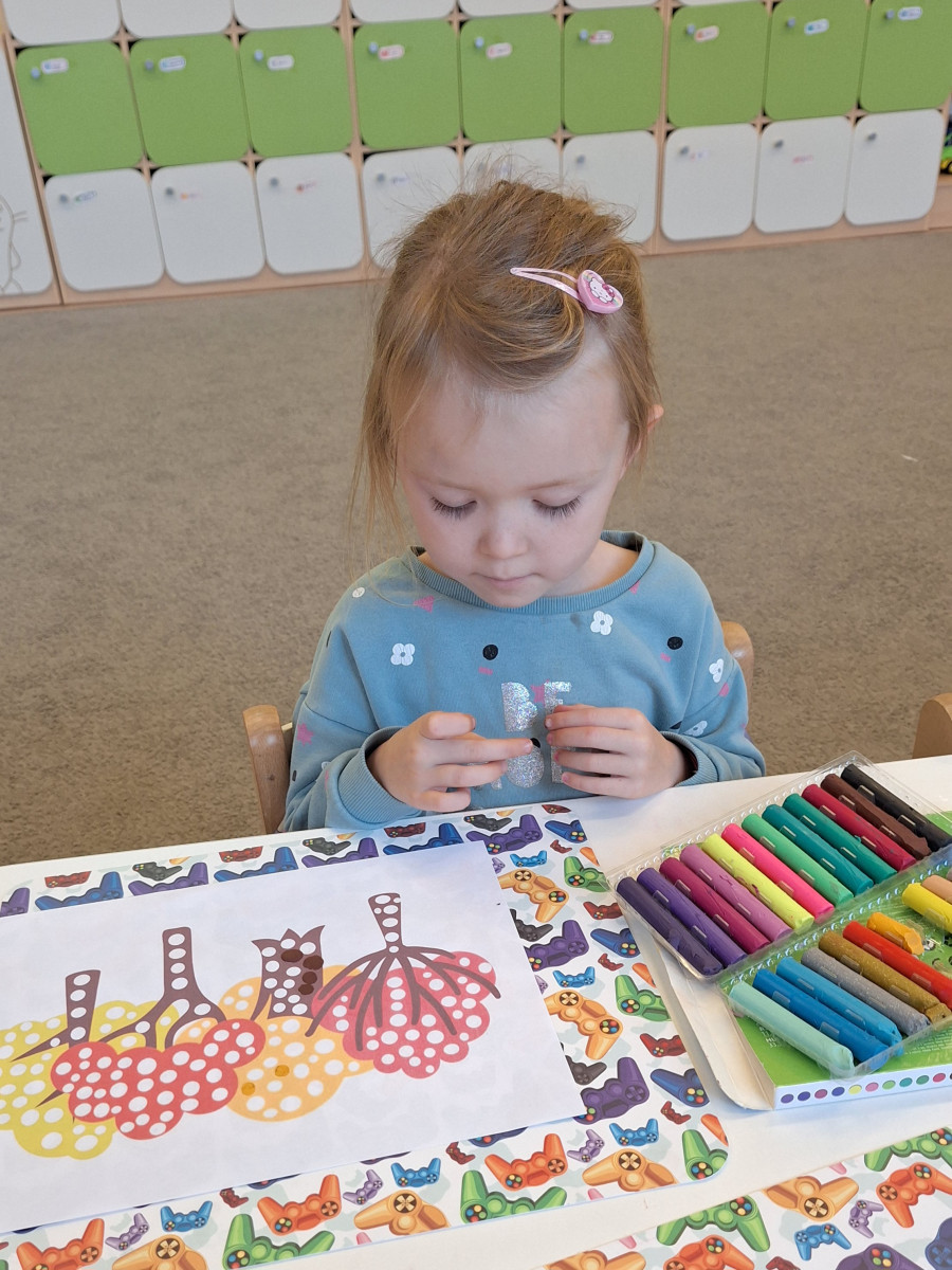 W ramach wspólnej zabawy i nauki dzieci ułożyły napis oraz symboliczne drzewo z kartek, a następnie wykonały piękne prace plastyczne pt. „Jesienne drzewa”, które ozdobiły naszą salę, wprowadzając do niej prawdziwie jesienny nastrój.