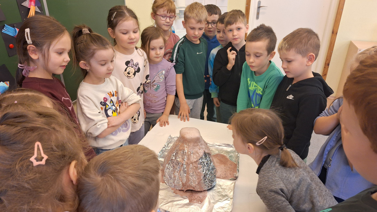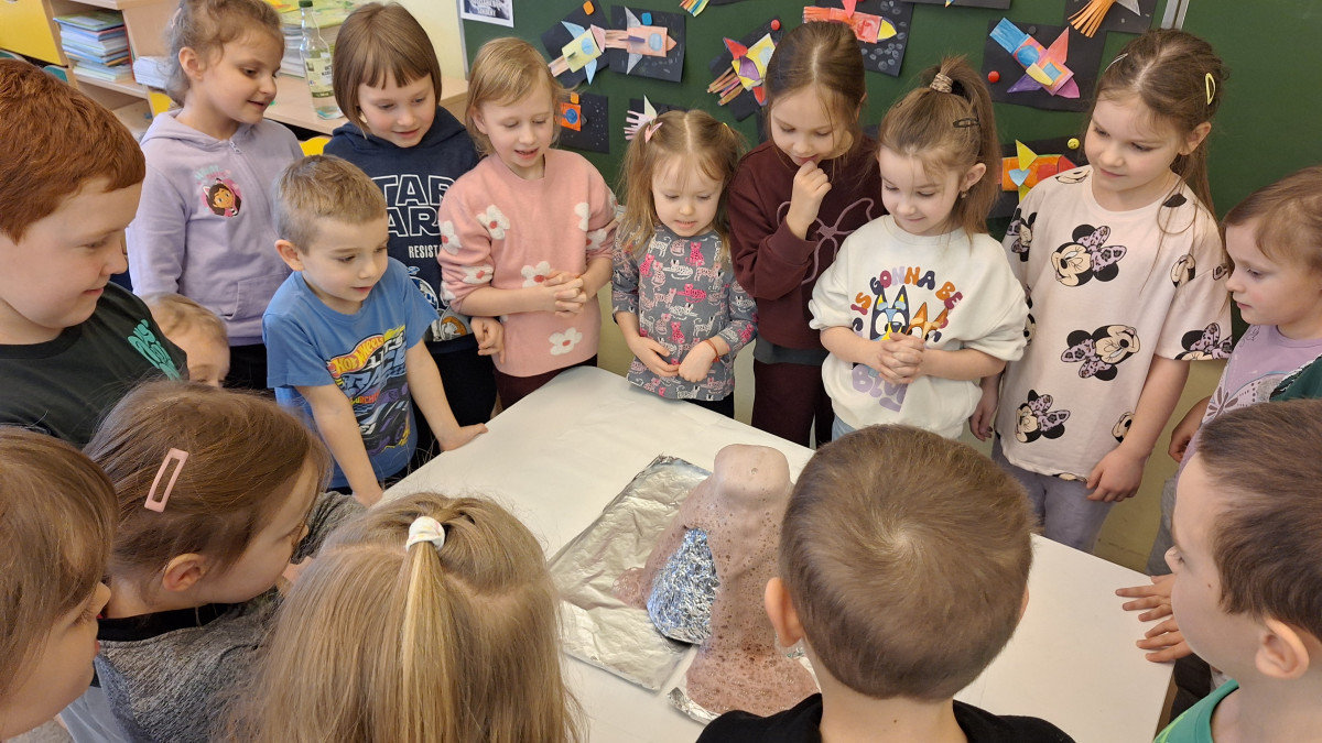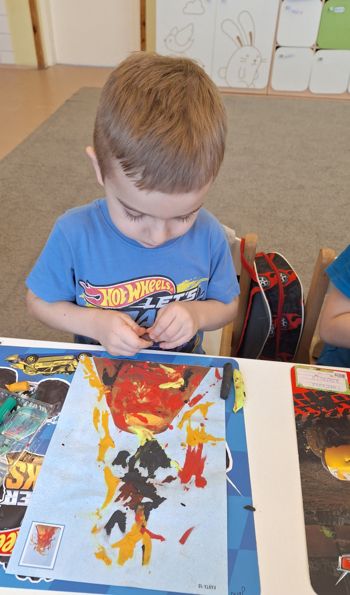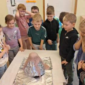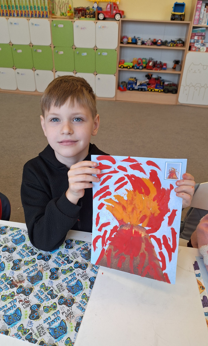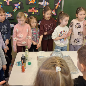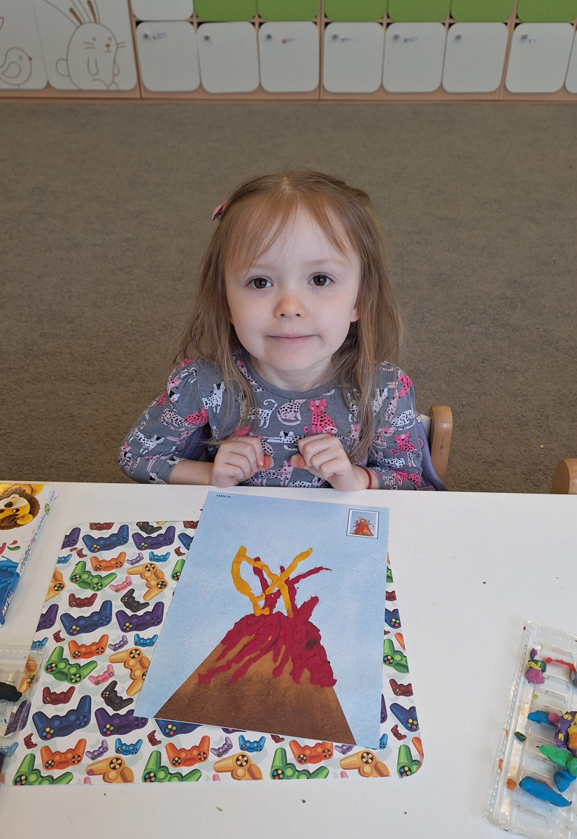 Zdobytą wiedzę teoretyczną sprawdziliśmy w praktyce, przeprowadzając widowiskowy eksperyment z wulkanem. Przedszkolaki z ogromnym zaciekawieniem obserwowały, jak łączenie różnych składników prowadzi do nagłej, zaskakującej reakcji i efektownej erupcji. To doświadczenie pokazało nam, że chemia i fizyka mogą być fascynującą zabawą. Na zakończenie zajęć dzieci wykonały kolorowe wulkany, utrwalając w ten sposób nowo zdobytą wiedzę.