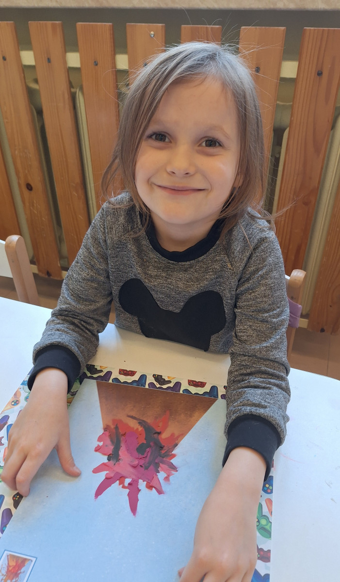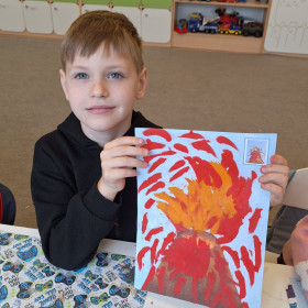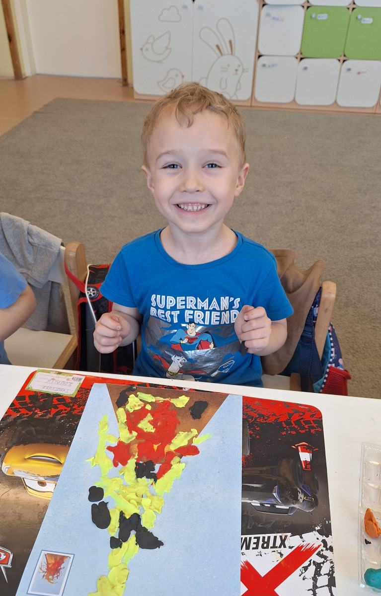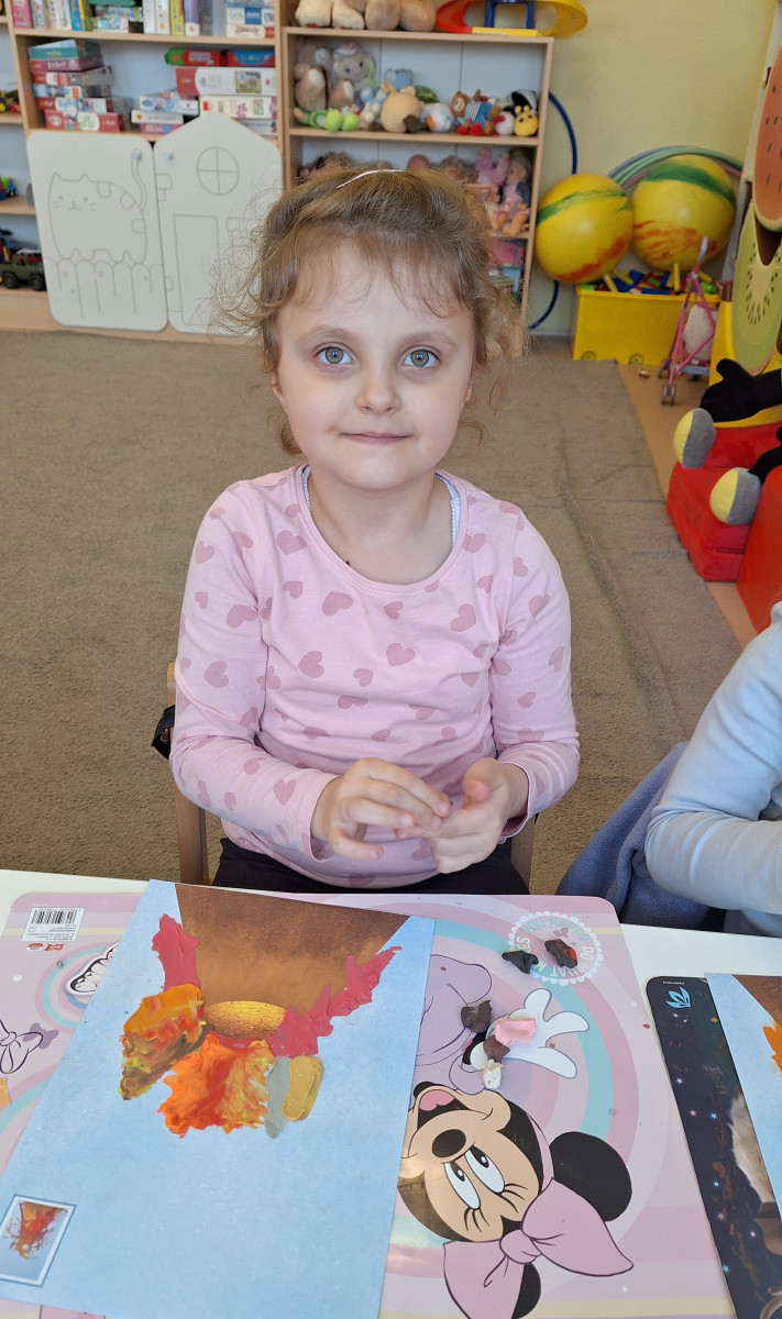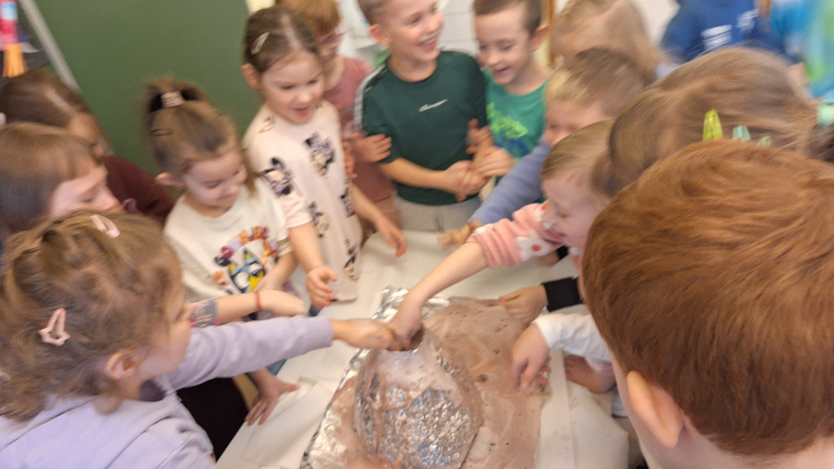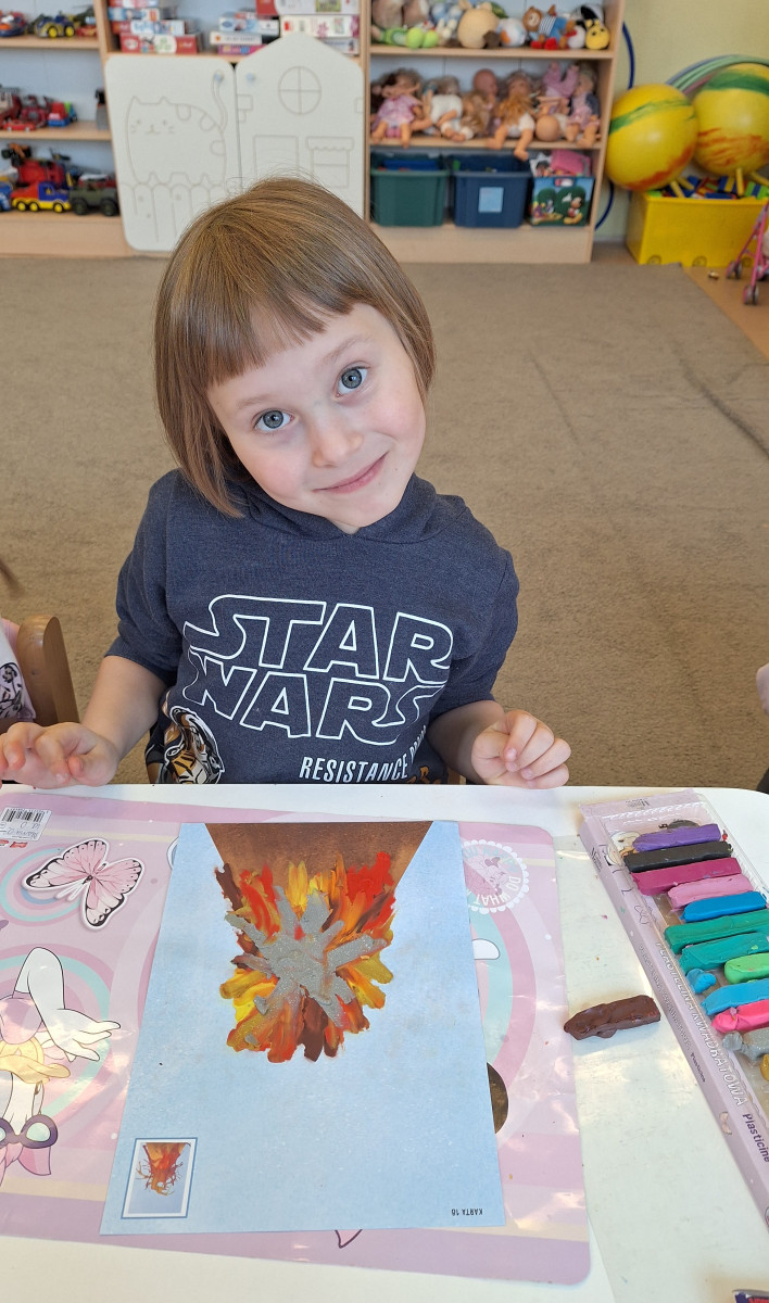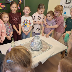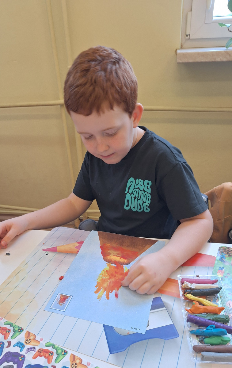 Zdobytą wiedzę teoretyczną sprawdziliśmy w praktyce, przeprowadzając widowiskowy eksperyment z wulkanem. Przedszkolaki z ogromnym zaciekawieniem obserwowały, jak łączenie różnych składników prowadzi do nagłej, zaskakującej reakcji i efektownej erupcji. To doświadczenie pokazało nam, że chemia i fizyka mogą być fascynującą zabawą. Na zakończenie zajęć dzieci wykonały kolorowe wulkany, utrwalając w ten sposób nowo zdobytą wiedzę.