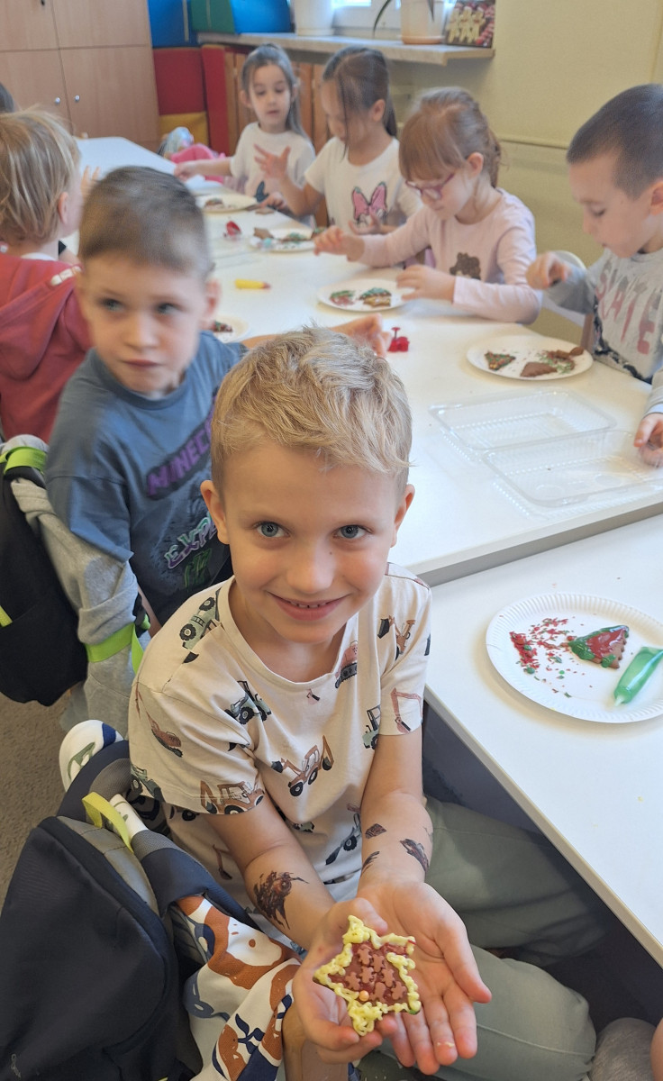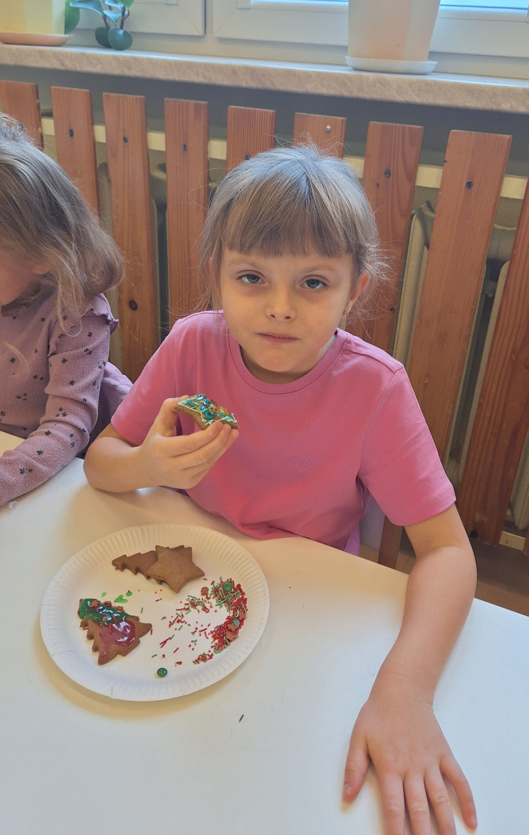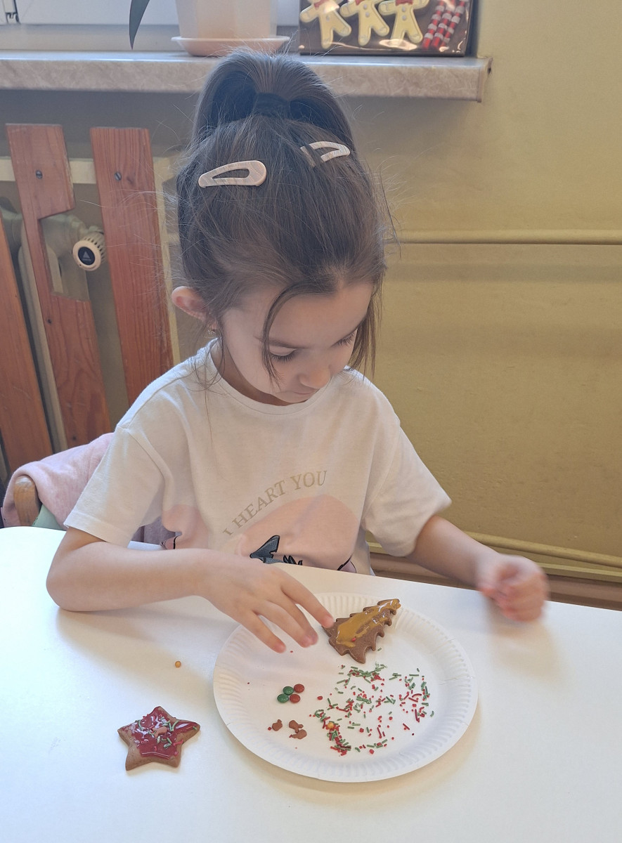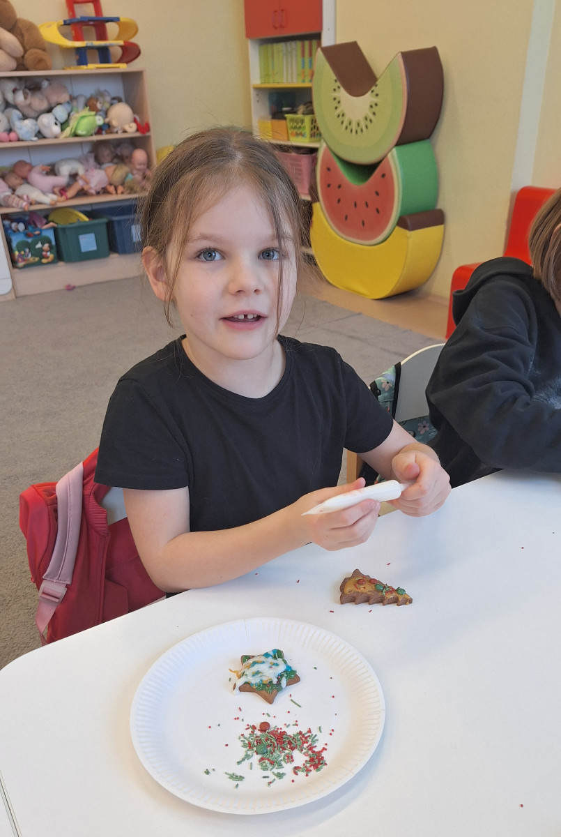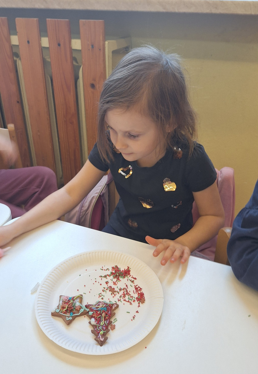 Po tej krótkiej, bardzo interesującej opowieści nadszedł czas na twórczą pracę. Dzieci z ogromnym zaangażowaniem dekorowały swoje pierniczki, a efekty ich pracy prezentowały się wspaniale — kolorowe, pięknie ozdobione i oczywiście bardzo smaczne!