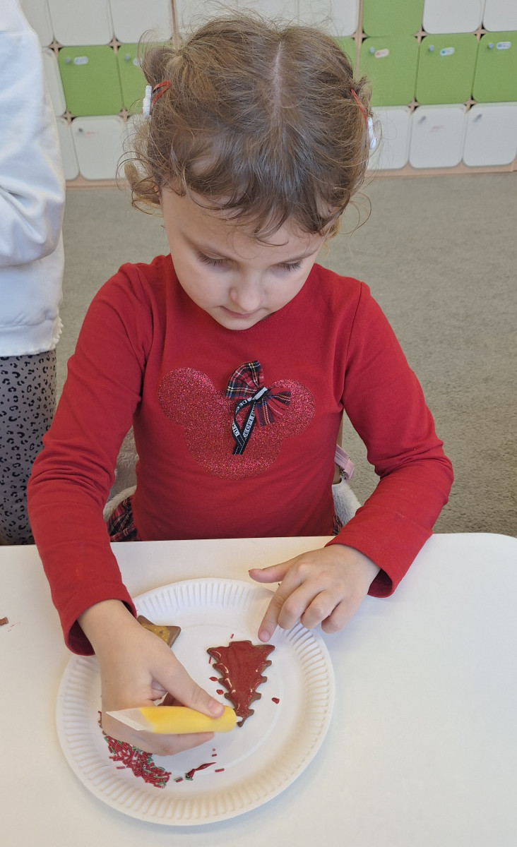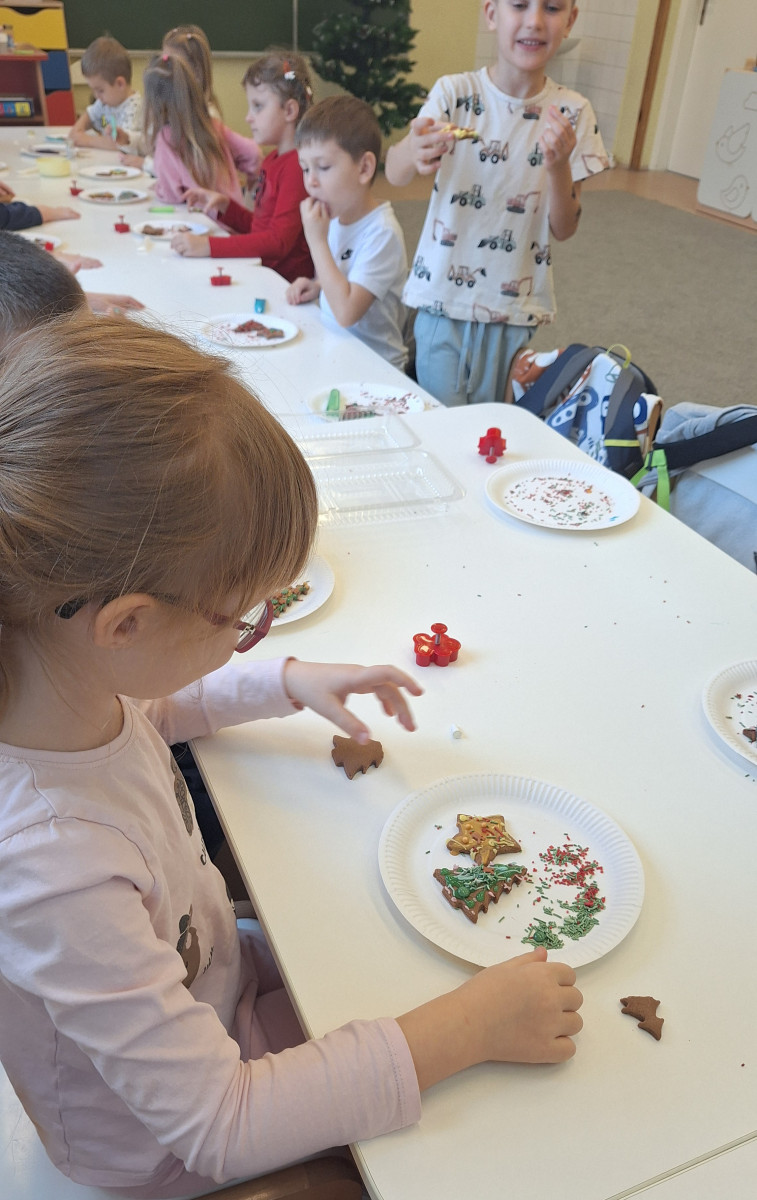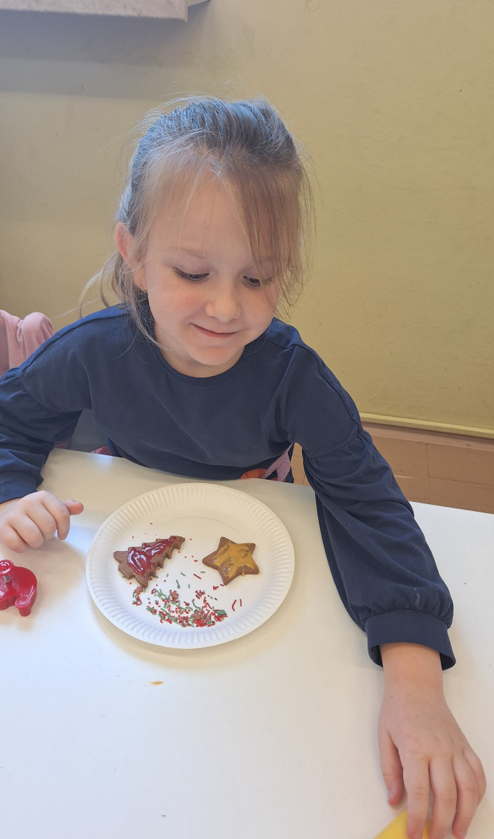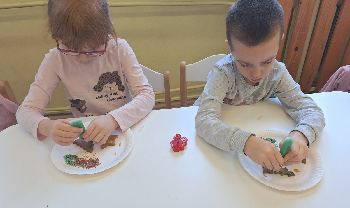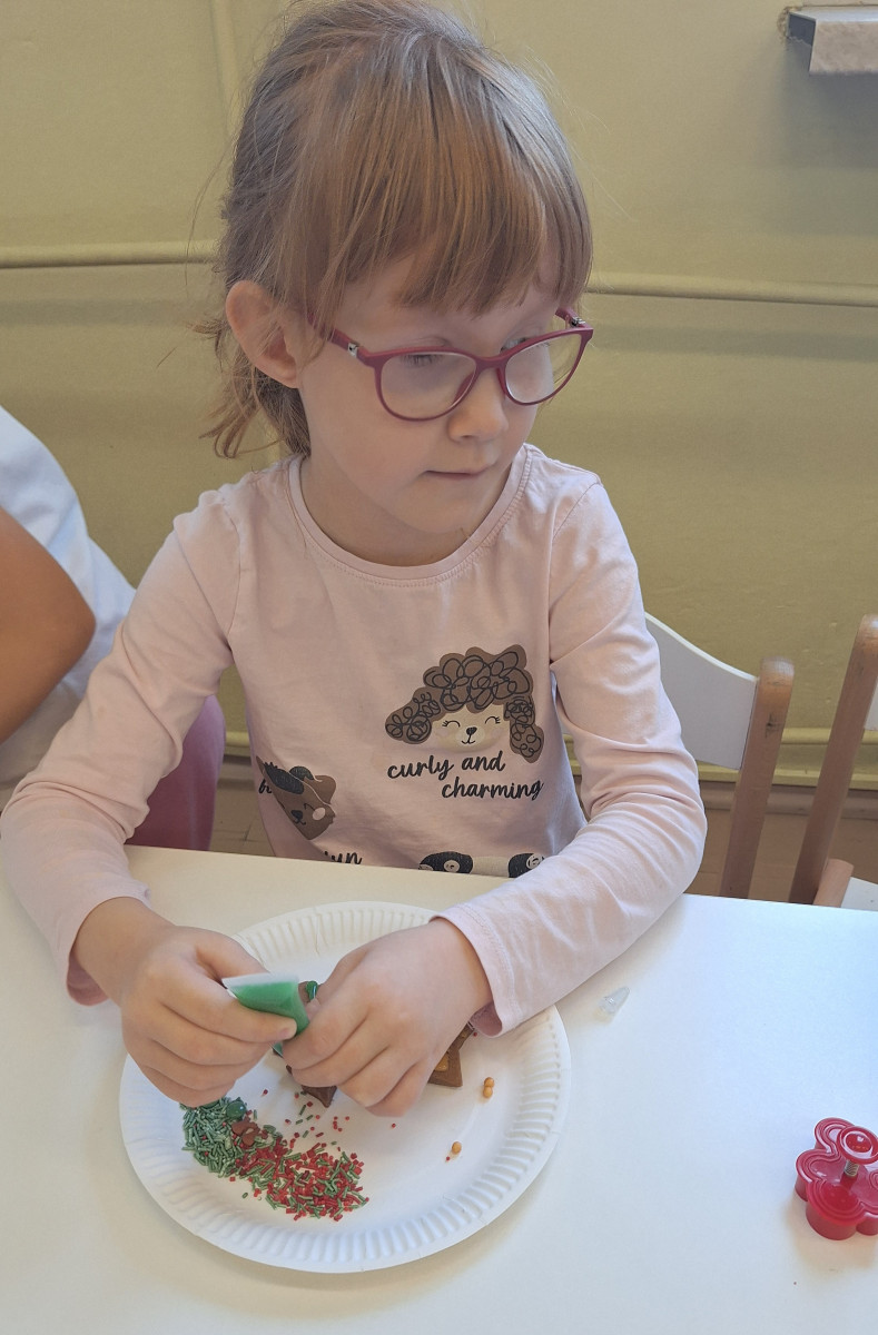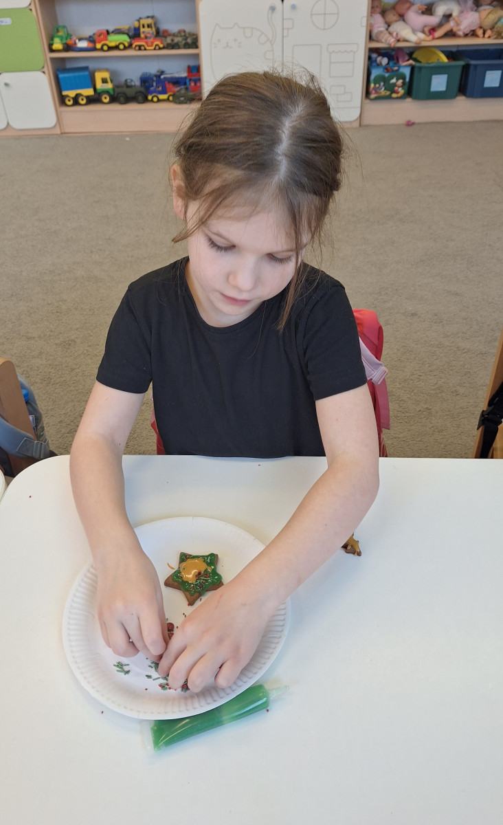 Po tej krótkiej, bardzo interesującej opowieści nadszedł czas na twórczą pracę. Dzieci z ogromnym zaangażowaniem dekorowały swoje pierniczki, a efekty ich pracy prezentowały się wspaniale — kolorowe, pięknie ozdobione i oczywiście bardzo smaczne!