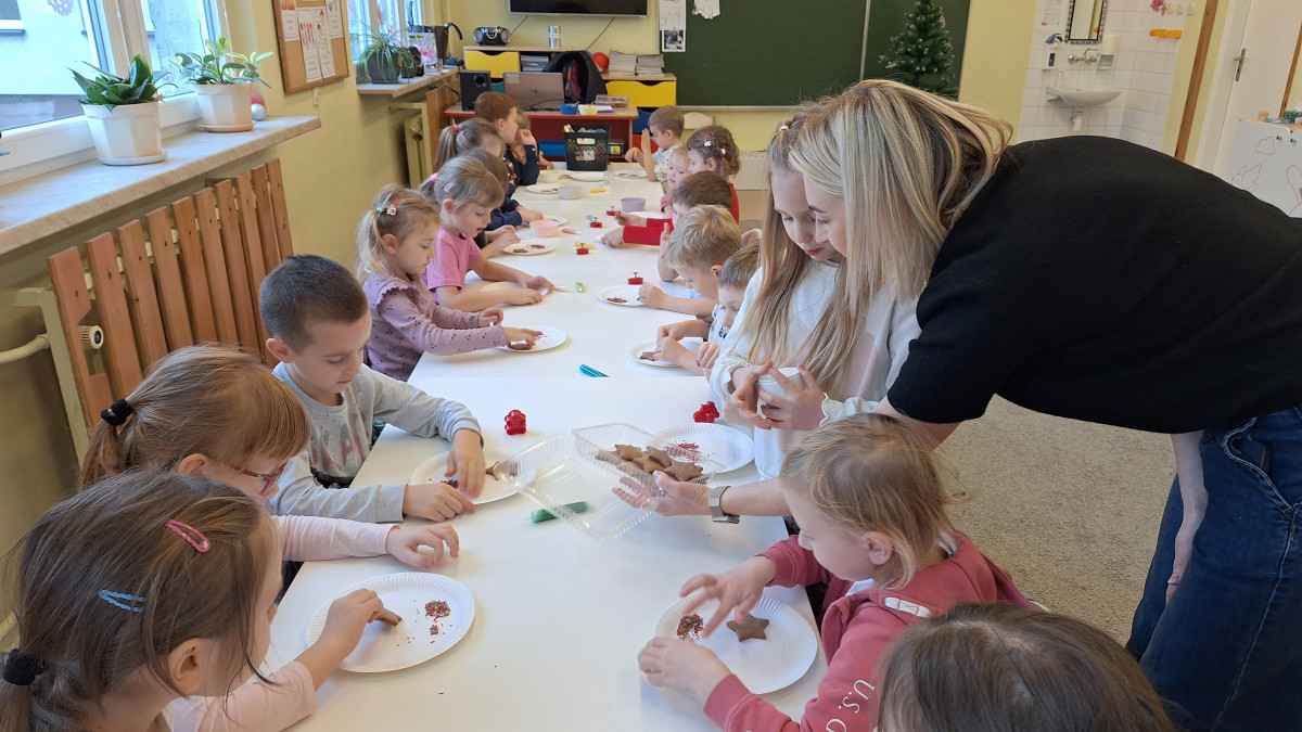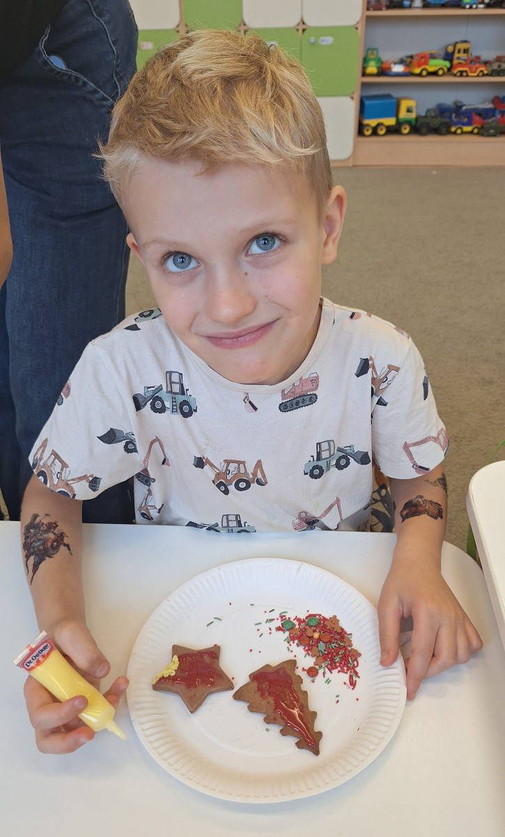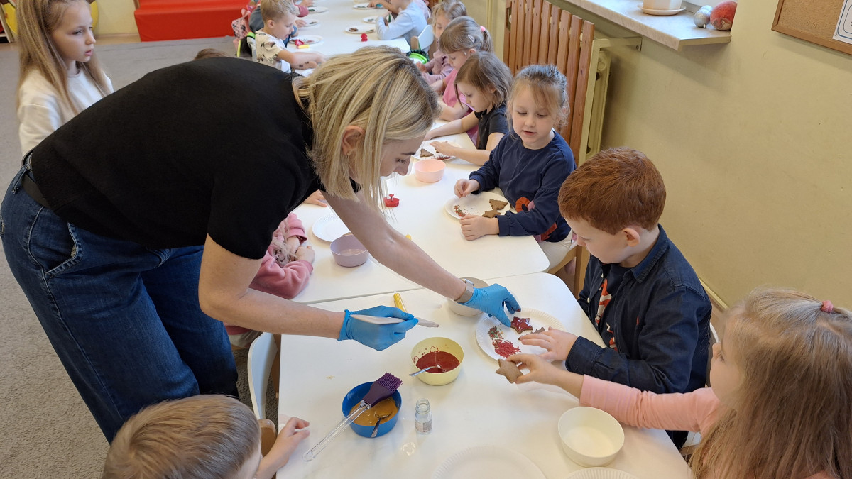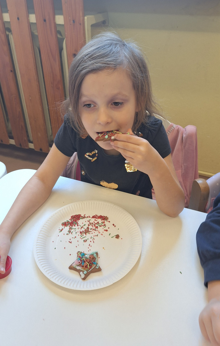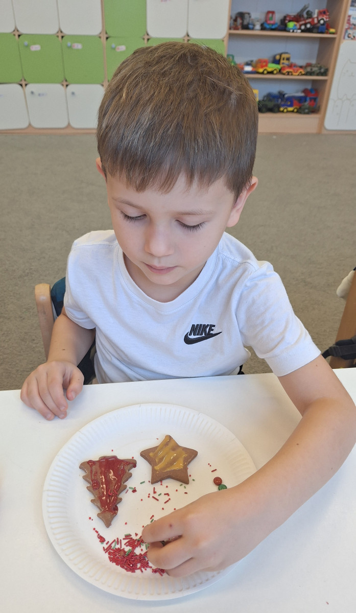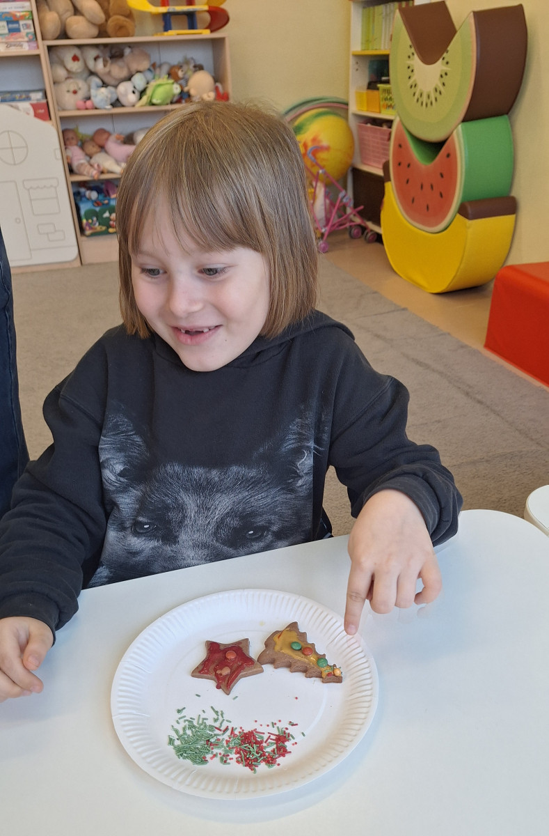 Po tej krótkiej, bardzo interesującej opowieści nadszedł czas na twórczą pracę. Dzieci z ogromnym zaangażowaniem dekorowały swoje pierniczki, a efekty ich pracy prezentowały się wspaniale — kolorowe, pięknie ozdobione i oczywiście bardzo smaczne!