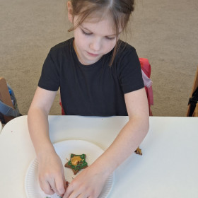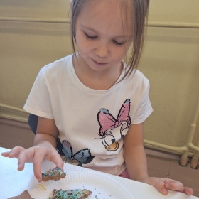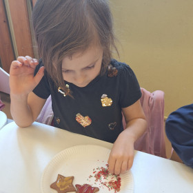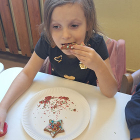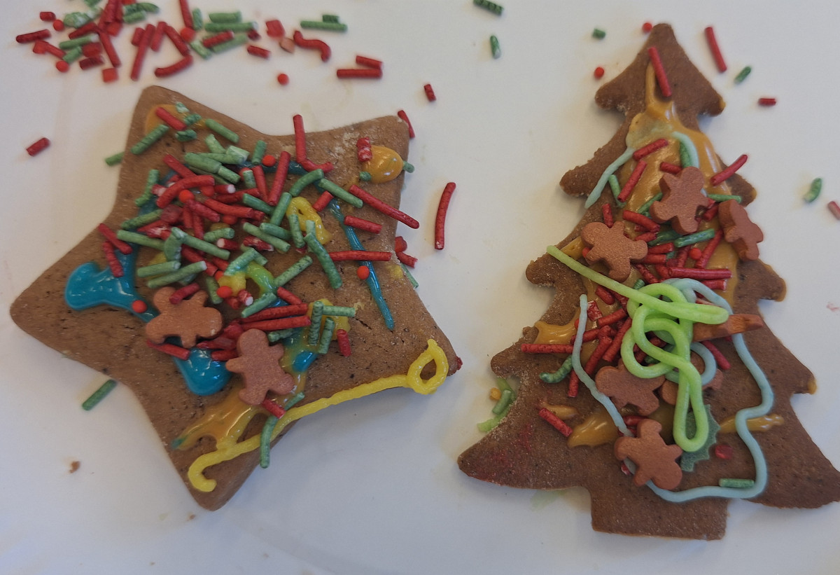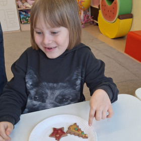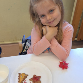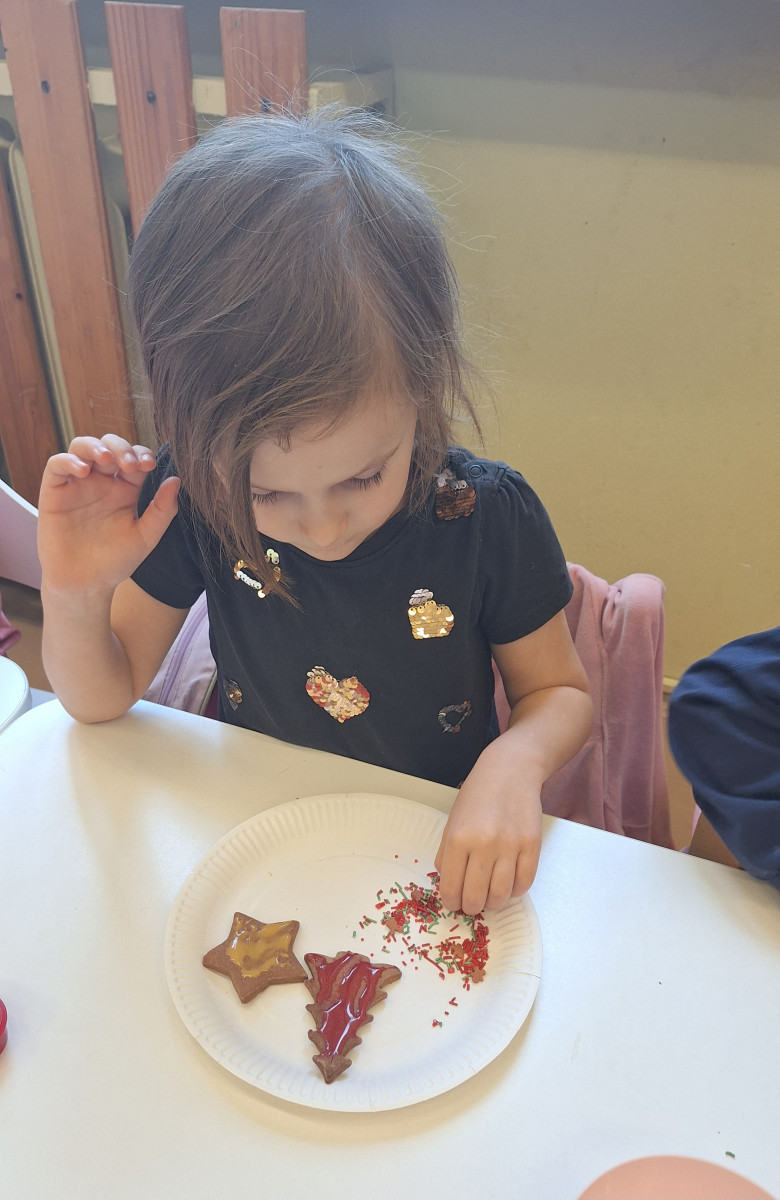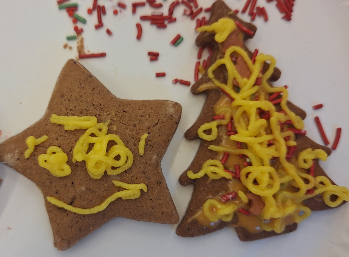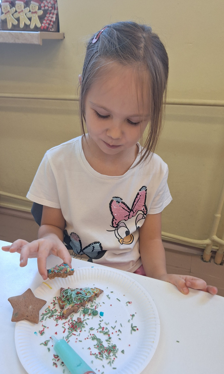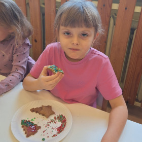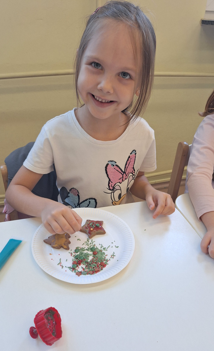 Po tej krótkiej, bardzo interesującej opowieści nadszedł czas na twórczą pracę. Dzieci z ogromnym zaangażowaniem dekorowały swoje pierniczki, a efekty ich pracy prezentowały się wspaniale — kolorowe, pięknie ozdobione i oczywiście bardzo smaczne!