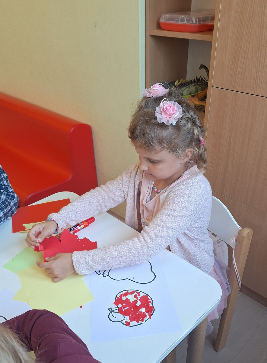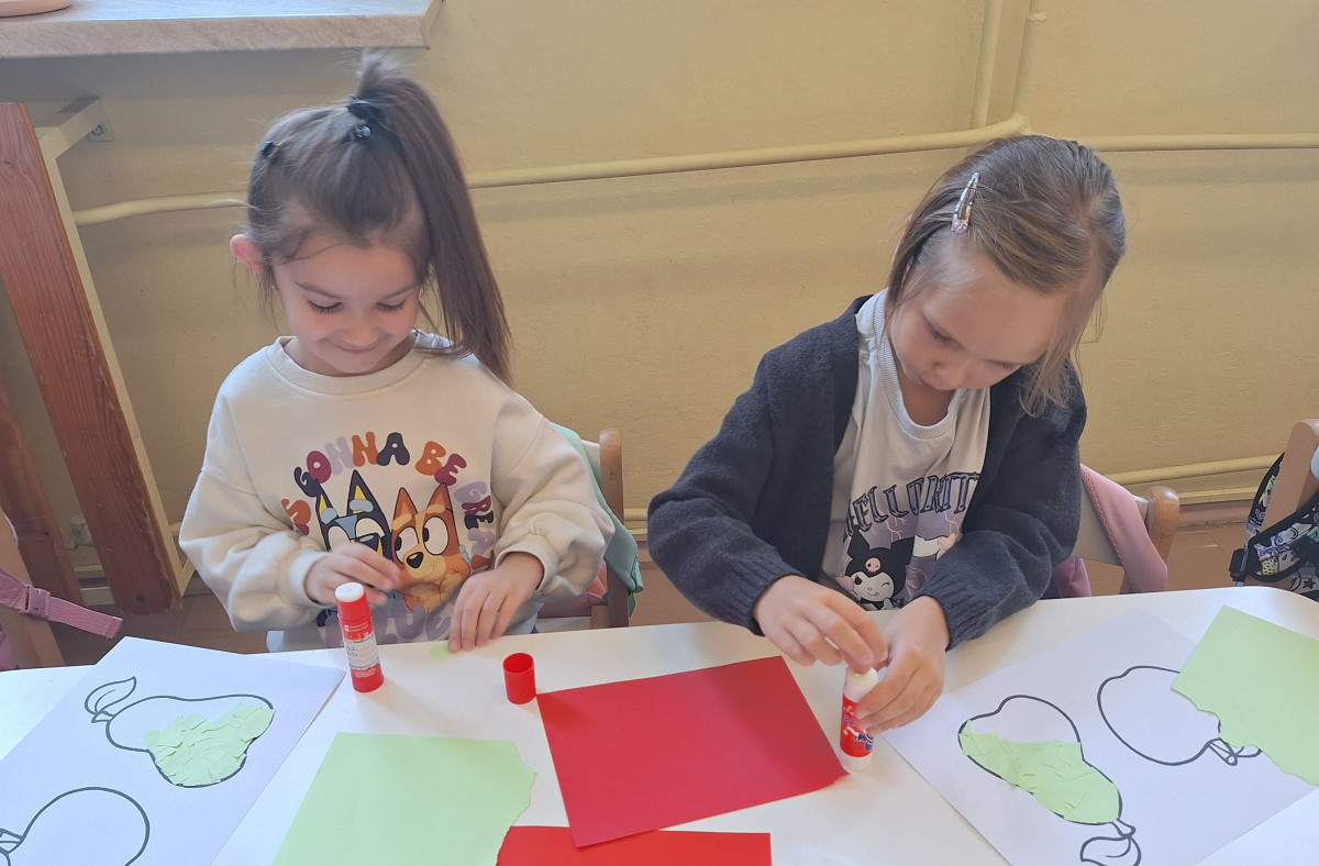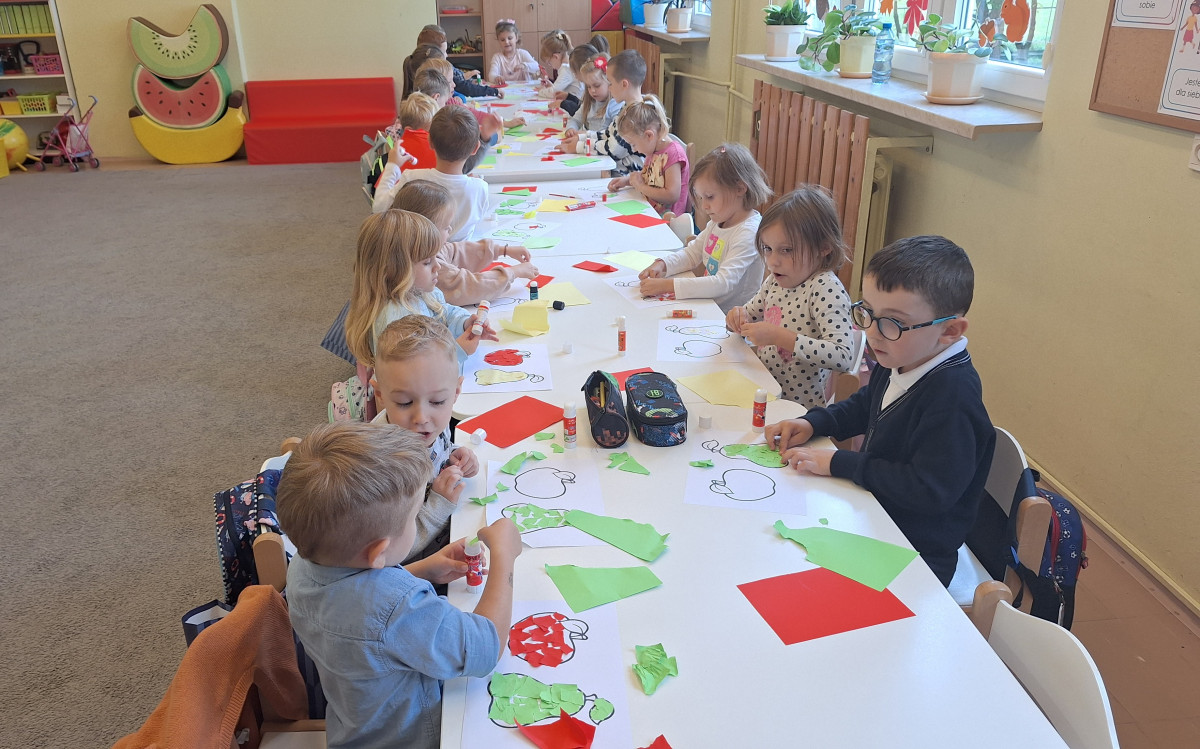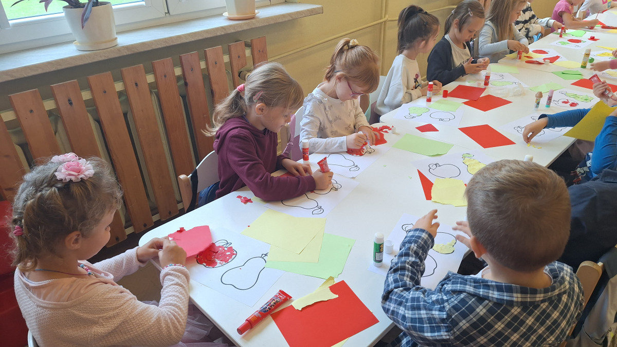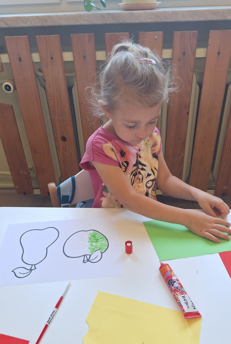 Na zakończenie zajęć wykonaliśmy pracę plastyczną – dzieci z zaangażowaniem tworzyły jabłka i gruszki techniką wydzierania i wyklejania. Powstały barwne prace, które zdobią naszą salę i przypominają wszystkim, że zdrowe jedzenie może być nie tylko smaczne, ale też piękne! 🍐
