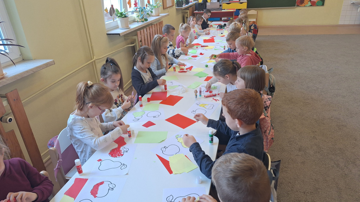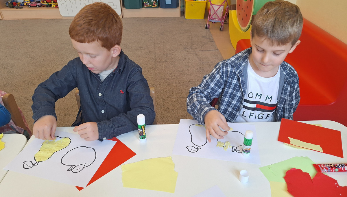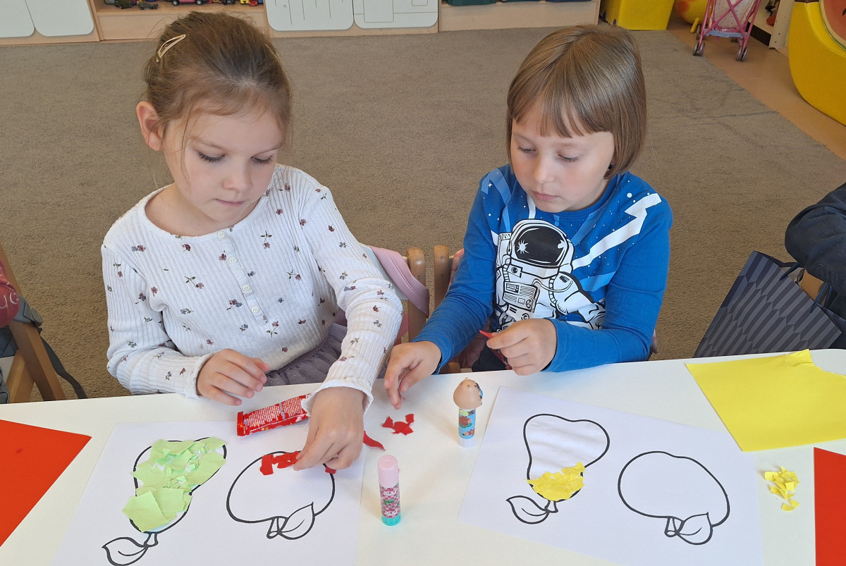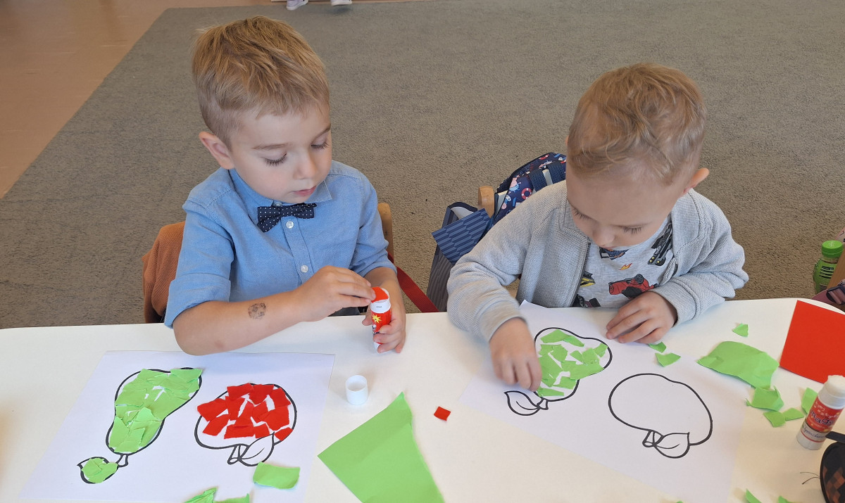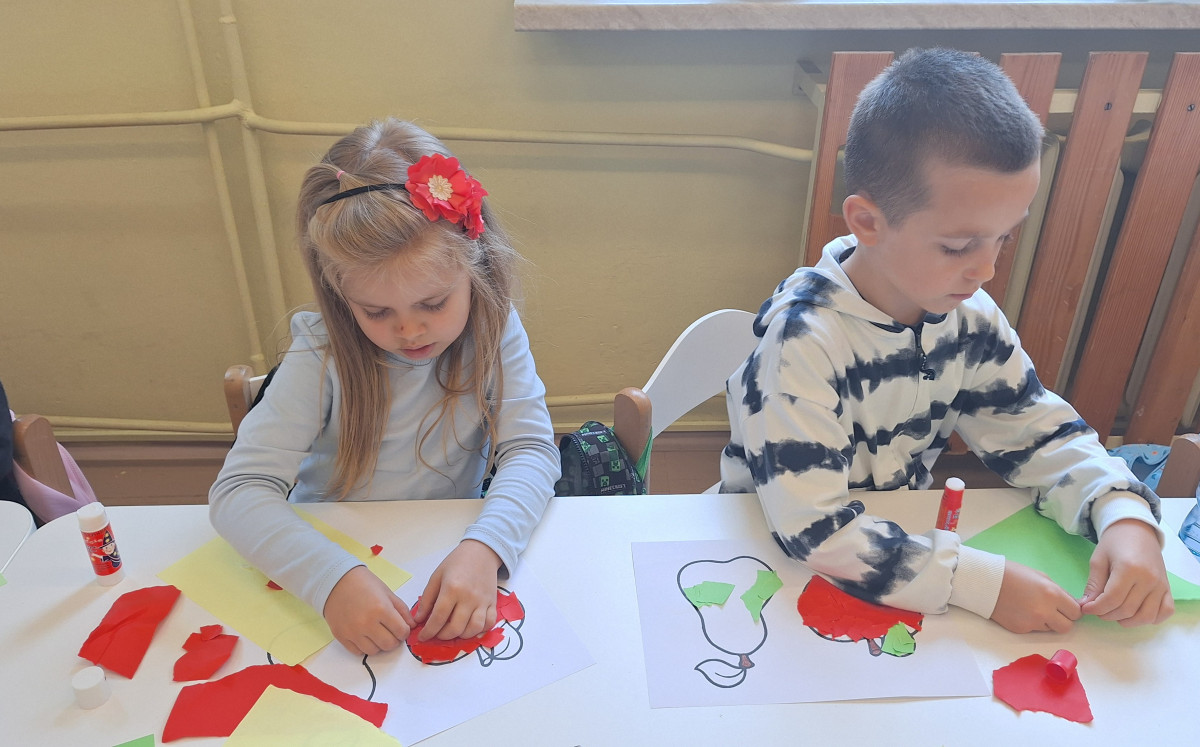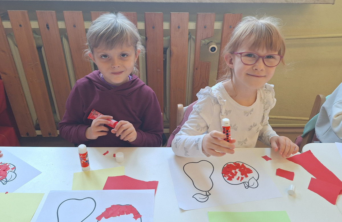 Na zakończenie zajęć wykonaliśmy pracę plastyczną – dzieci z zaangażowaniem tworzyły jabłka i gruszki techniką wydzierania i wyklejania. Powstały barwne prace, które zdobią naszą salę i przypominają wszystkim, że zdrowe jedzenie może być nie tylko smaczne, ale też piękne! 🍐