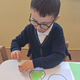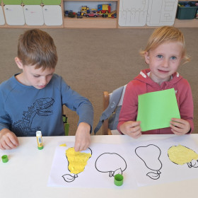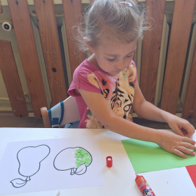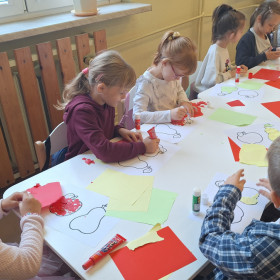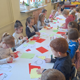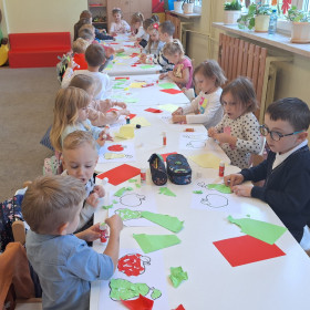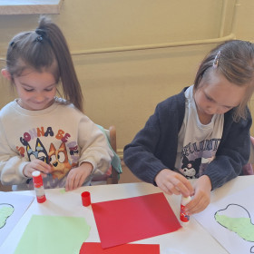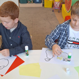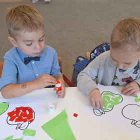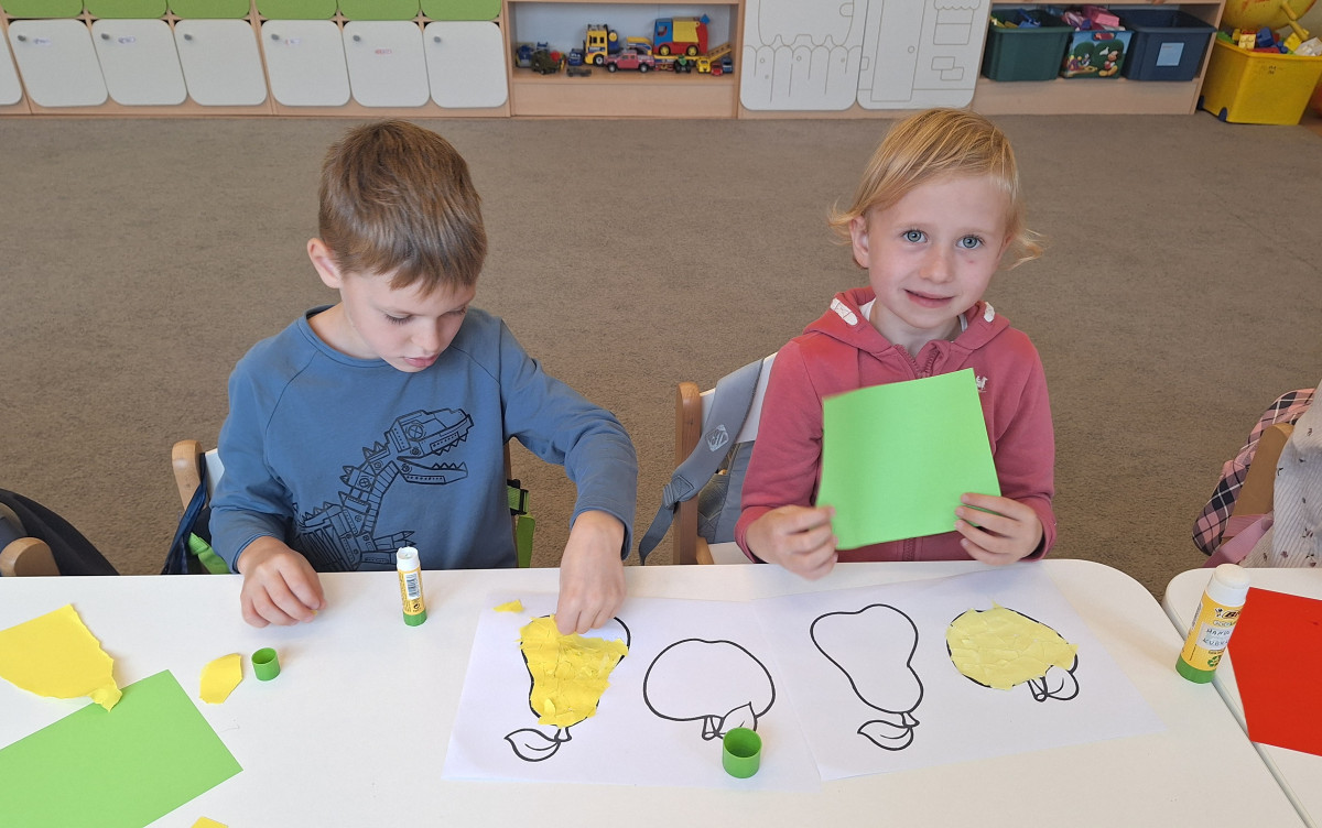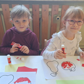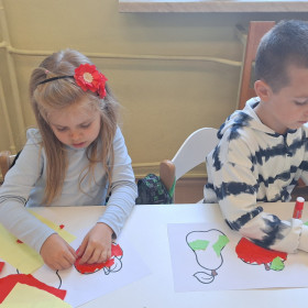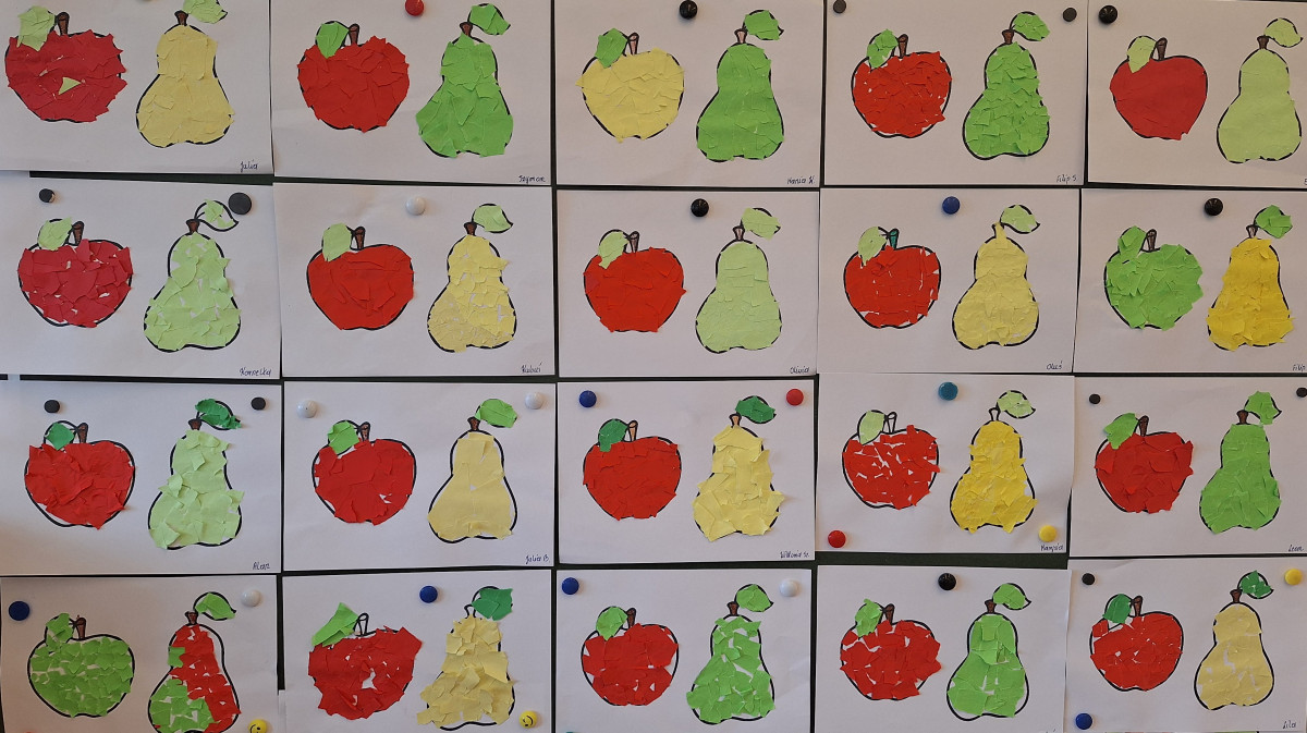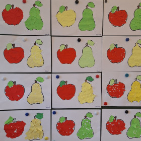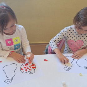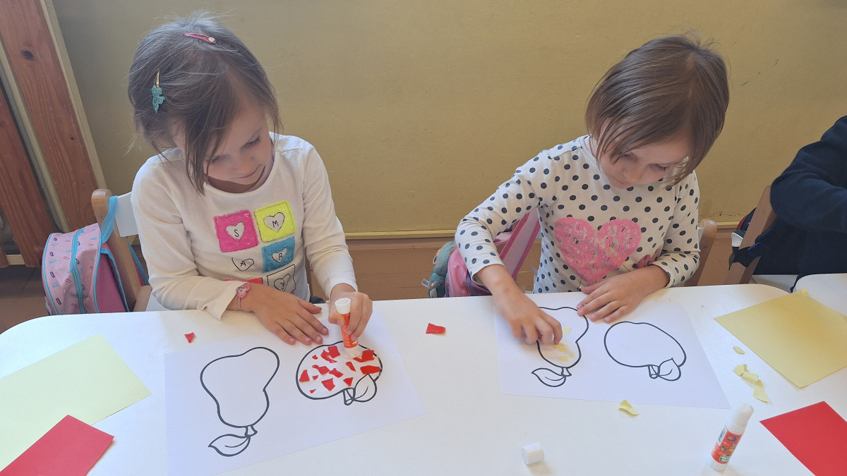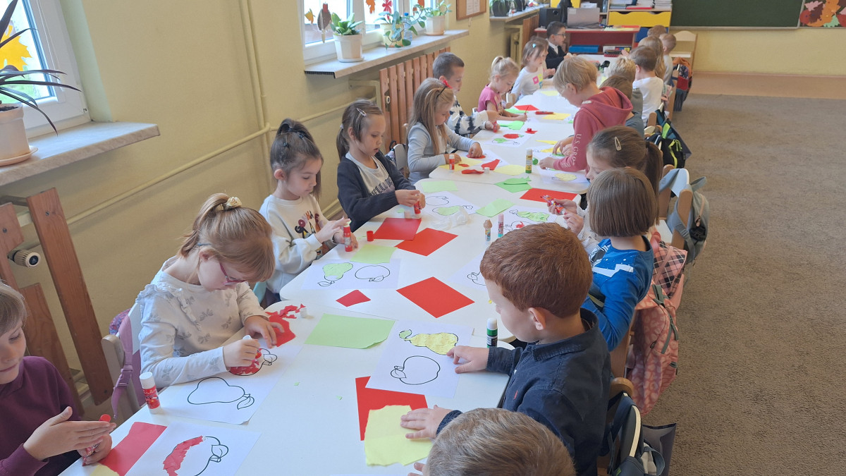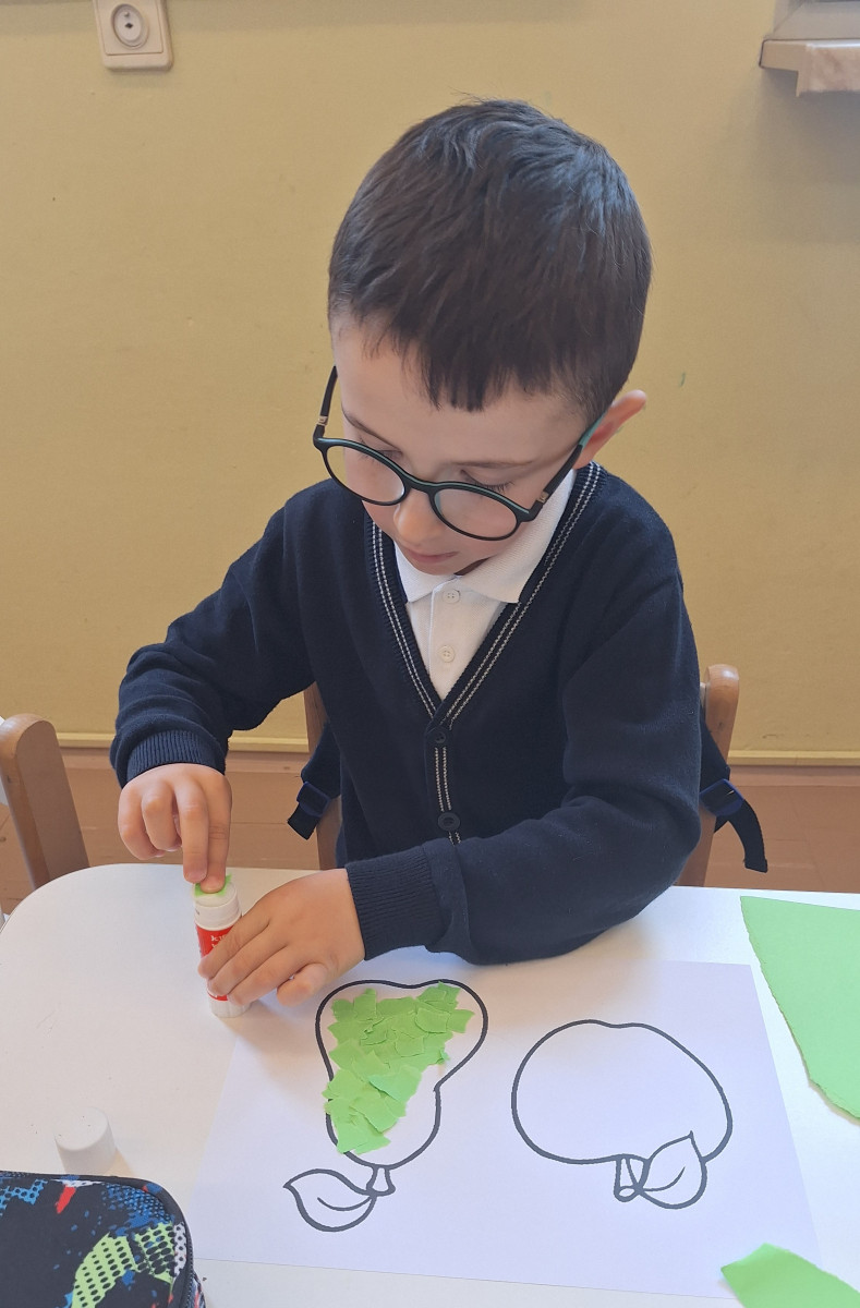 Na zakończenie zajęć wykonaliśmy pracę plastyczną – dzieci z zaangażowaniem tworzyły jabłka i gruszki techniką wydzierania i wyklejania. Powstały barwne prace, które zdobią naszą salę i przypominają wszystkim, że zdrowe jedzenie może być nie tylko smaczne, ale też piękne! 🍐
