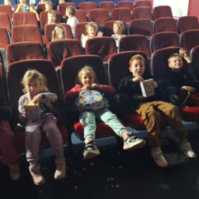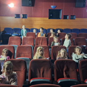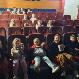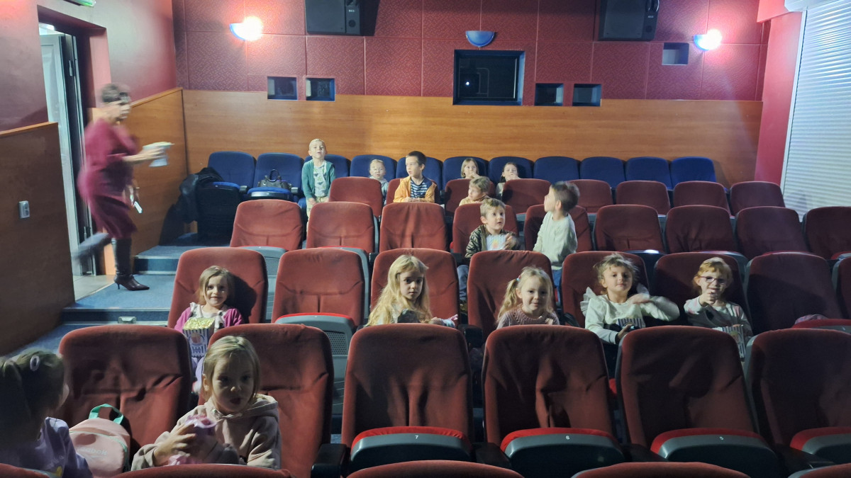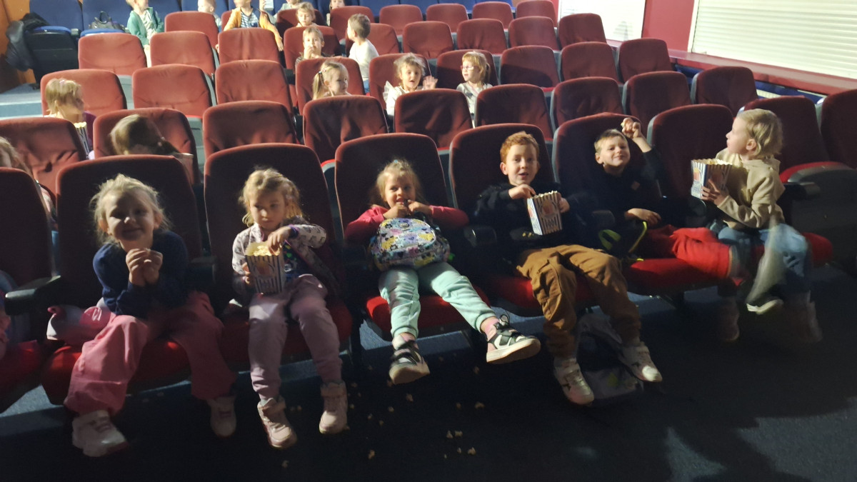 Klasa 0a wybrała się do kina na film Super pies i kot łotr”. To pełna humoru i przygód opowieść o niezwykłym psie, który posiada supermoce i stara się uratować miasto przed sprytnym kotem–łotrem. Bohaterowie muszą zmierzyć się z pułapkami, współpracować i udowodnić, że dobro zawsze wygrywa. Dzieci z ogromnym zainteresowaniem śledziły losy zwierzęcych bohaterów, a cały wyjazd przyniósł im wiele radości.