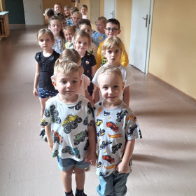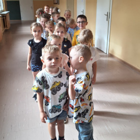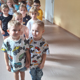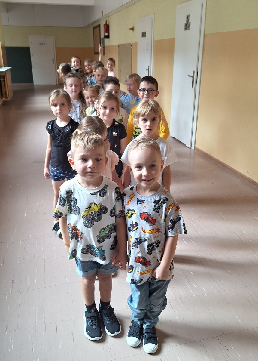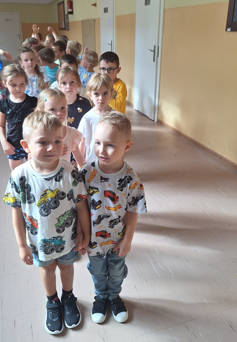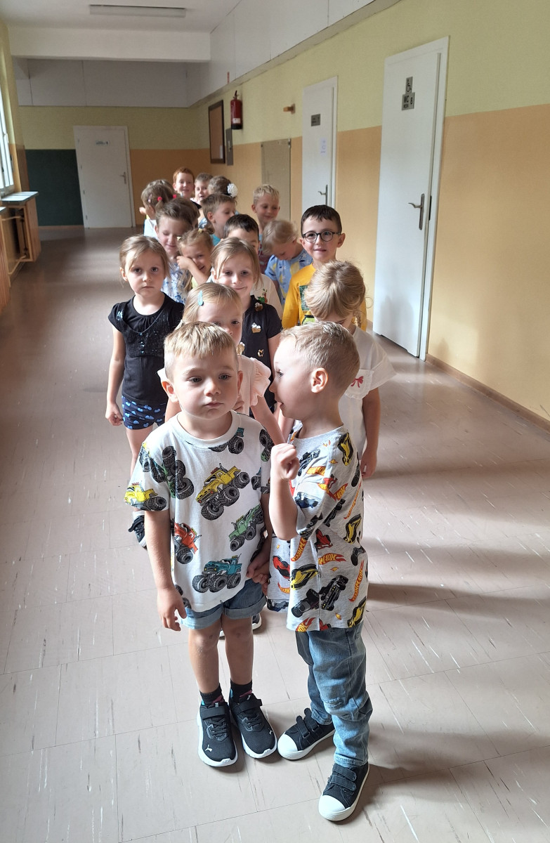 Pierwsze dni w szkole dla uczniów klasy 0a były pełne wrażeń i odkryć! Dla niektórych z naszych maluchów był to pierwszy raz, gdy przekroczyły próg szkoły, dlatego zaczęliśmy od… poznawania jej zakamarków. Razem przemierzyliśmy korytarze, odwiedziliśmy salę gimnastyczną, stołówkę, świetlicę, a nawet wybraliśmy się na piętro, by zobaczyć, gdzie uczą się starsi uczniowie. Dzieci dowiedziały się również, gdzie można znaleźć pielęgniarkę oraz gabinet Pani Dyrektor.