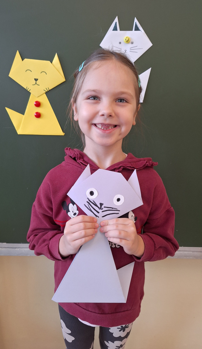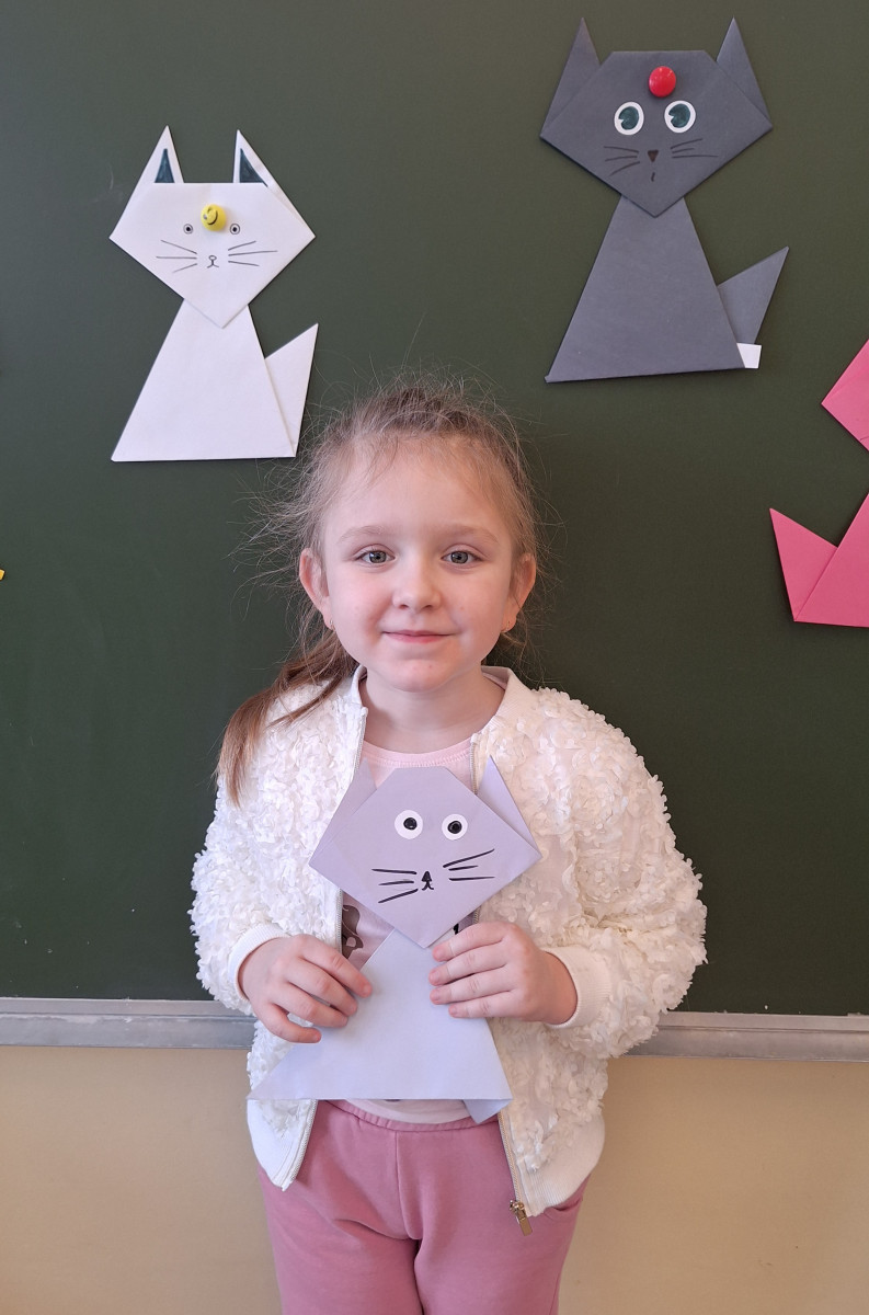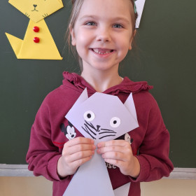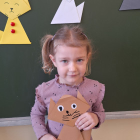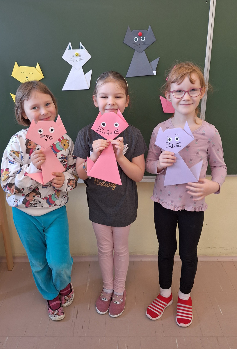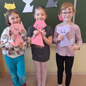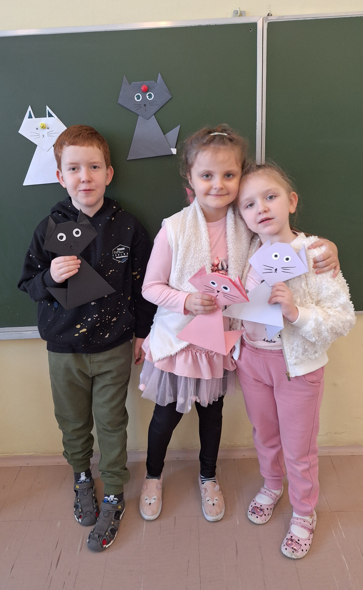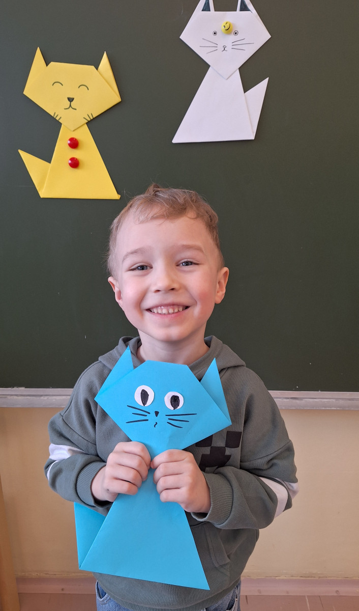 W ramach obchodów nasi mali artyści wykonali piękne prace plastyczne – koty techniką origami, wykazując się przy tym dużą cierpliwością i precyzją. Zwieńczeniem tego "kociego" dnia było wspólne wysłuchanie ponadczasowej bajki o „Kocie w butach”, która dostarczyła wszystkim mnóstwo radości.
