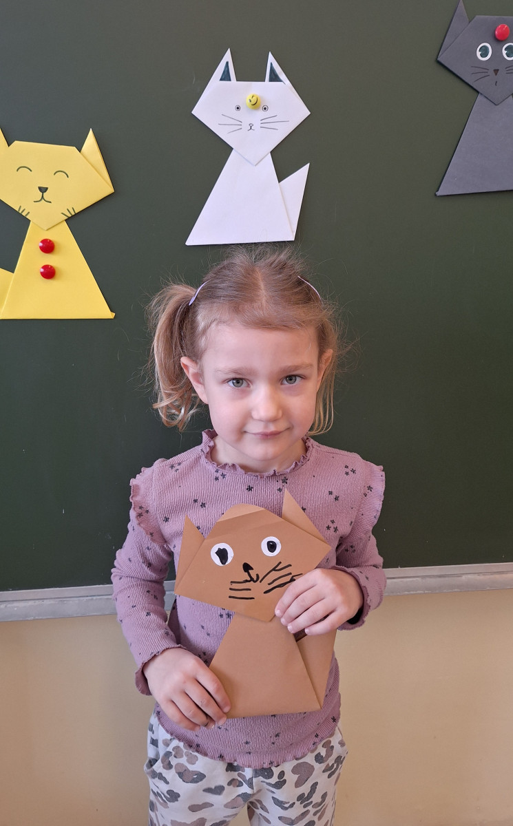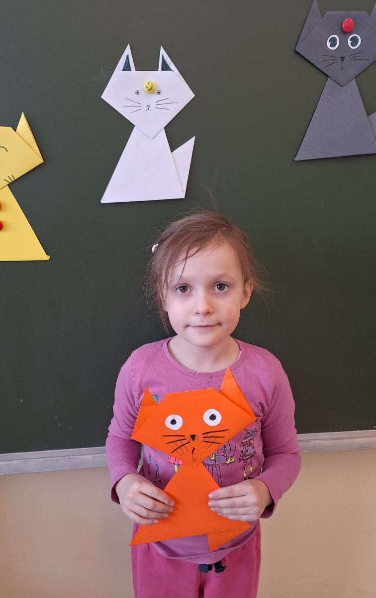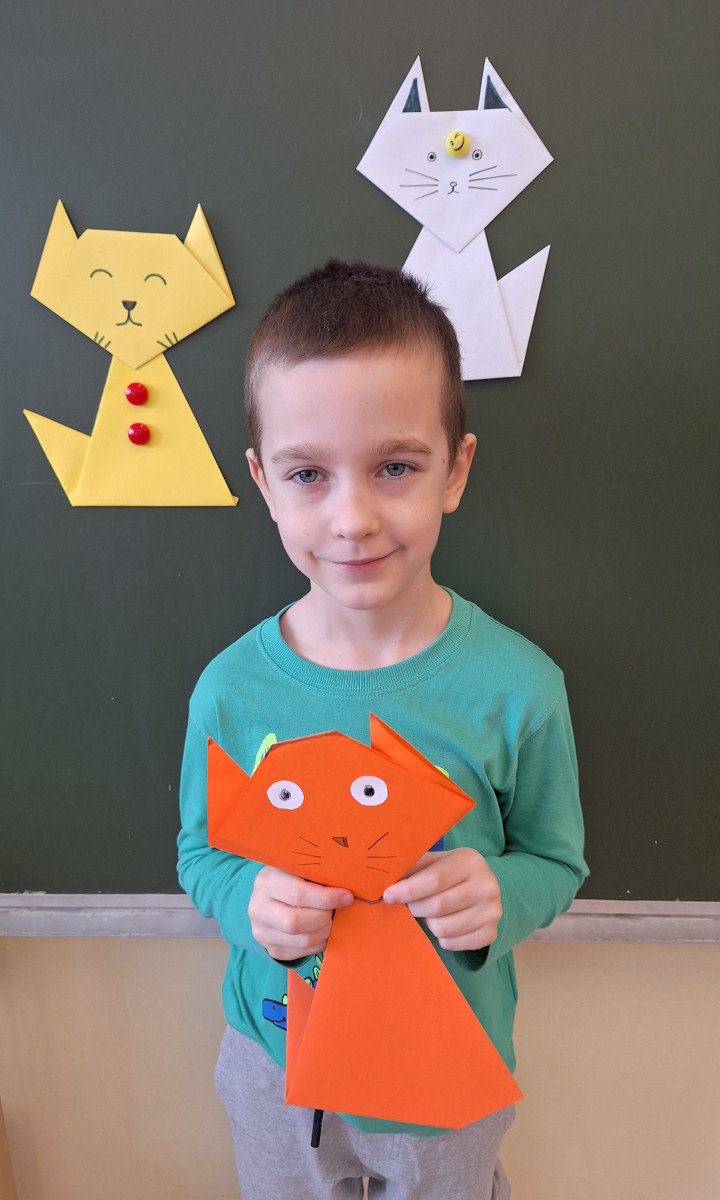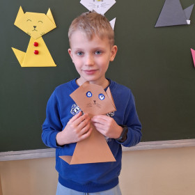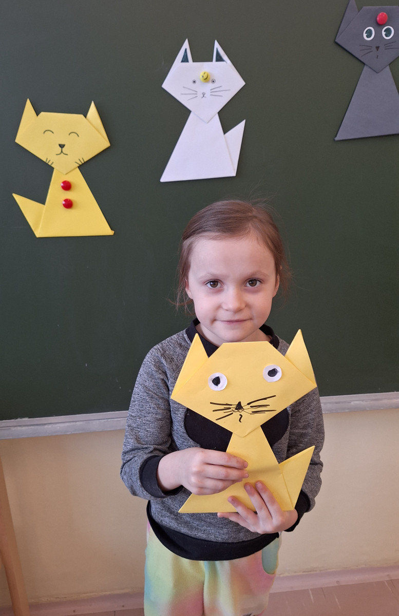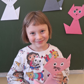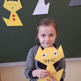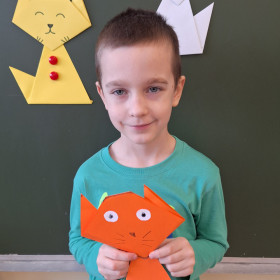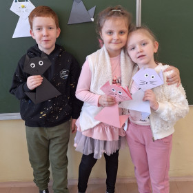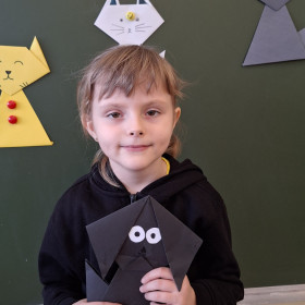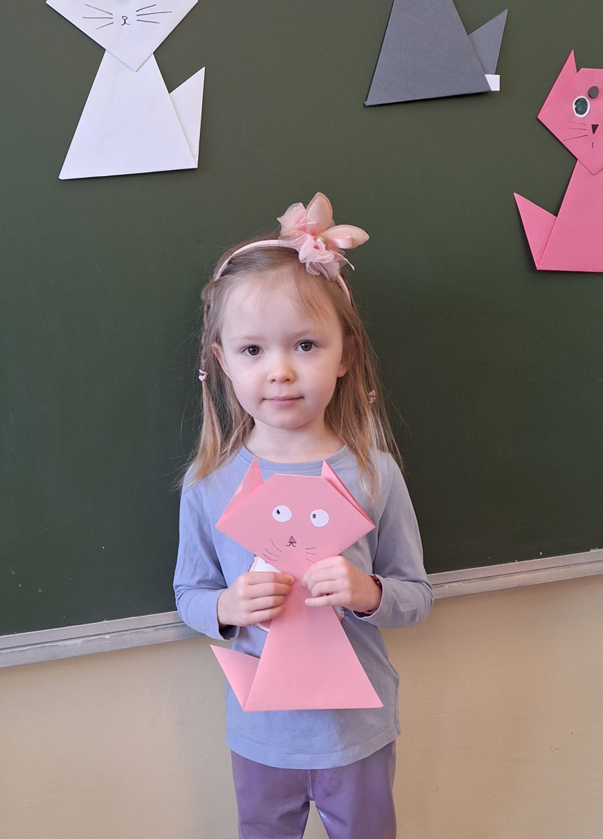 W ramach obchodów nasi mali artyści wykonali piękne prace plastyczne – koty techniką origami, wykazując się przy tym dużą cierpliwością i precyzją. Zwieńczeniem tego "kociego" dnia było wspólne wysłuchanie ponadczasowej bajki o „Kocie w butach”, która dostarczyła wszystkim mnóstwo radości.