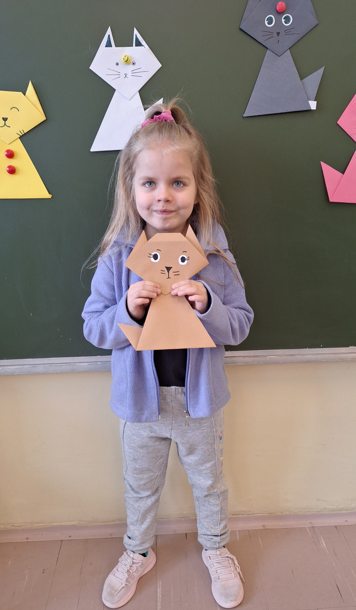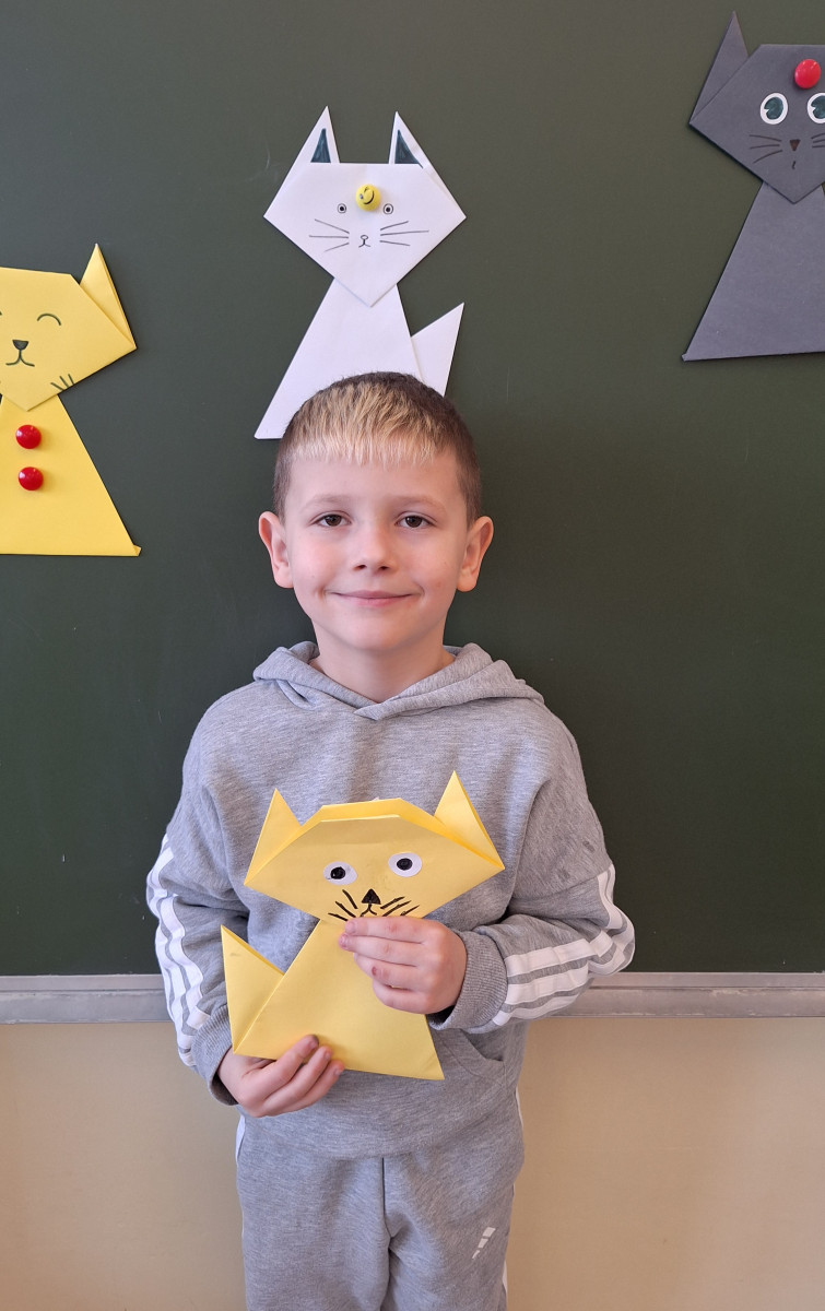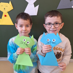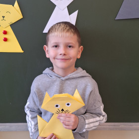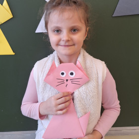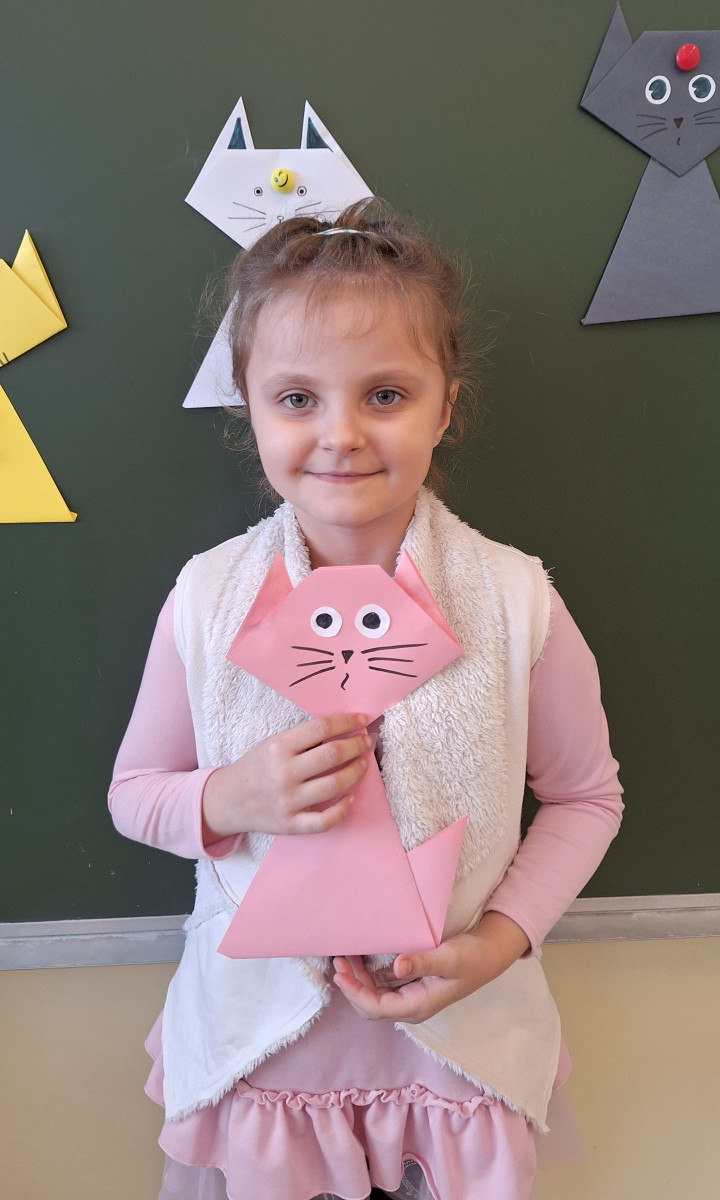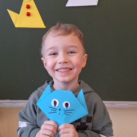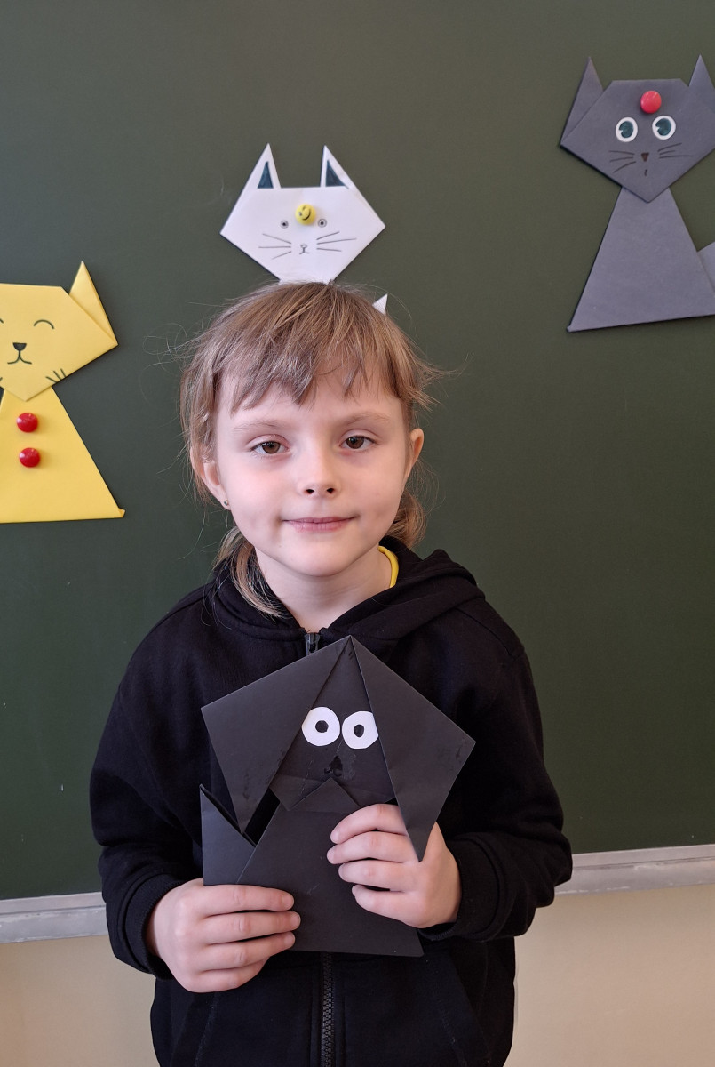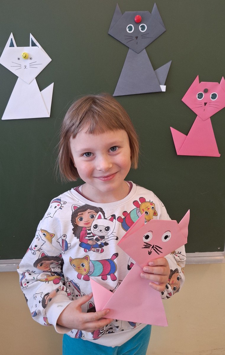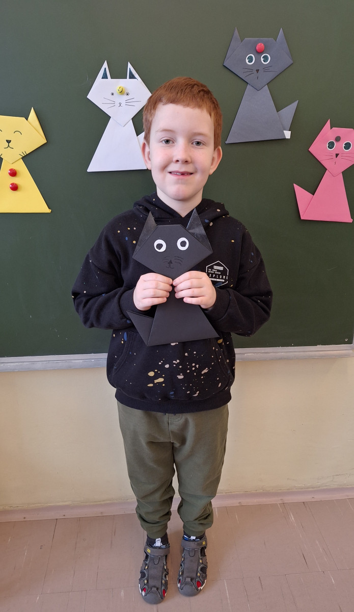 W ramach obchodów nasi mali artyści wykonali piękne prace plastyczne – koty techniką origami, wykazując się przy tym dużą cierpliwością i precyzją. Zwieńczeniem tego "kociego" dnia było wspólne wysłuchanie ponadczasowej bajki o „Kocie w butach”, która dostarczyła wszystkim mnóstwo radości.
