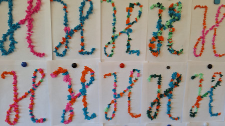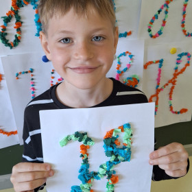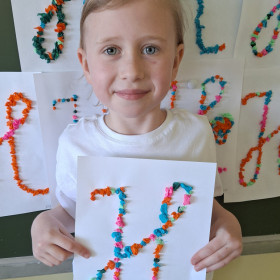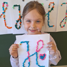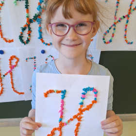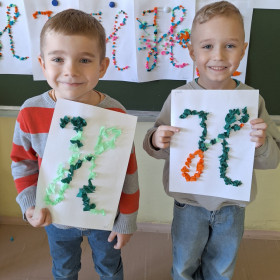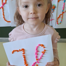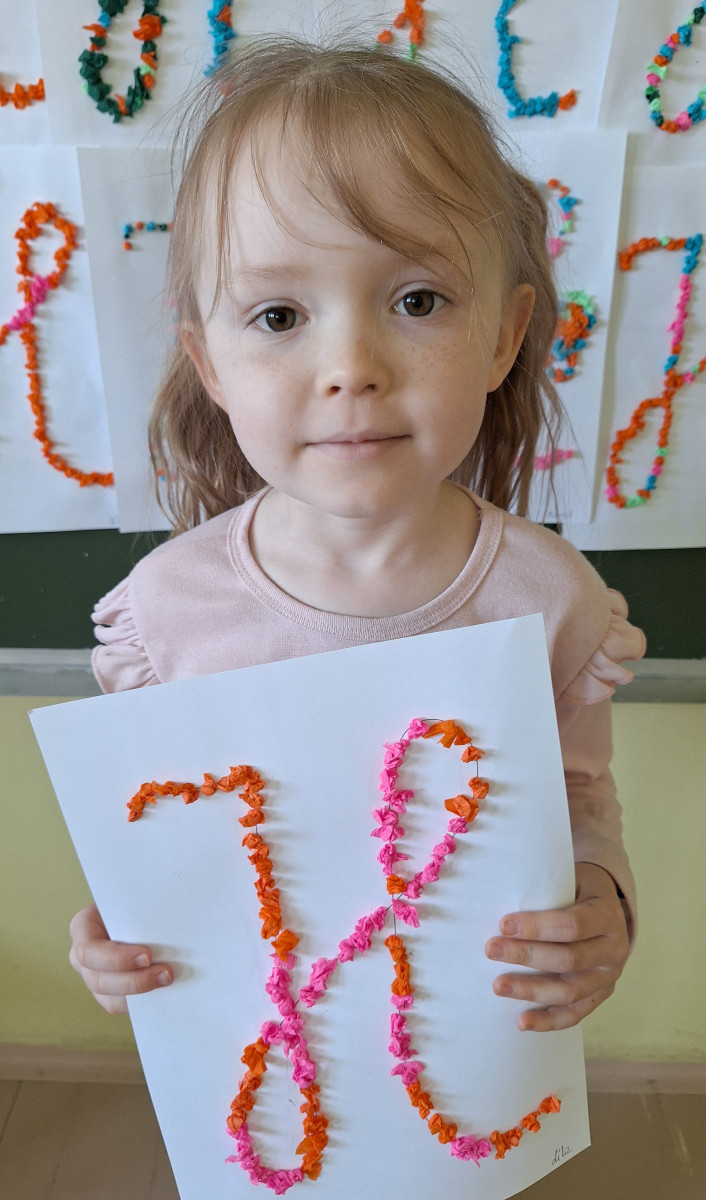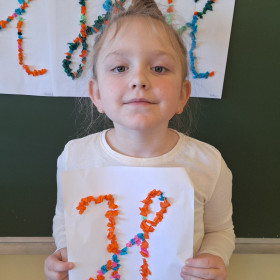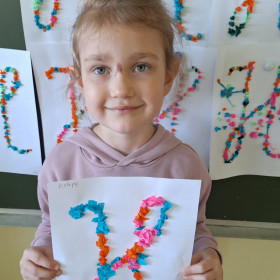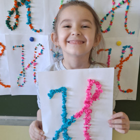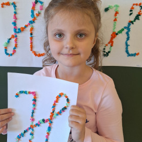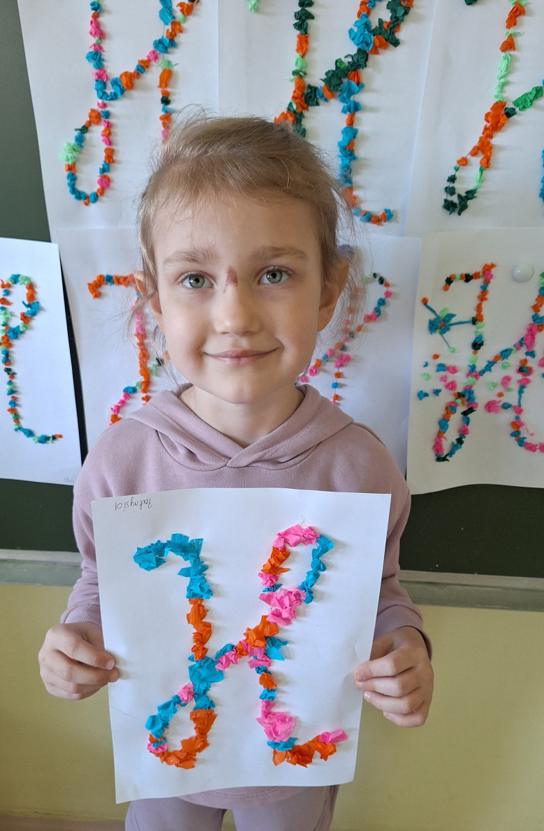 Podczas zajęć przedszkolaki utrwalały znajomość nowej litery, wyklejając jej kontury kolorowymi kuleczkami. Ta kreatywna forma pracy nie tylko pomogła w zapamiętaniu kształtu litery, ale również sprawiła dzieciom wiele radości.