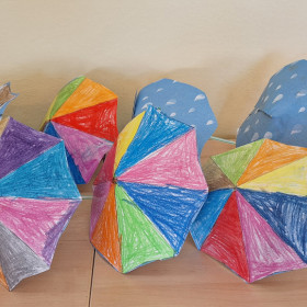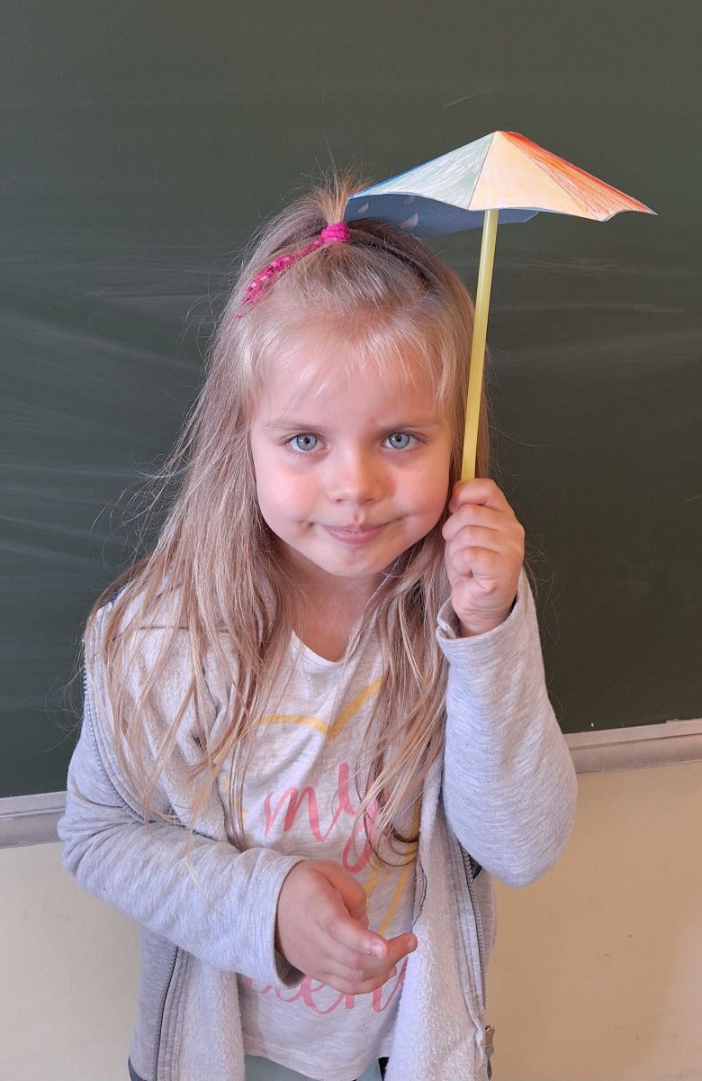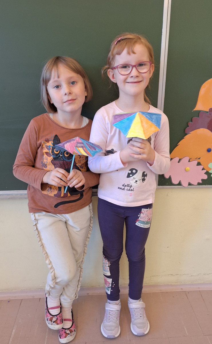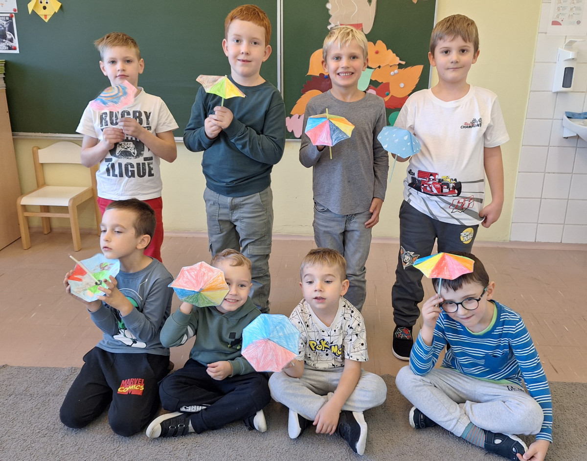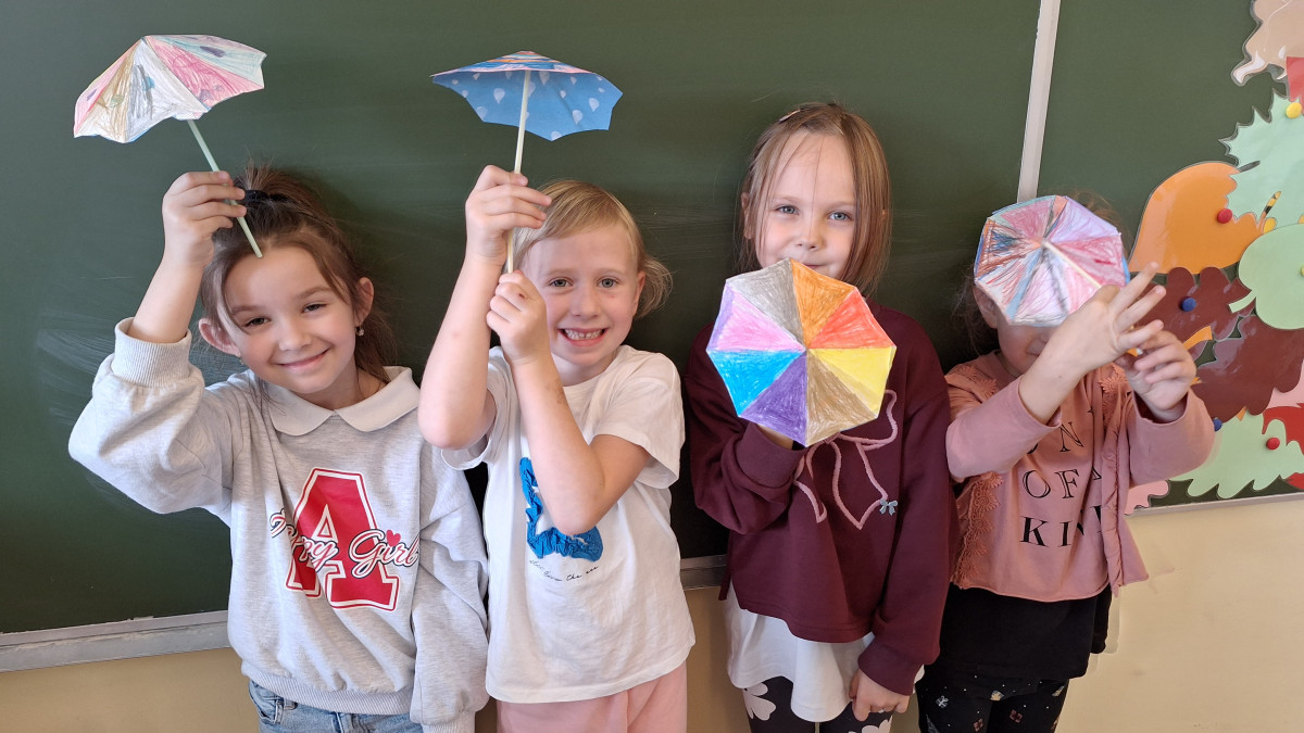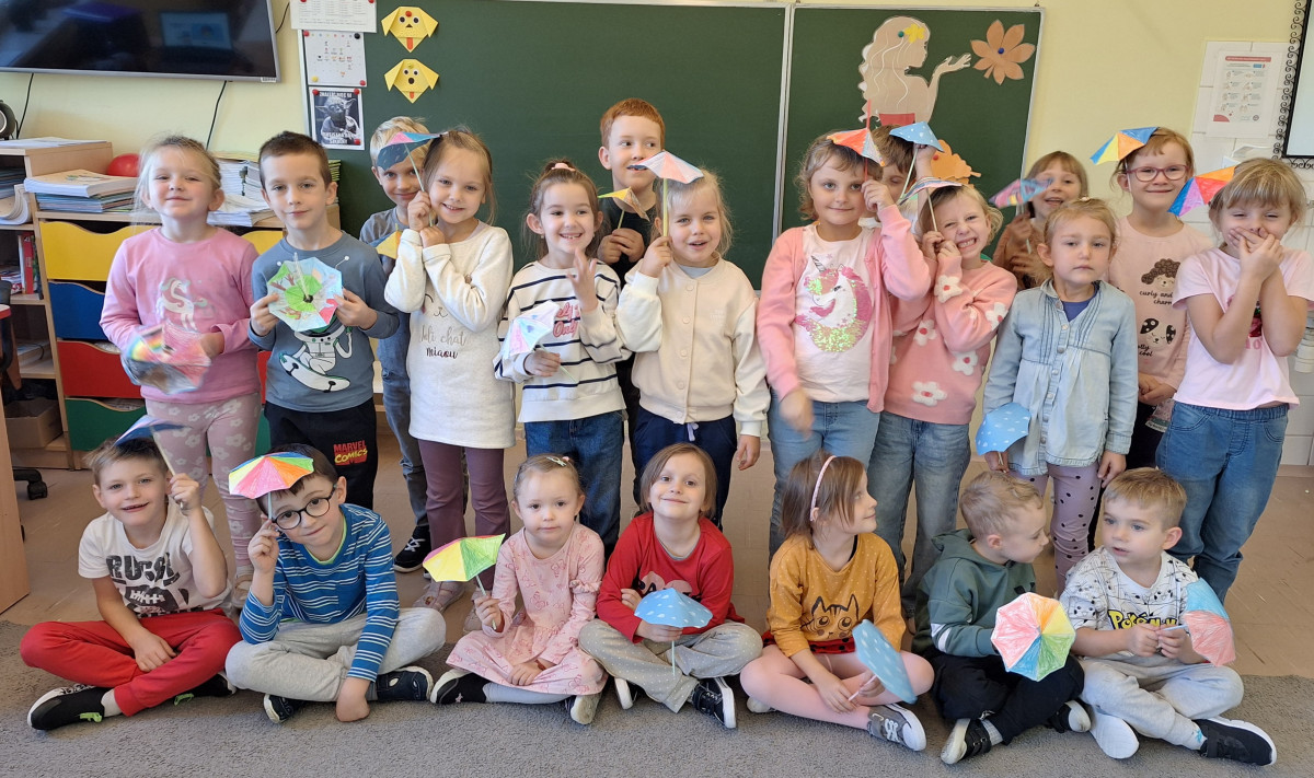 Parasol - niezbędny przedmiot podczas deszczowej pogody – chroni nas przed kroplami deszczu i pozwala cieszyć się spacerem nawet wtedy, gdy za oknem szaro i mokro. Dzieci z klasy 0a postanowiły przenieść ten jesienny nastrój do swojej sali i podczas zajęć plastycznych wykonały kolorowe parasolki.