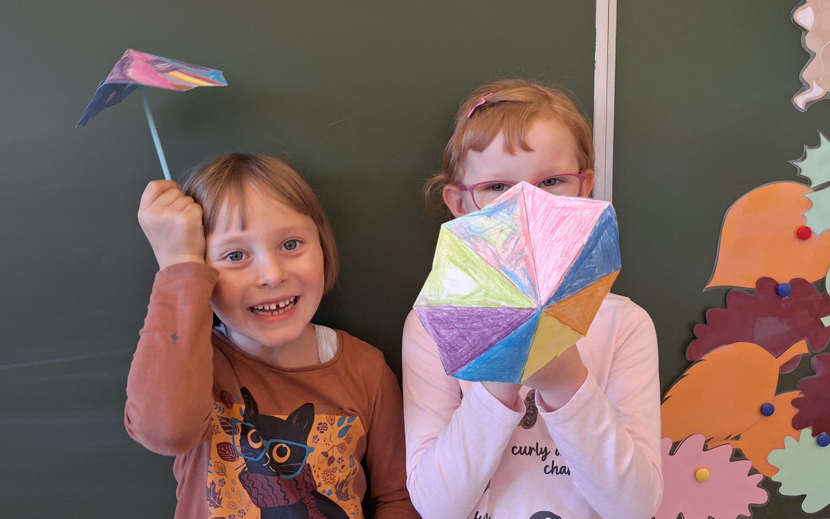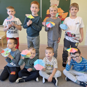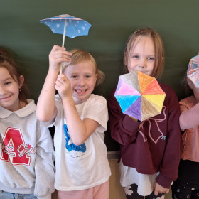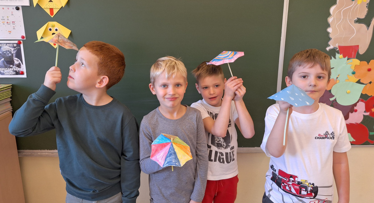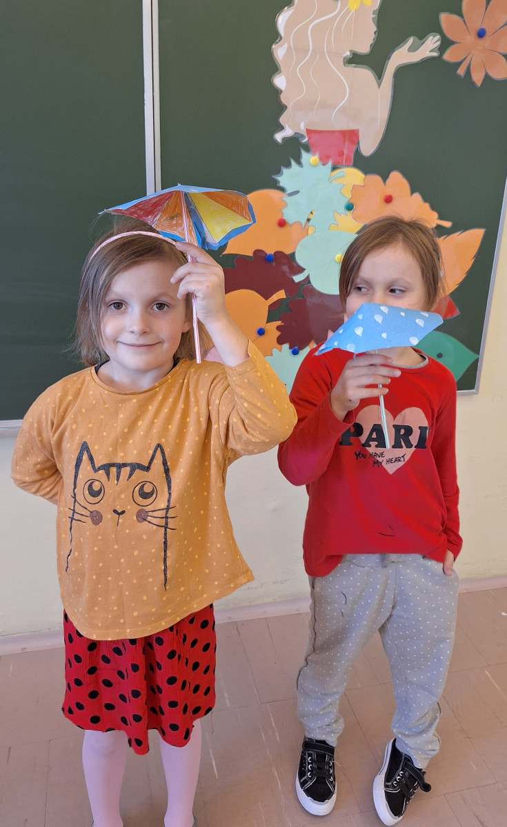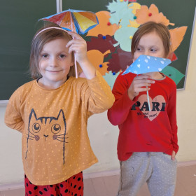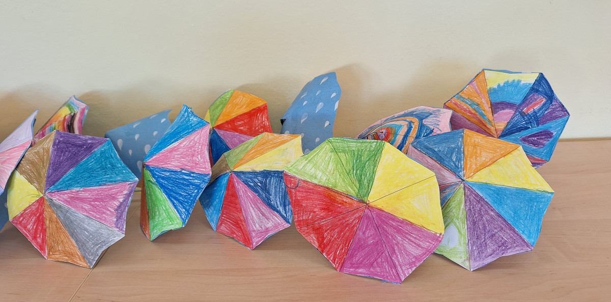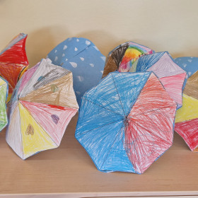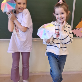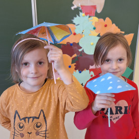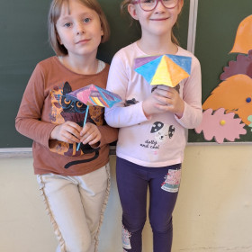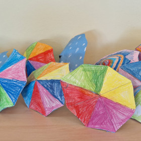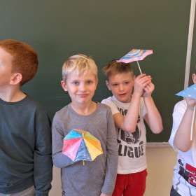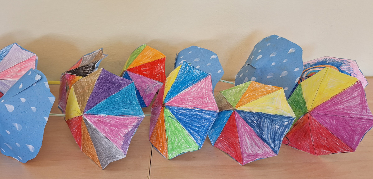 Parasol - niezbędny przedmiot podczas deszczowej pogody – chroni nas przed kroplami deszczu i pozwala cieszyć się spacerem nawet wtedy, gdy za oknem szaro i mokro. Dzieci z klasy 0a postanowiły przenieść ten jesienny nastrój do swojej sali i podczas zajęć plastycznych wykonały kolorowe parasolki.