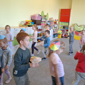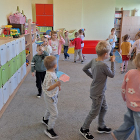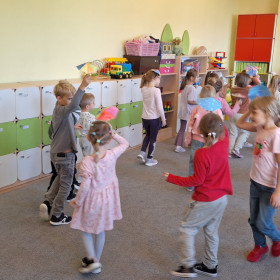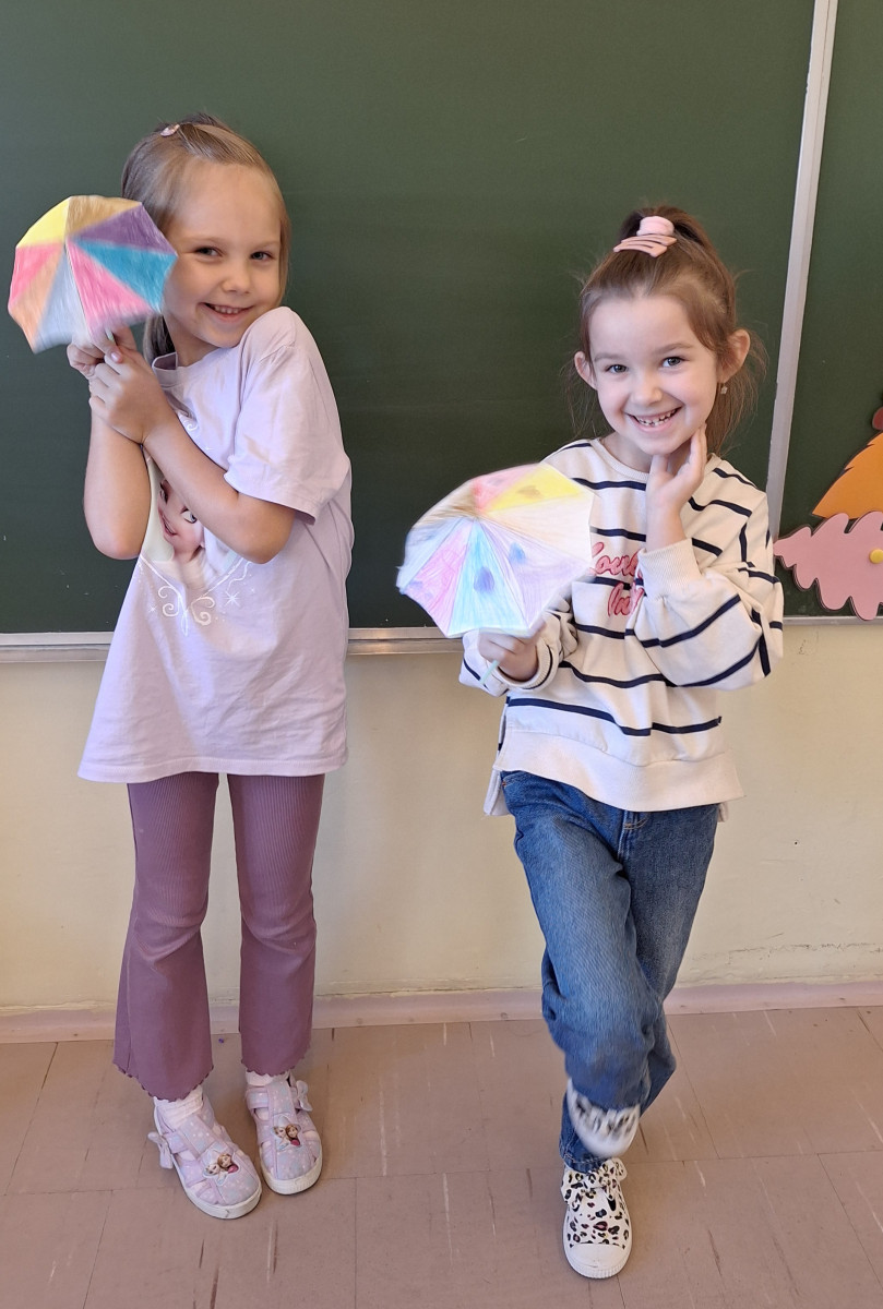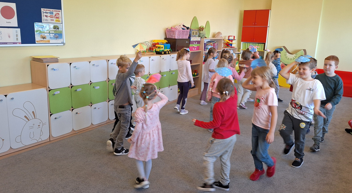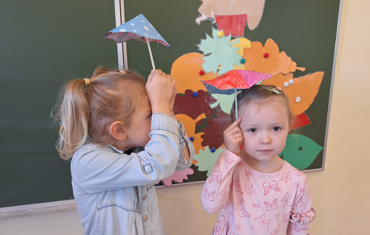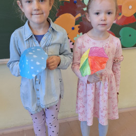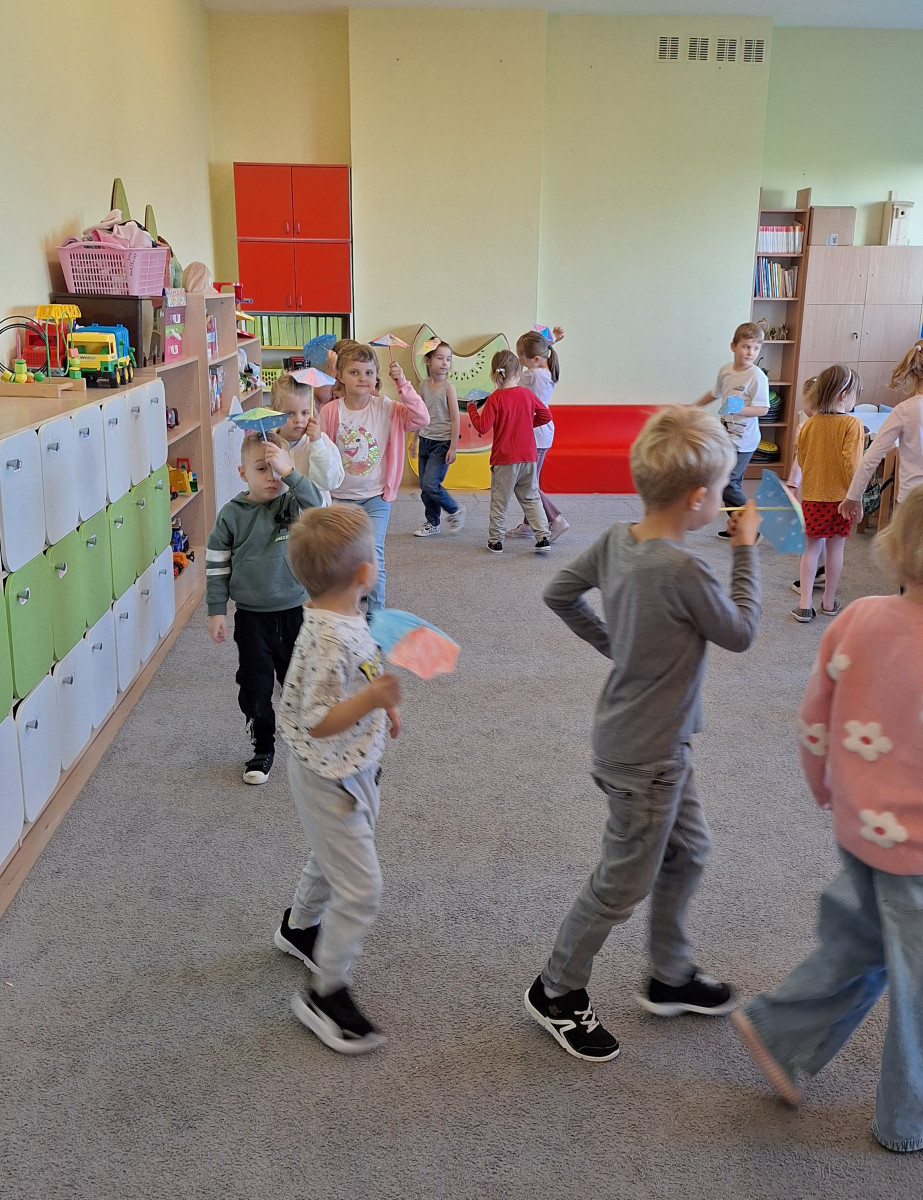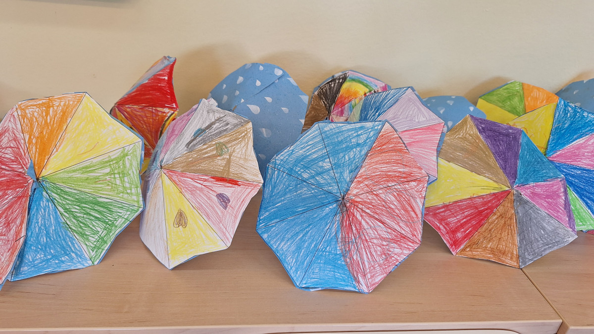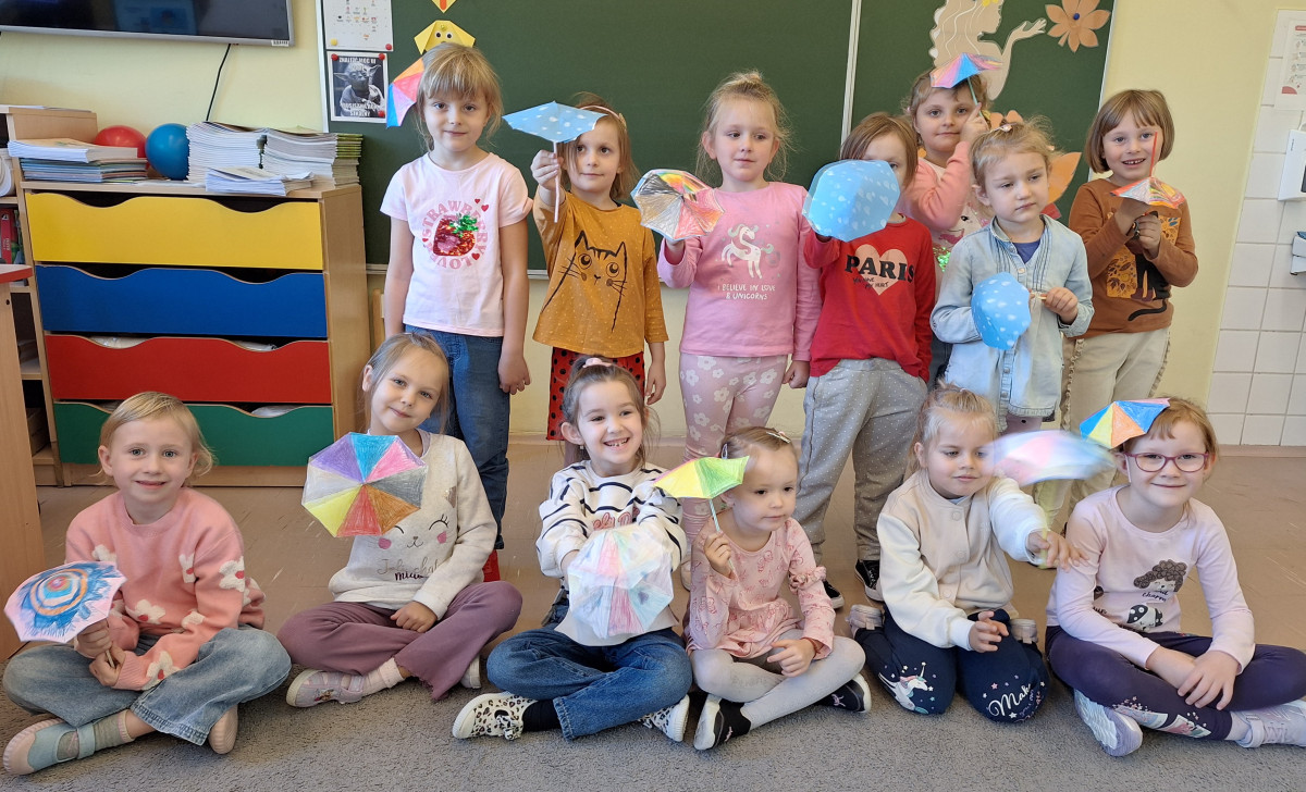 Każdy przedszkolak wykonał swój własny parasol. Prace były nie tylko piękne, ale też stały się inspiracją do wspólnej zabawy z piosenką „Kap, kap, kap deszczyk z nieba pada”. W rytmie muzyki dzieci wcielały się w rolę małych parasolek tańczących w deszczu. ☂️