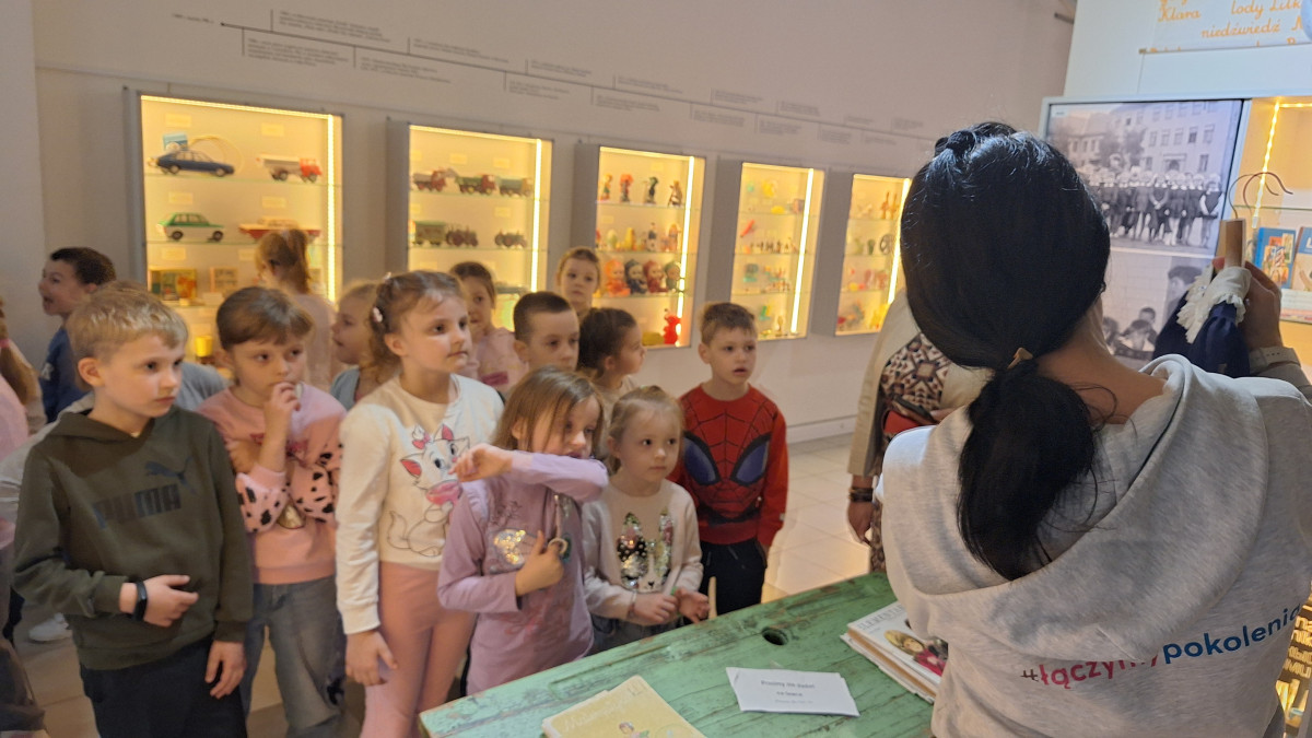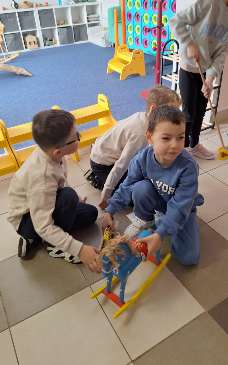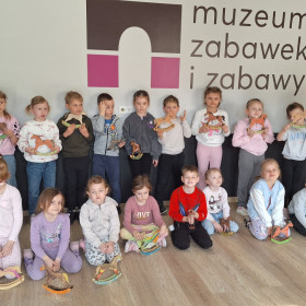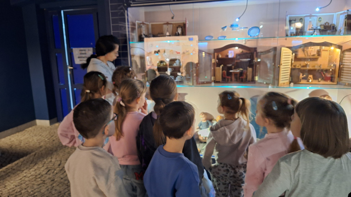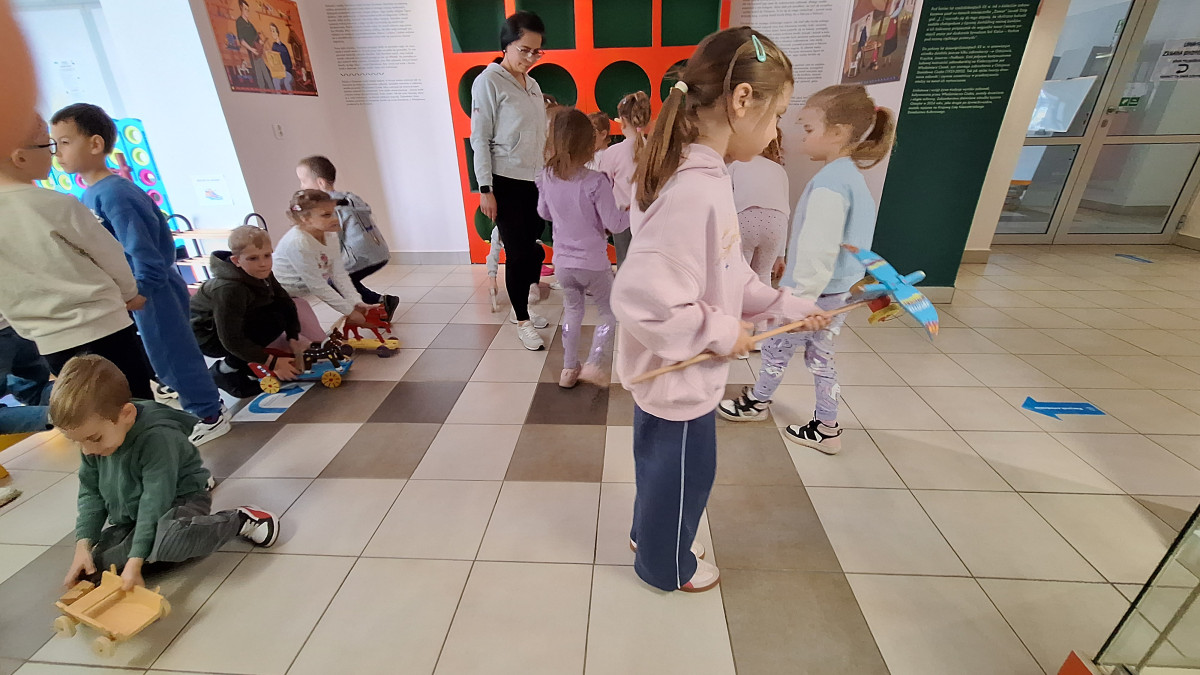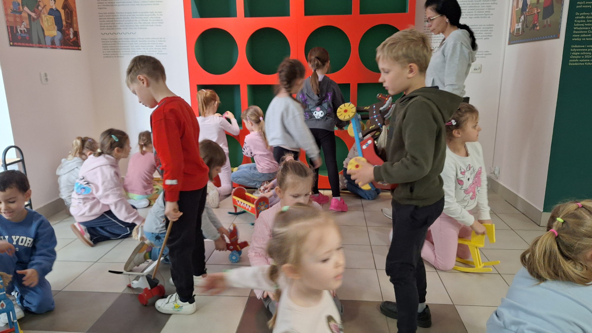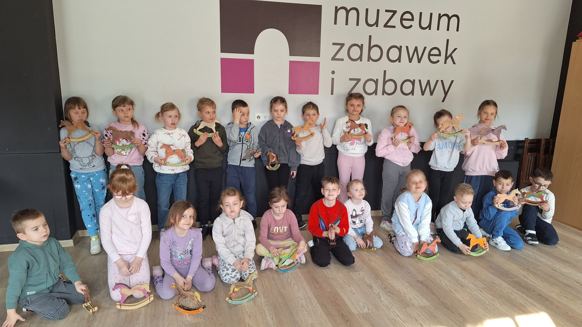 Nasi najmłodsi uczniowie z oddziału „0” wybrali się na wyjątkową wycieczkę do Muzeum Zabawek, gdzie przenieśli się w świat dzieciństwa swoich babć i dziadków. Podczas zwiedzania ekspozycji dzieci z zachwytem odkrywały skarby z dawnych lat – od misternych domków dla lalek po mechaniczne figurki. Głównym punktem programu były warsztaty edukacyjne pt. „Konik Bujany”, podczas których przedszkolaki poznały historię tej kultowej zabawki i tajniki dawnego rzemiosła. Wiele emocji wzbudziła możliwość bezpośredniego kontaktu z zabawkami z dawnych lat - dzieci mogły samodzielnie pobawić się tradycyjnymi, drewnianymi zabawkami, przekonując się, że proste zabawki również dają mnóstwo radości. Ta pełna uśmiechu lekcja historii na długo pozostanie w ich pamięci, rozbudzając ciekawość świata i szacunek do tradycji.
