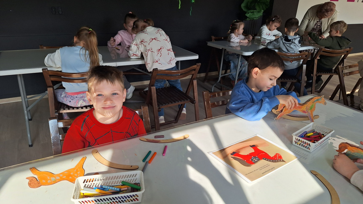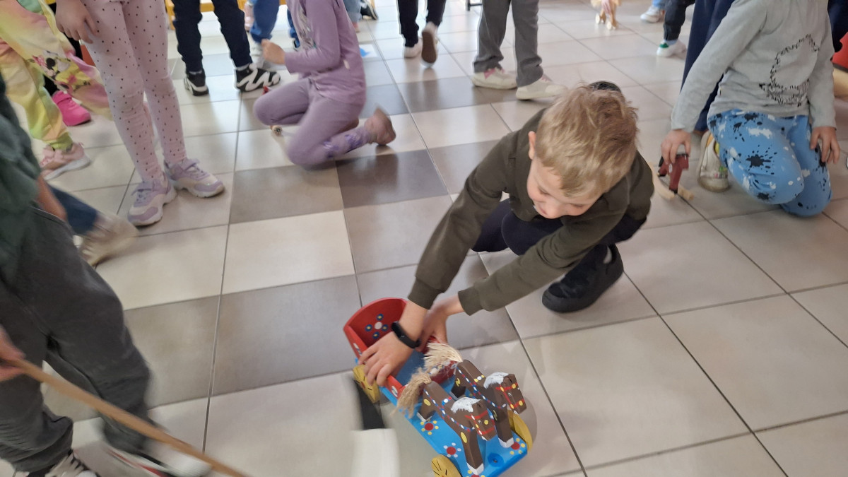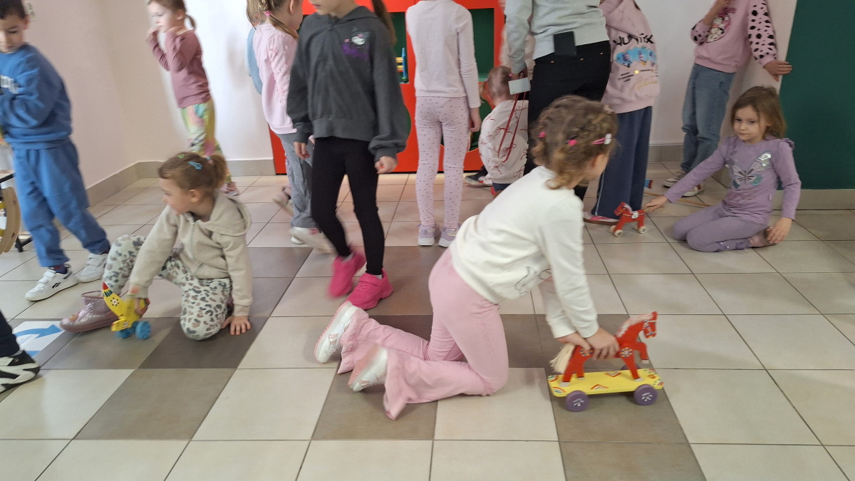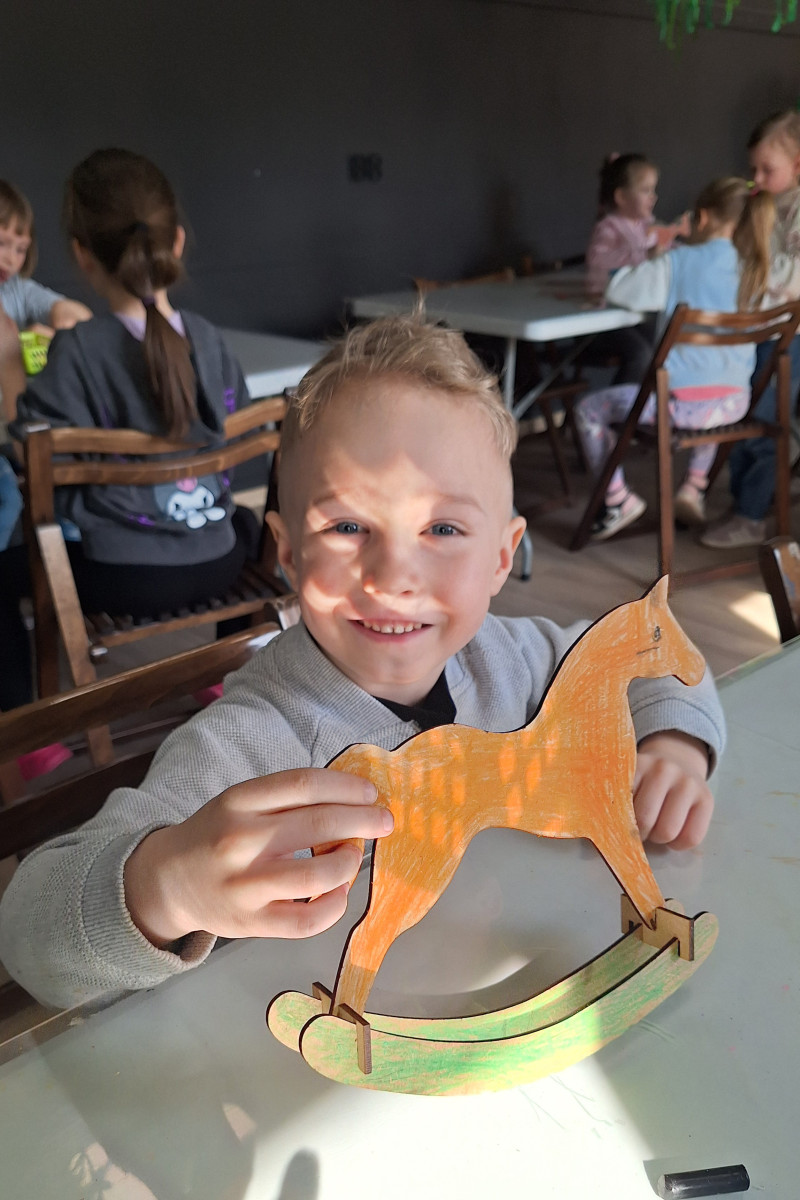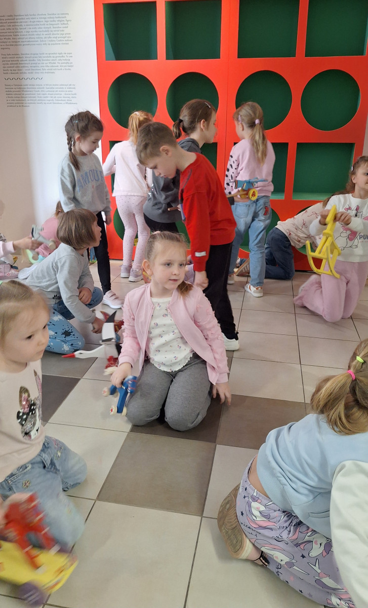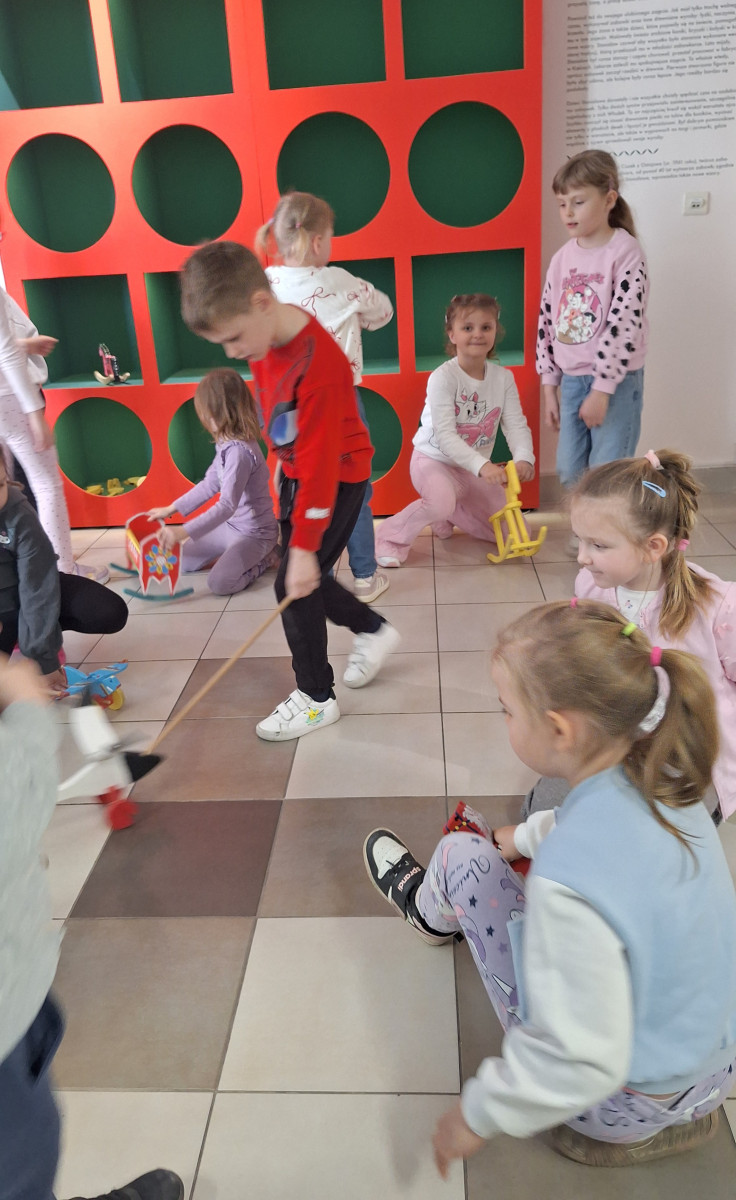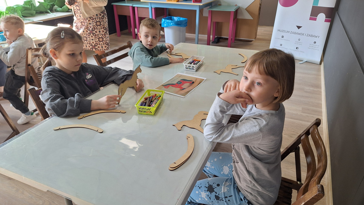 Nasi najmłodsi uczniowie z oddziału „0” wybrali się na wyjątkową wycieczkę do Muzeum Zabawek, gdzie przenieśli się w świat dzieciństwa swoich babć i dziadków. Podczas zwiedzania ekspozycji dzieci z zachwytem odkrywały skarby z dawnych lat – od misternych domków dla lalek po mechaniczne figurki. Głównym punktem programu były warsztaty edukacyjne pt. „Konik Bujany”, podczas których przedszkolaki poznały historię tej kultowej zabawki i tajniki dawnego rzemiosła. Wiele emocji wzbudziła możliwość bezpośredniego kontaktu z zabawkami z dawnych lat - dzieci mogły samodzielnie pobawić się tradycyjnymi, drewnianymi zabawkami, przekonując się, że proste zabawki również dają mnóstwo radości. Ta pełna uśmiechu lekcja historii na długo pozostanie w ich pamięci, rozbudzając ciekawość świata i szacunek do tradycji.