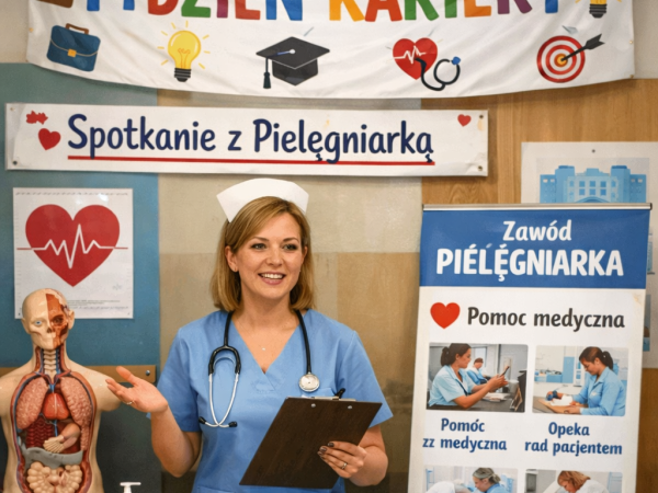 W ramach Tygodnia Kariery w naszej szkole odbyło się wyjątkowe spotkanie z panią Gosią – pielęgniarką pracującą na co dzień w naszej placówce, a jednocześnie wykładowcą akademickim.