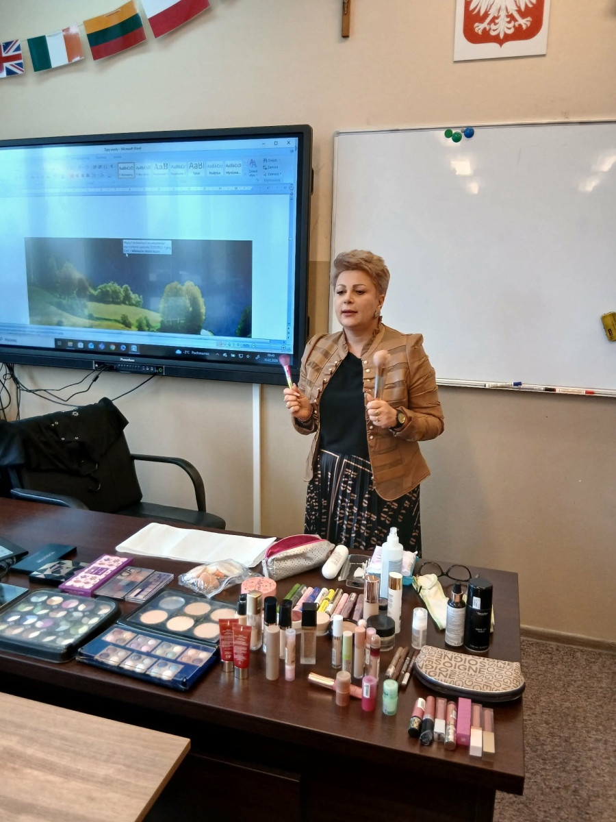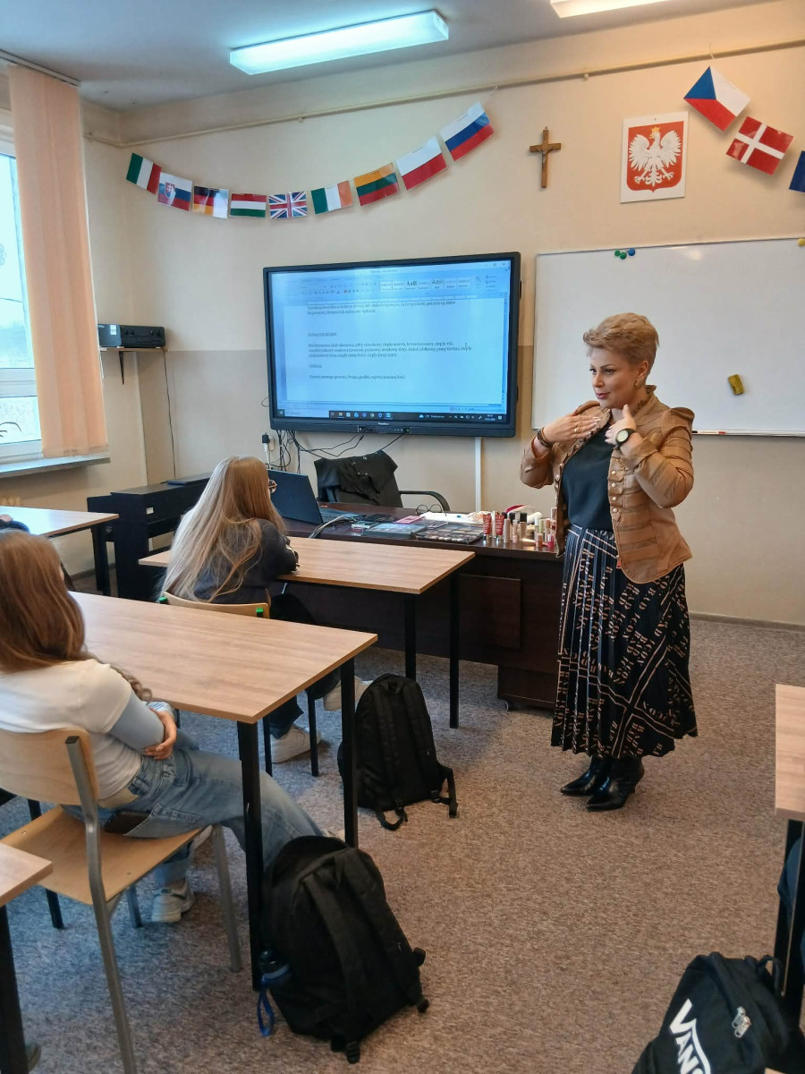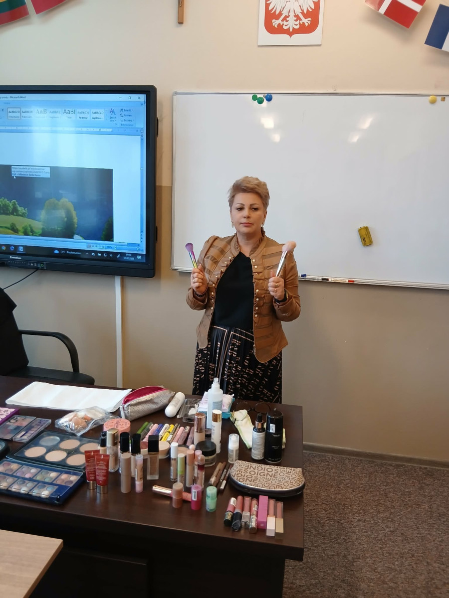 Podczas spotkania Pani Ewa zaprezentowała tajniki swojego zawodu, opowiadając o ścieżce kariery, wymaganych kwalifikacjach oraz realiach pracy w branży kosmetologicznej. Uczniowie mieli okazję poznać praktyczne aspekty zawodu, nowoczesne metody pielęgnacji oraz zadać pytania dotyczące rozwoju zawodowego.