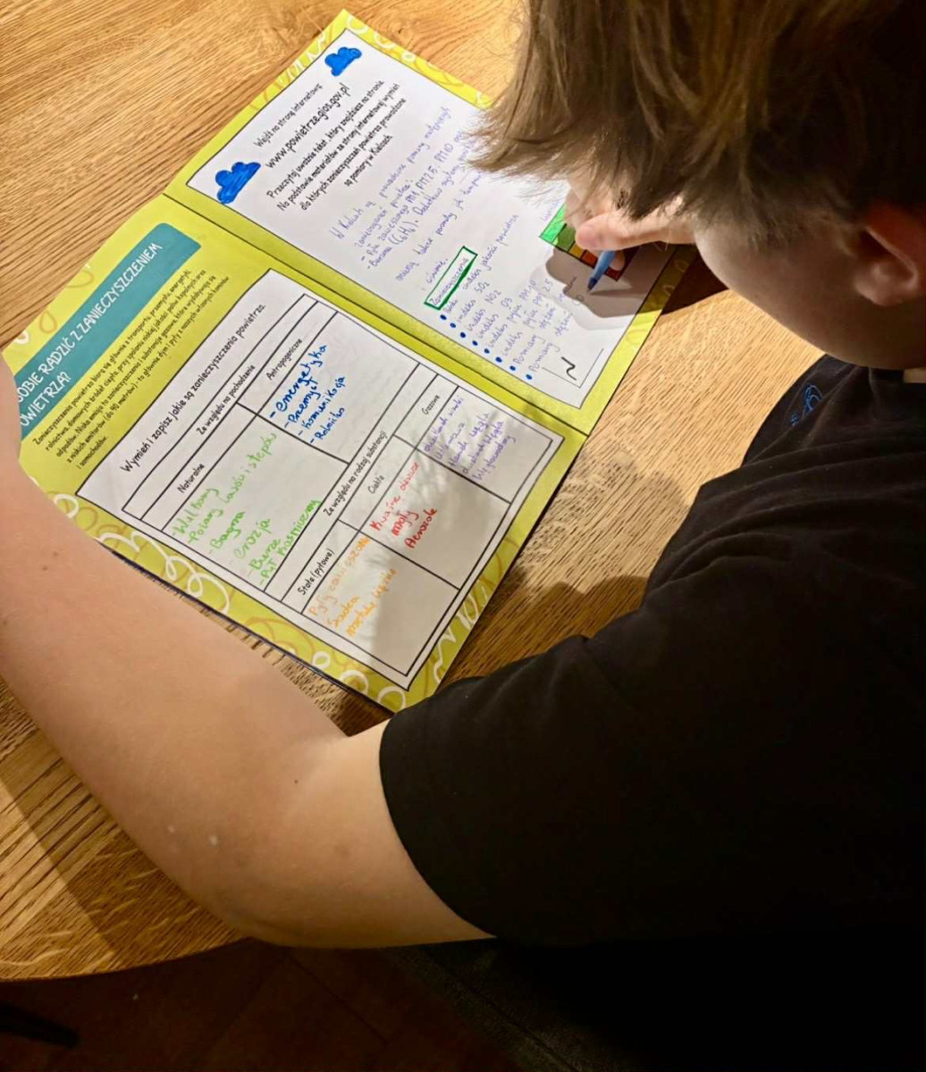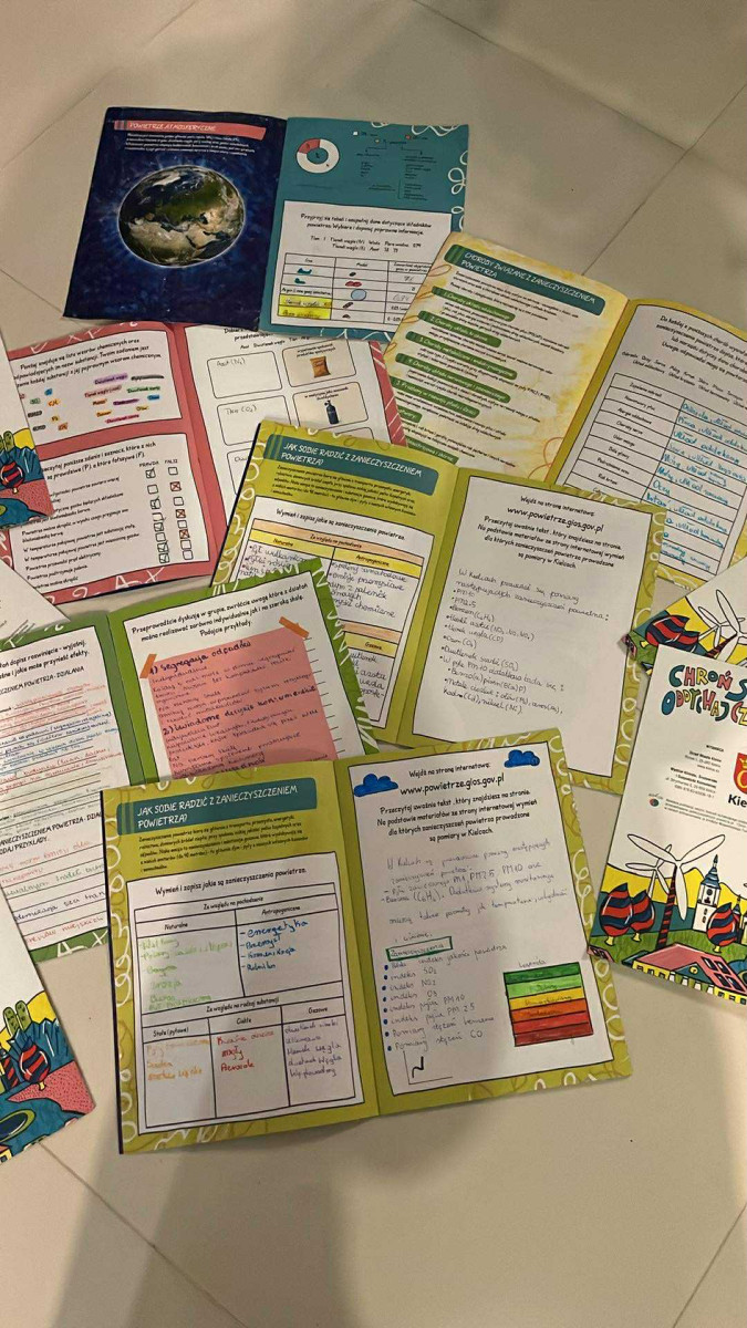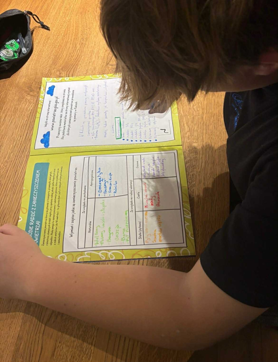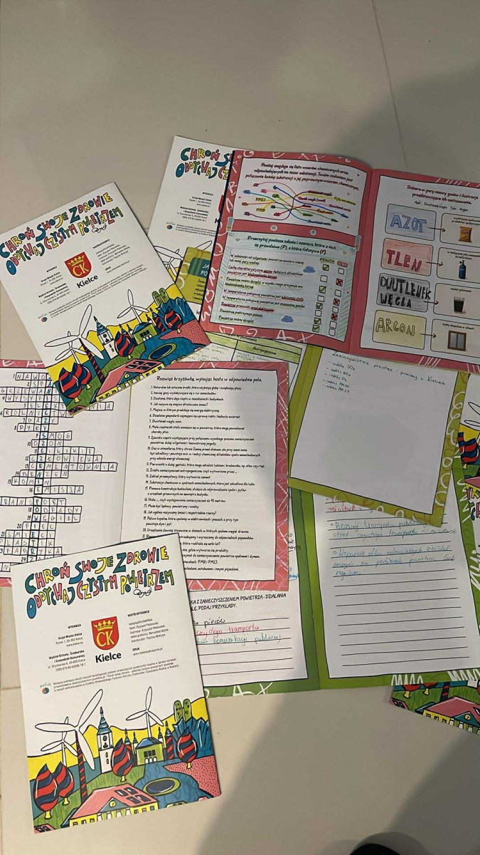 Uczniowie naszej szkoły rozwiązywali zadania zawarte w zeszytach ćwiczeń przygotowanych przez UM. Dzieci i młodzież zmagali się z krzyżówkami, grafami, wykreślankami, tabelami i wieloma innymi formami zadań, świetnie radząc sobie ze wszystkimi zadaniami. Rozwiązując zeszyty ćwiczeń uczniowie dowiedzieli się między innymi: jaki jest skład powietrza, jakie zanieczyszczenia są najbardziej niebezpieczne dla zdrowia, jak radzić sobie z nimi i jakie działania mogą pomóc w walce z tym groźnym zjawiskiem. Dopasowali choroby wywoływane przez zanieczyszczenia do odpowiednich organów, uświadamiając sobie różnego rodzaju zagrożenia zdrowotne. Zadania zostały potraktowane jako nauka poprzez zabawę, która uczy, angażuje i motywuje.