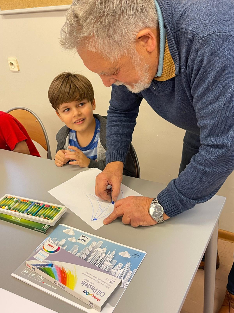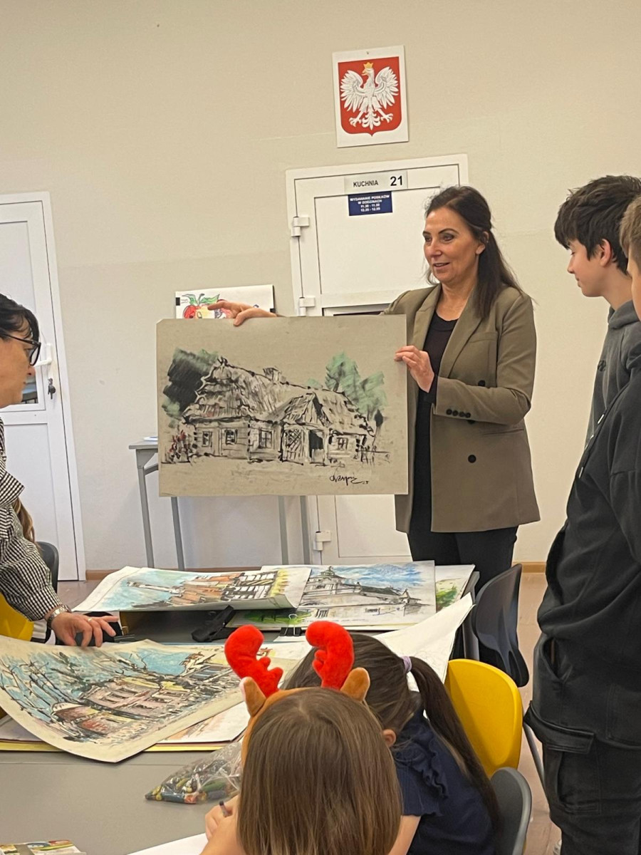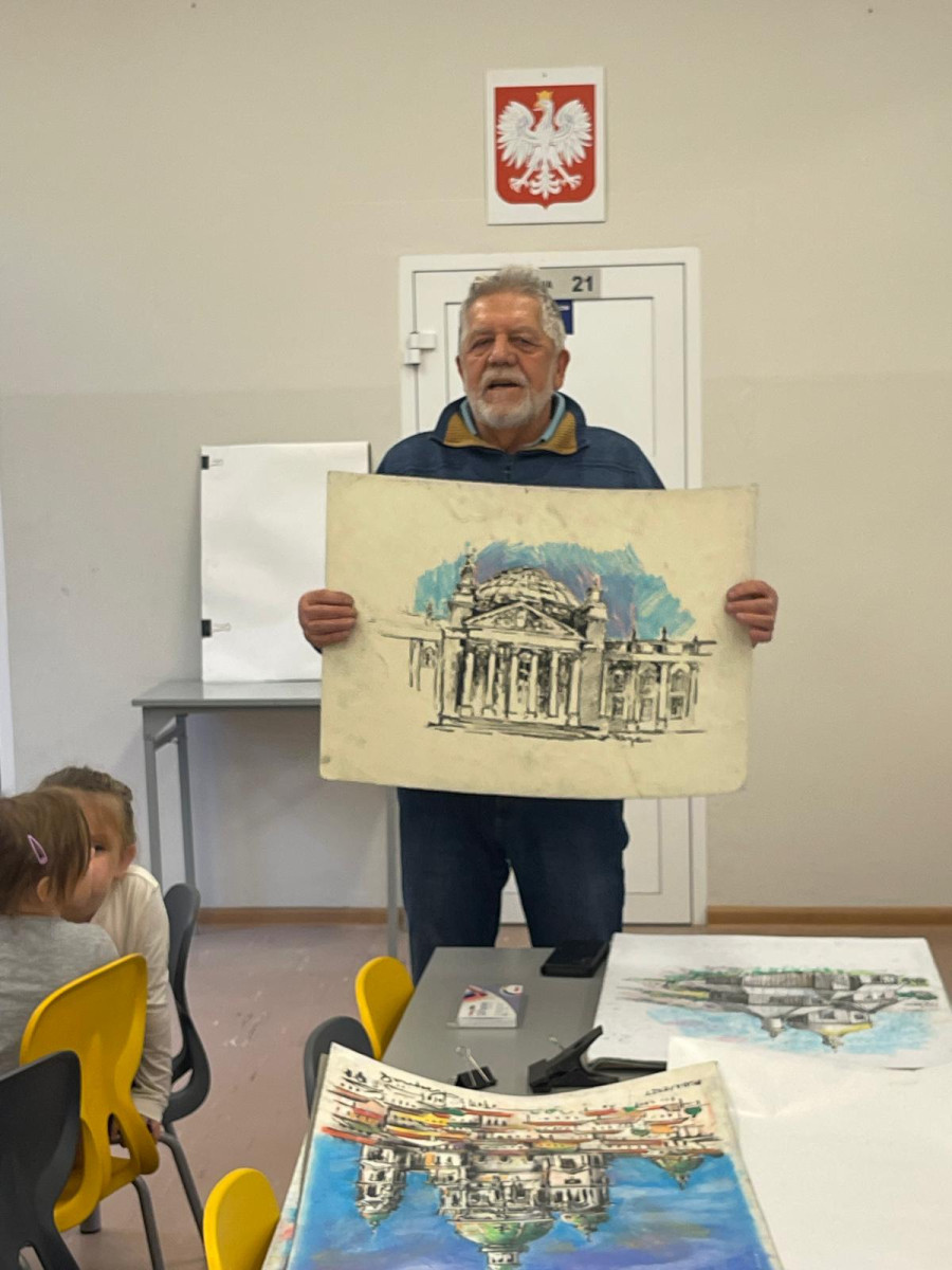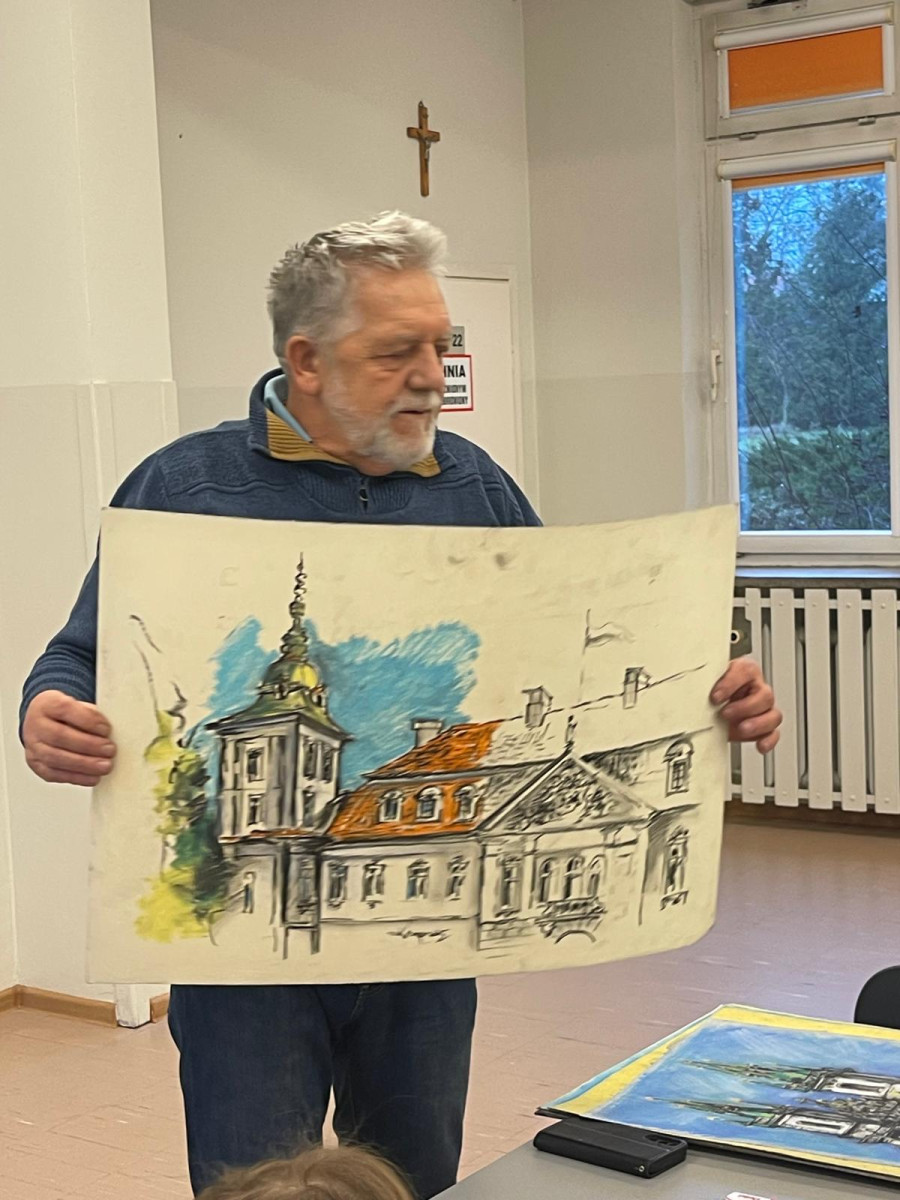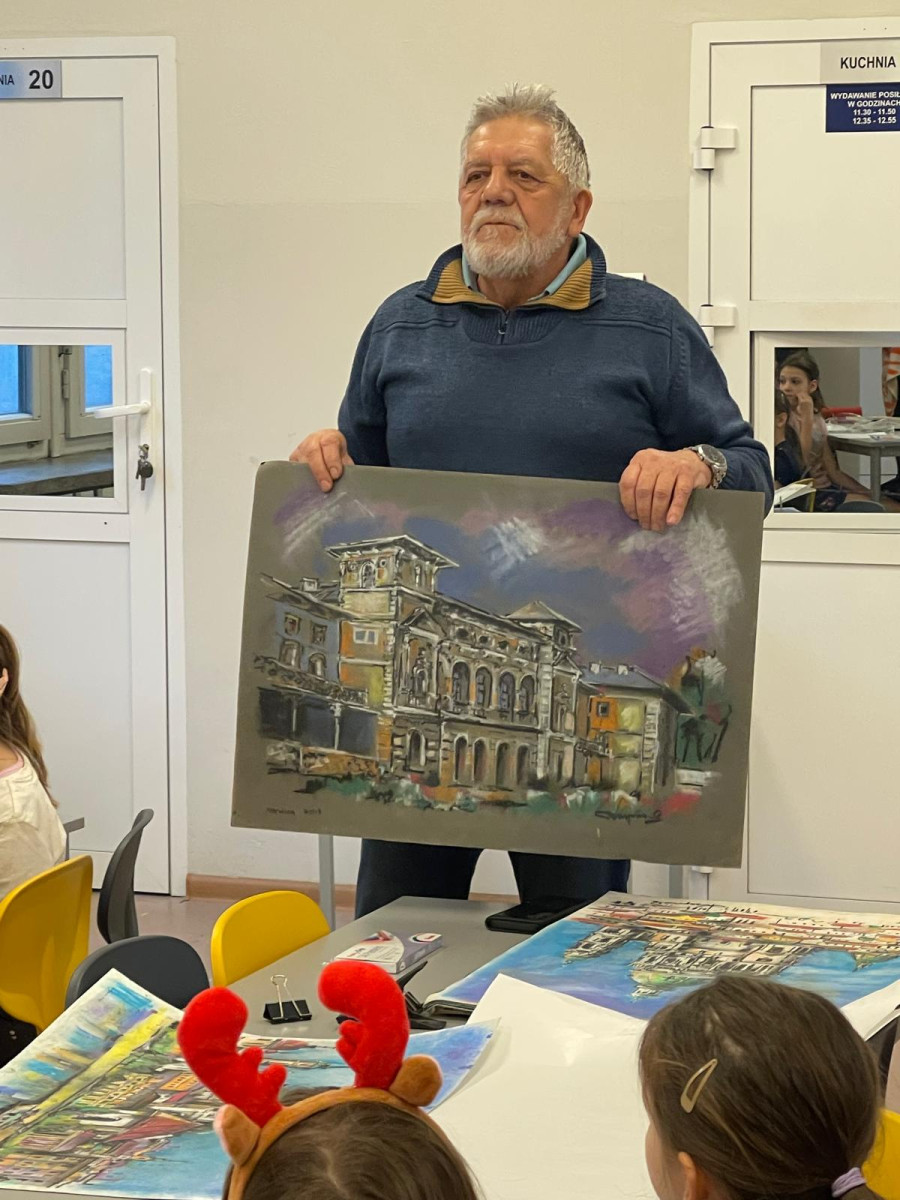 9 grudnia 2025 roku odwiedził naszą szkołę znany jędrzejowski artysta – plastyk, Pan ZBIGNIEW KASPRZAK, który maluje od ponad pięćdziesięciu lat. Przez ten czas, udało mu się stworzyć kolekcję kilku tysięcy obrazów prezentujących głównie architekturę i krajobrazy Ponidzia. Dla naszych uczniów poprowadził warsztaty plastyczne, przekazując jednocześnie informacje o historii swojego artyzmu i całego dorobku. Wszyscy świetnie się bawili robiąc przepiękne rysunki, pod okiem Mistrza.
