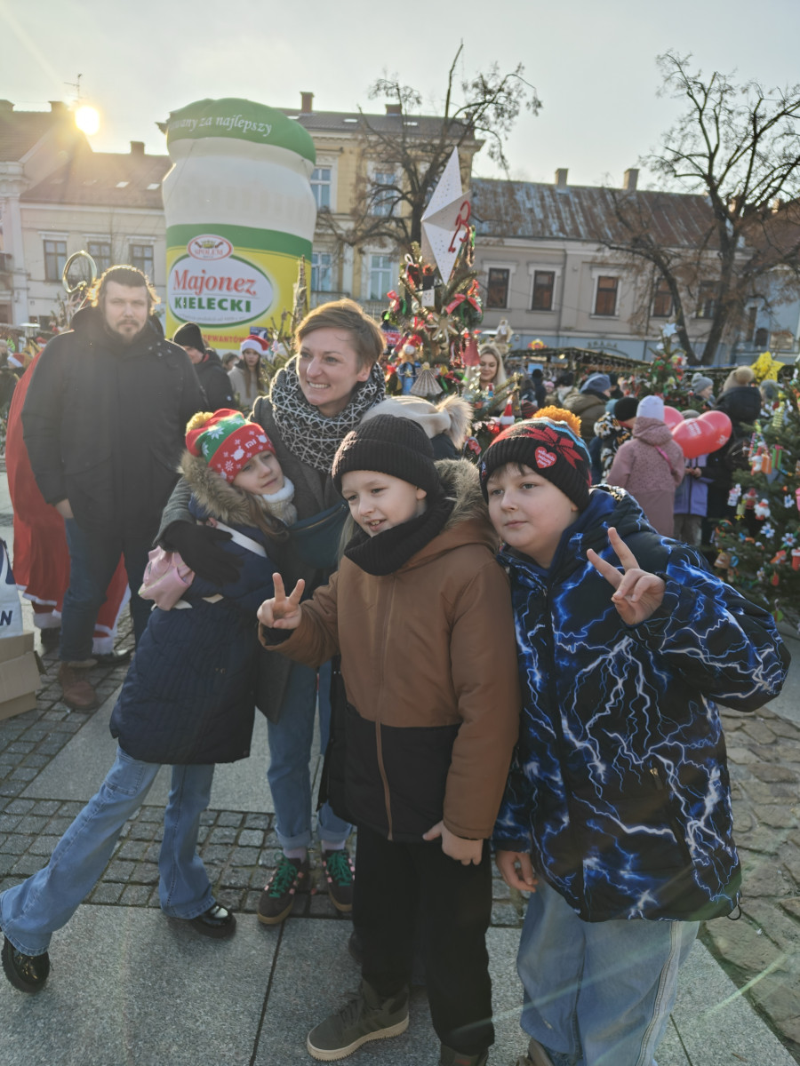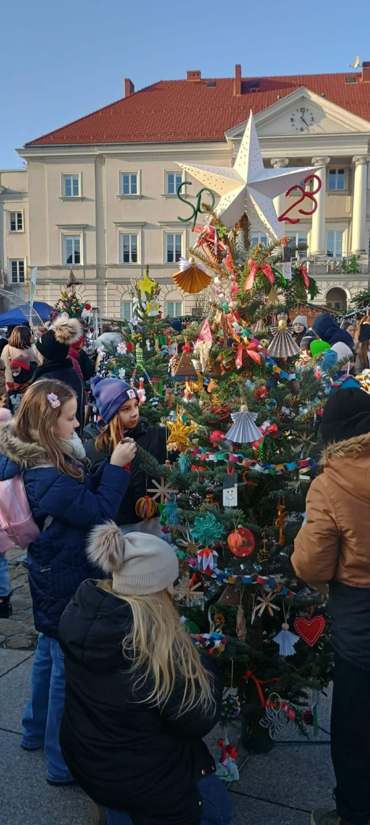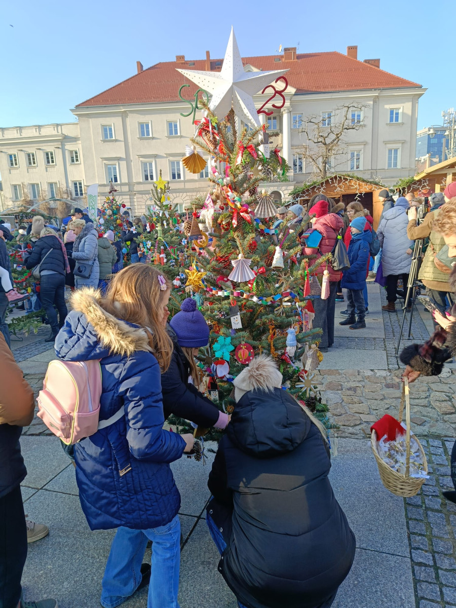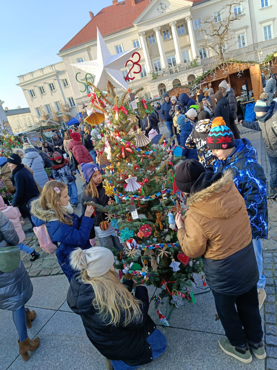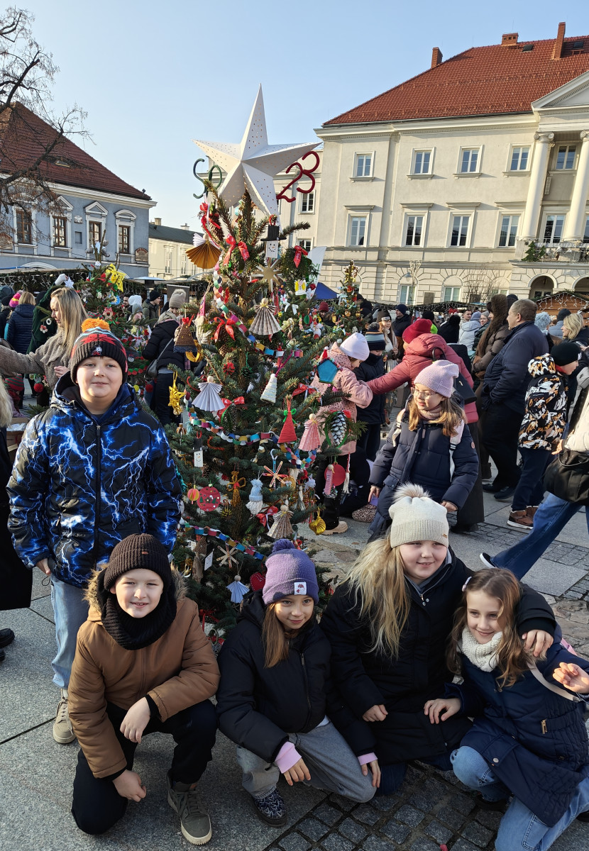 W sobotę, 13 grudnia, w ramach Jarmarku Świętokrzyskiego odbył się KONKURS NA NAJPIĘKNIEJ UDEKOROWANĄ CHOINKĘ. W atmosferze radości i świątecznego klimatu na kieleckim Rynku dzieci z 18 szkół dekorowały świąteczne drzewka ozdobami wykonanymi przez siebie. Naszą szkołę reprezentowali uczniowie klasy trzeciej wraz ze swoją wychowawczynią, panią Barbarą Kiepas. Z radością informujemy, że nasza choinka zajęła w konkursie II MIEJSCE. To wyjątkowe wyróżnienie jest efektem ogromnego zaangażowania, kreatywności i wspólnej pracy trzecioklasistów, którzy z wielkim entuzjazmem przygotowywali świąteczne ozdoby.