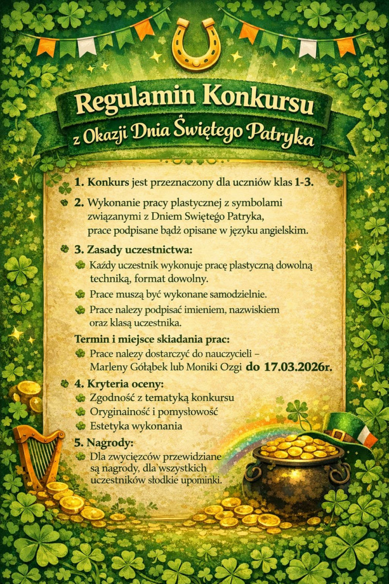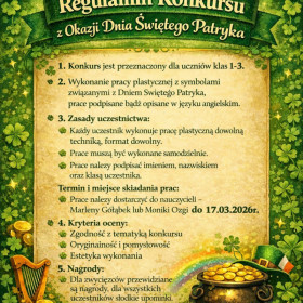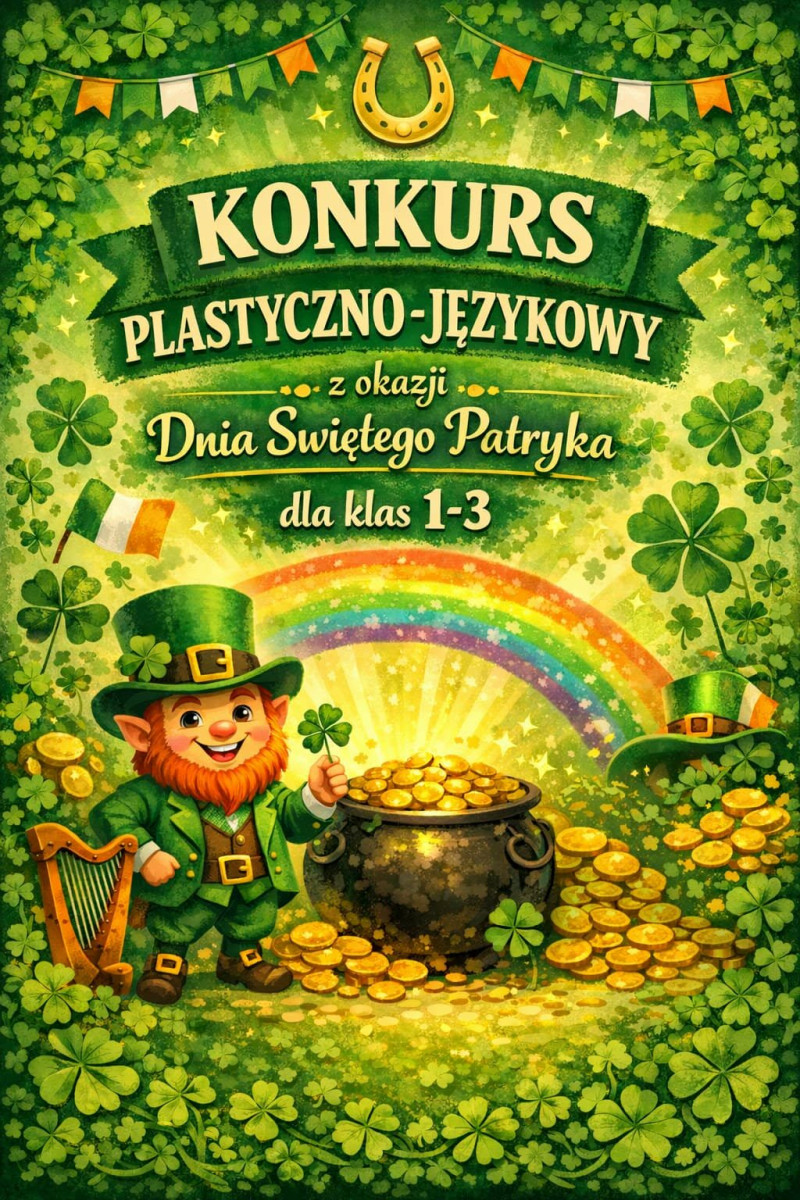 Z radością zapraszamy wszystkich uczniów naszej szkoły do udziału w szkolnym konkursie plastyczno - językowym z okazji Dnia Świętego Patryka! To doskonała okazja, aby rozwijać swoje talenty, wykazać się kreatywnością i poznać irlandzką kulturę.