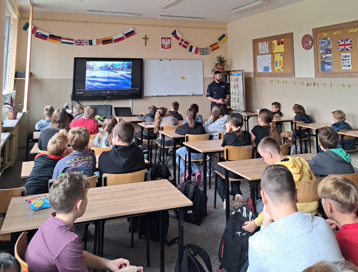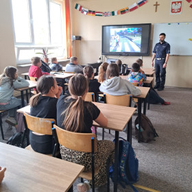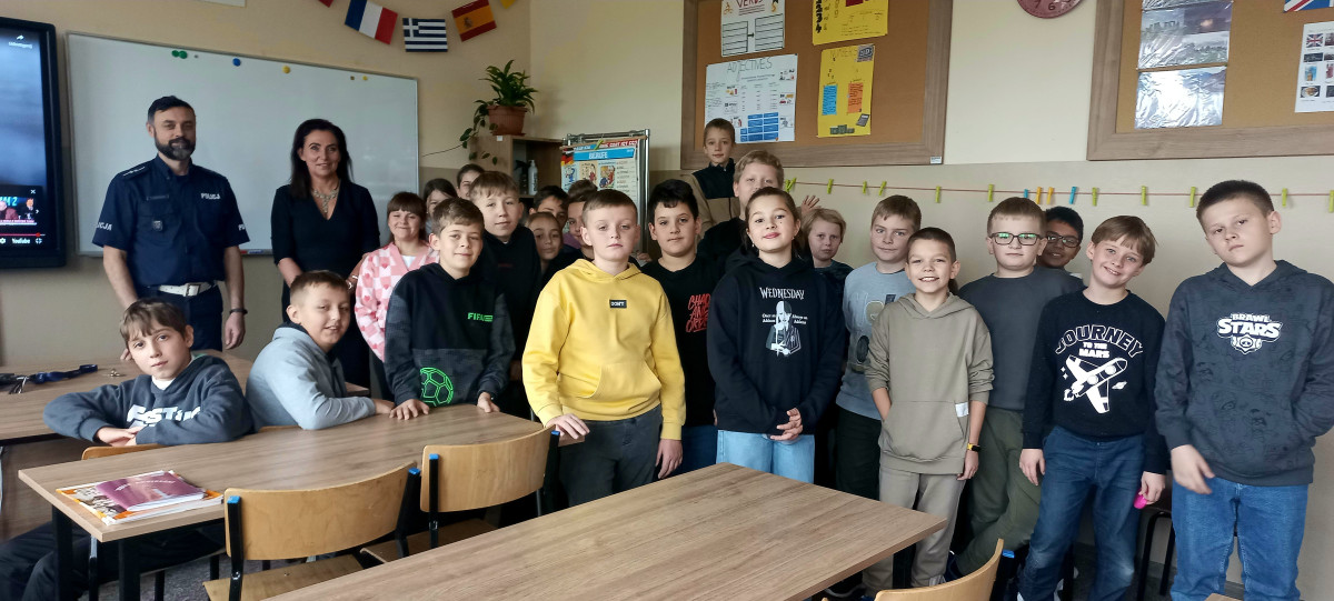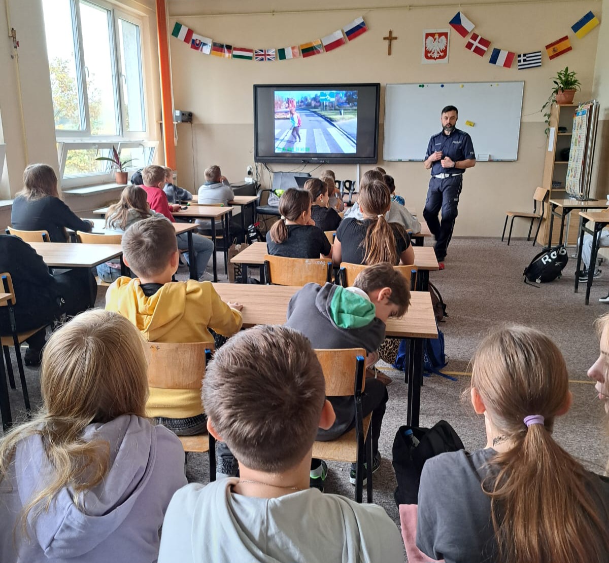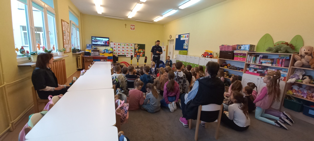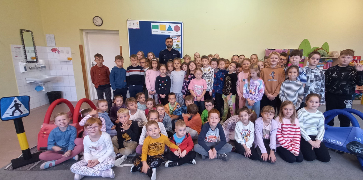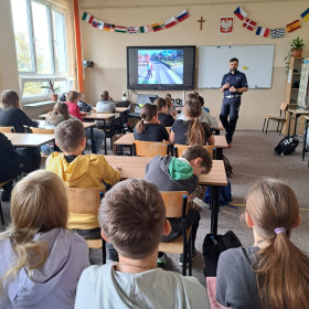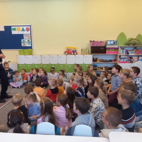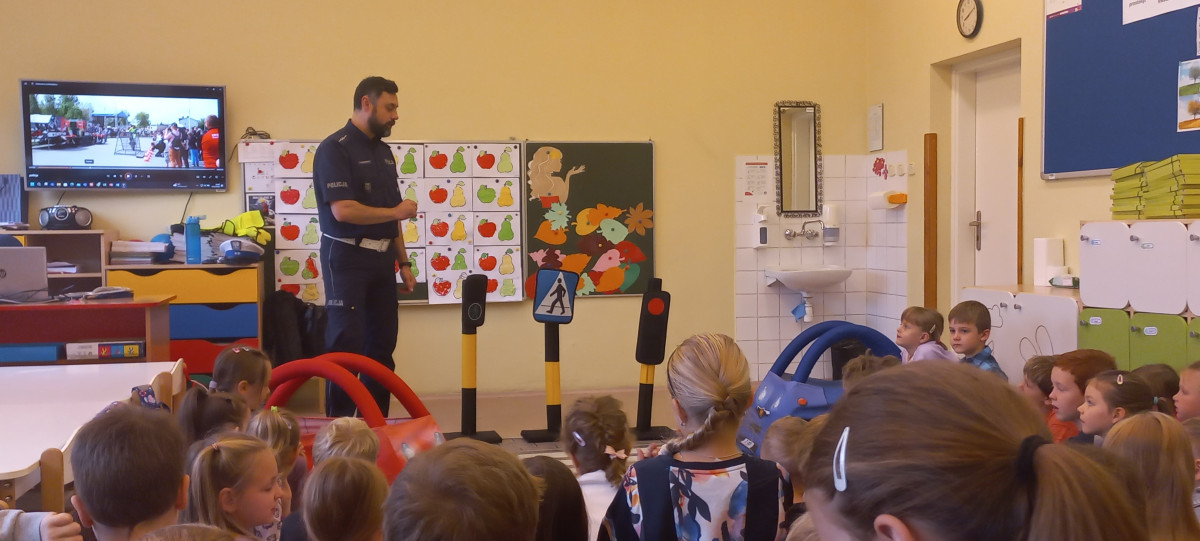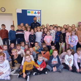 W naszej szkole duży nacisk kładziemy na bezpieczeństwo oraz edukację związaną z bezpieczeństwem dzieci. W ramach edukacji zaprosiliśmy do nas zaprzyjaźnionego policjanta, Pana aspiranta Tomasza z KWP w Kielcach, który spotkał się z całą społecznością szkolną. Tematem spotkania była "Bezpieczna droga do szkoły". Policjant rozmawiał z uczniami o bezpiecznym poruszaniu się po ulicach, a w szczególności omówił zasady bezpiecznej drogi do i ze szkoły. Przypomniał również o korzyściach noszenia elementów odblaskowych przy ubraniu bądź tornistrze oraz jak należy zachować się, gdy zaczepi nas obca osoba. Następnie wytłumaczył jak dbać o bezpieczeństwo własne i innych oraz do kogo zwracać się o pomoc w sytuacji zagrożenia. Powtórzyliśmy również numery alarmowe. W starszych klasach policjant poruszył również temat bezpieczeństwa w szkole i poza nią oraz konsekwencji nieodpowiedzialnych zachowań. Uczniowie mieli okazję zadać pytania i podzielić się własnymi spostrzeżeniami.