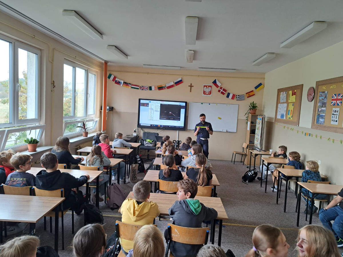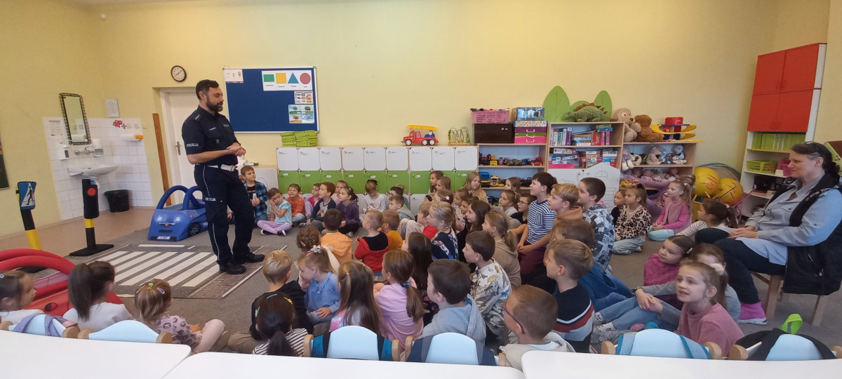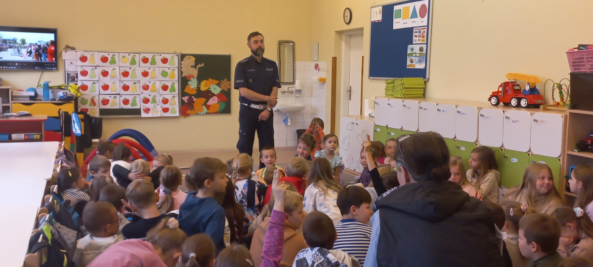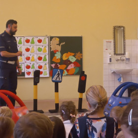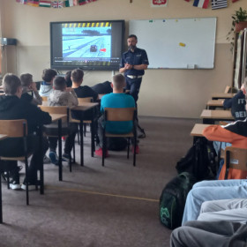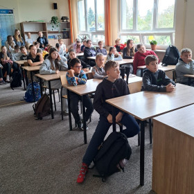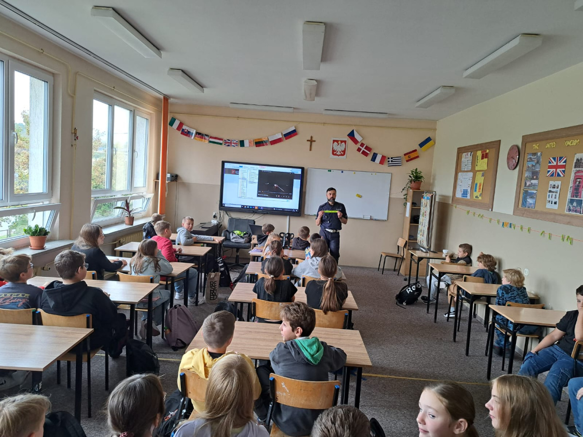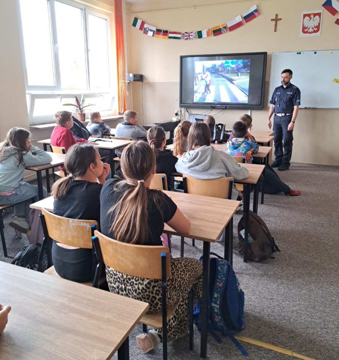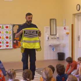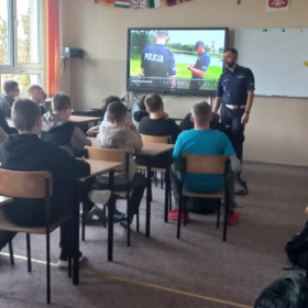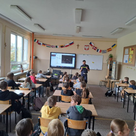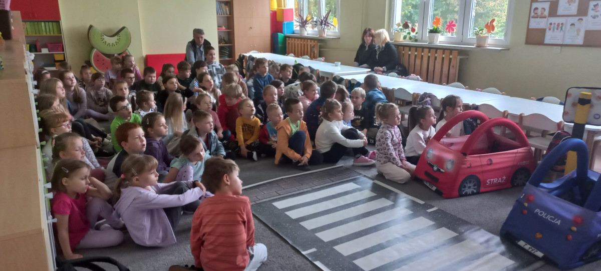 W naszej szkole duży nacisk kładziemy na bezpieczeństwo oraz edukację związaną z bezpieczeństwem dzieci. W ramach edukacji zaprosiliśmy do nas zaprzyjaźnionego policjanta, Pana aspiranta Tomasza z KWP w Kielcach, który spotkał się z całą społecznością szkolną. Tematem spotkania była "Bezpieczna droga do szkoły". Policjant rozmawiał z uczniami o bezpiecznym poruszaniu się po ulicach, a w szczególności omówił zasady bezpiecznej drogi do i ze szkoły. Przypomniał również o korzyściach noszenia elementów odblaskowych przy ubraniu bądź tornistrze oraz jak należy zachować się, gdy zaczepi nas obca osoba. Następnie wytłumaczył jak dbać o bezpieczeństwo własne i innych oraz do kogo zwracać się o pomoc w sytuacji zagrożenia. Powtórzyliśmy również numery alarmowe. W starszych klasach policjant poruszył również temat bezpieczeństwa w szkole i poza nią oraz konsekwencji nieodpowiedzialnych zachowań. Uczniowie mieli okazję zadać pytania i podzielić się własnymi spostrzeżeniami.