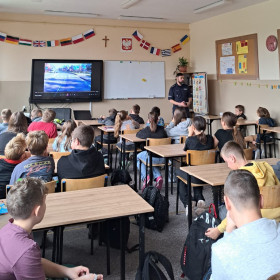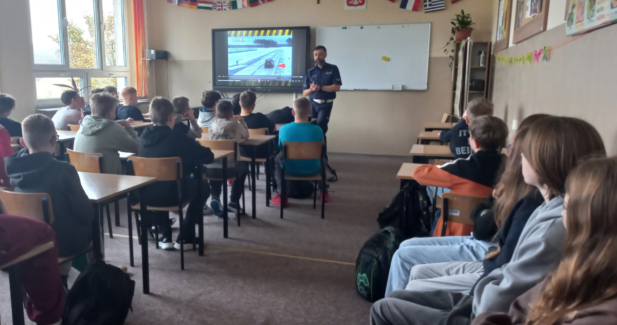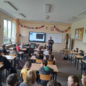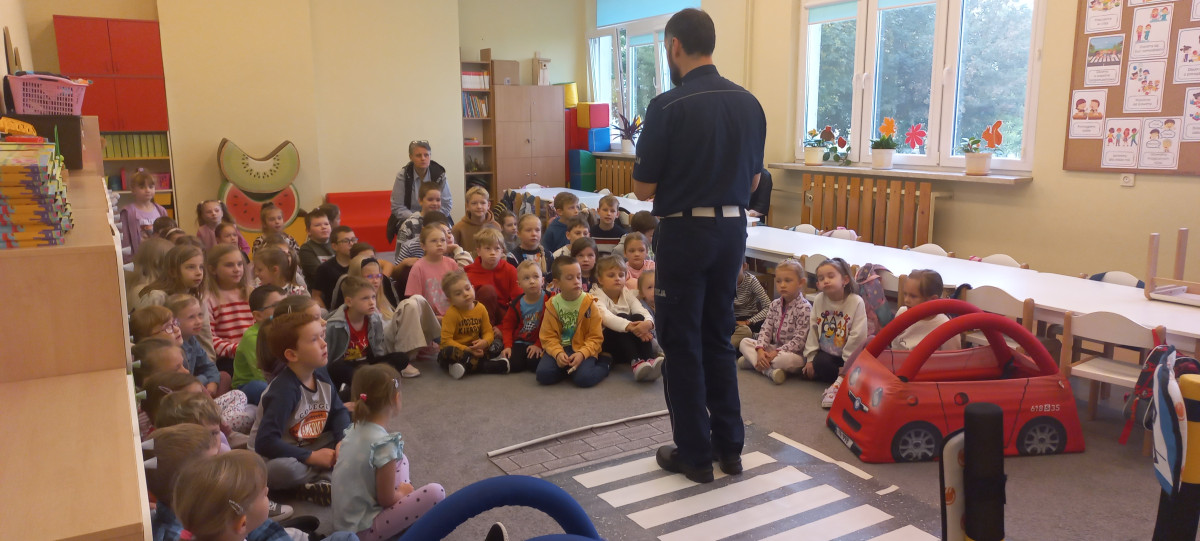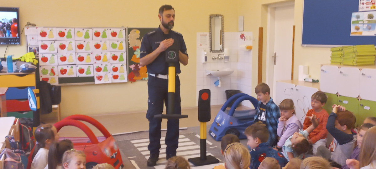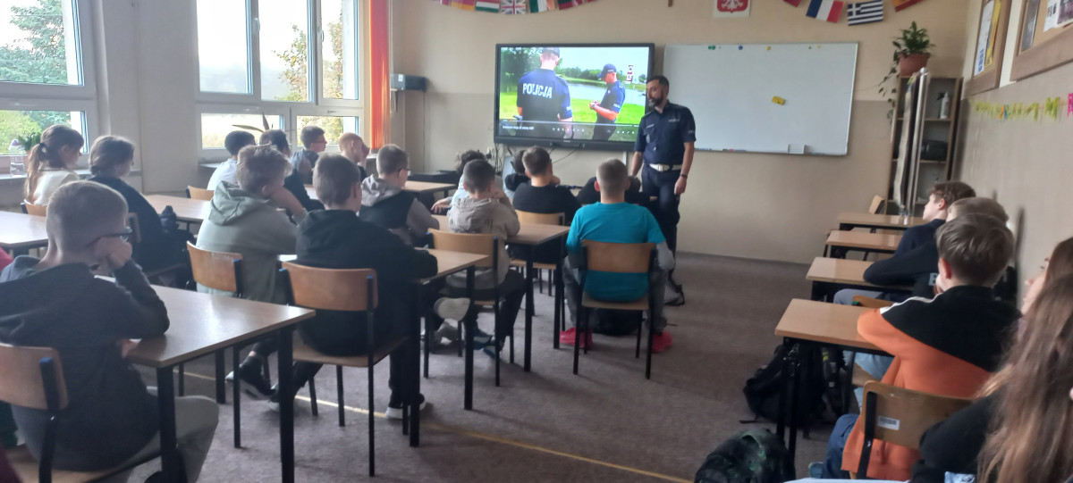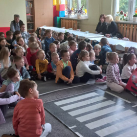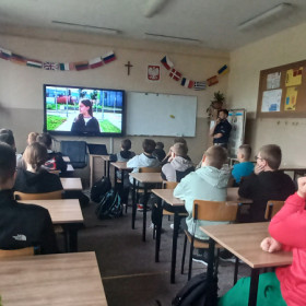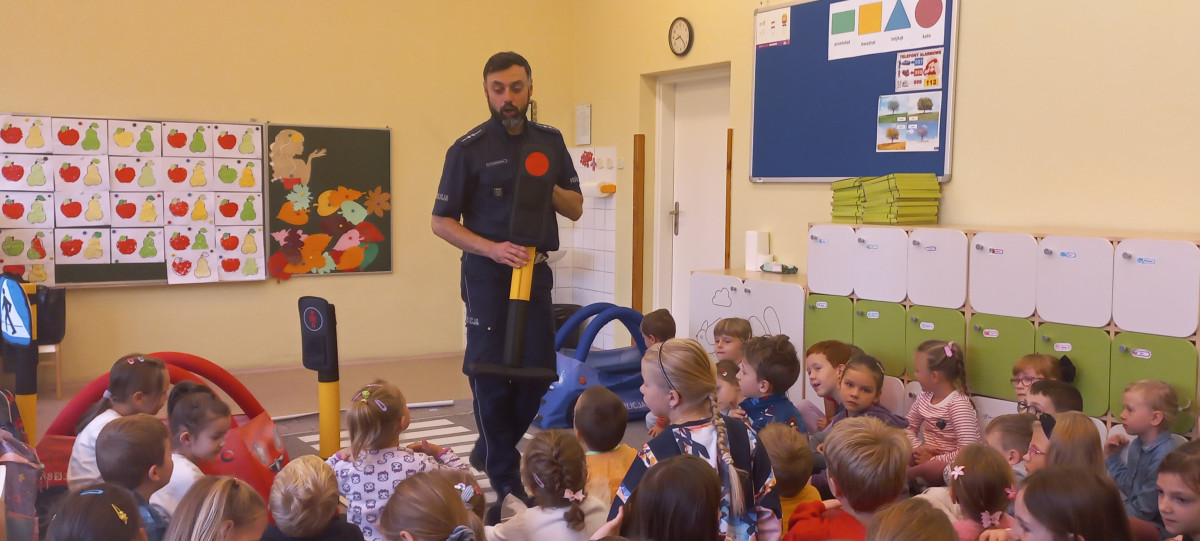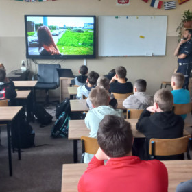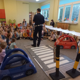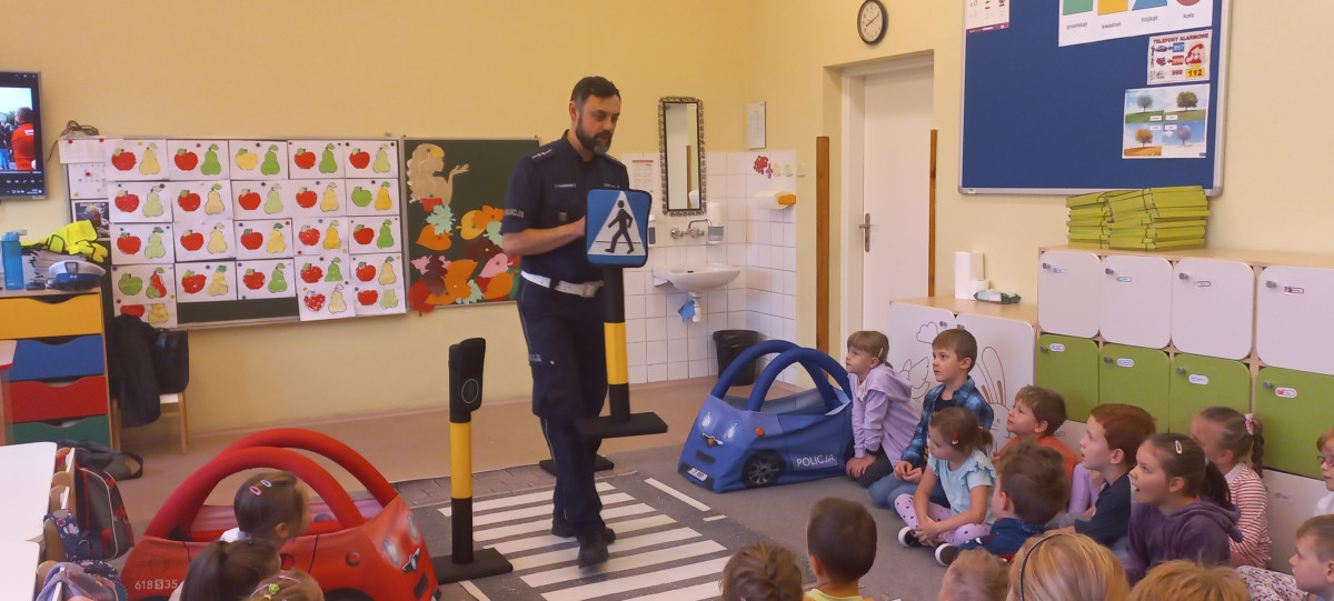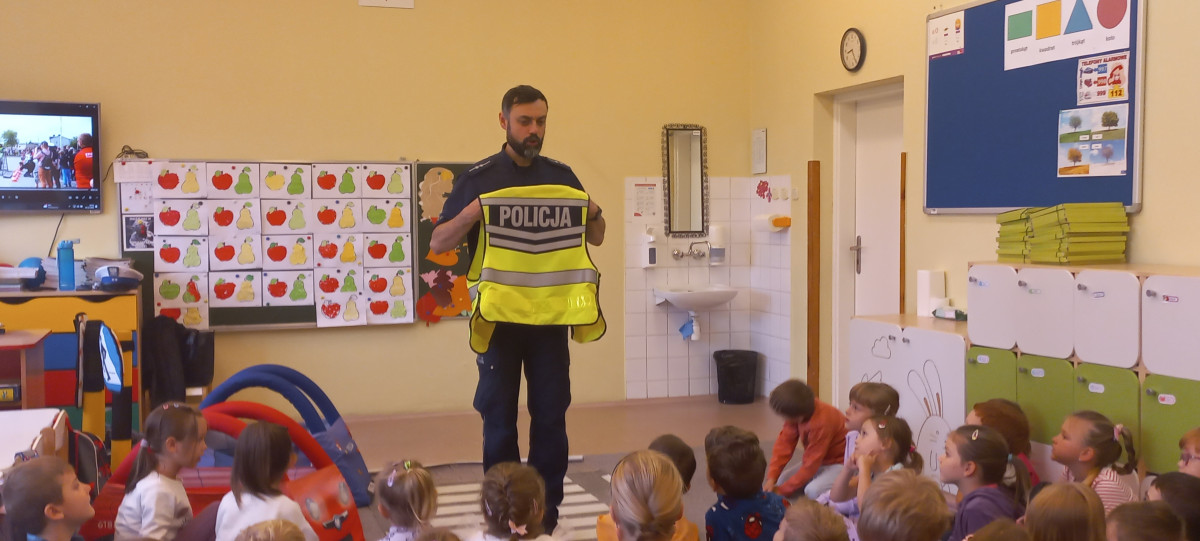 W naszej szkole duży nacisk kładziemy na bezpieczeństwo oraz edukację związaną z bezpieczeństwem dzieci. W ramach edukacji zaprosiliśmy do nas zaprzyjaźnionego policjanta, Pana aspiranta Tomasza z KWP w Kielcach, który spotkał się z całą społecznością szkolną. Tematem spotkania była "Bezpieczna droga do szkoły". Policjant rozmawiał z uczniami o bezpiecznym poruszaniu się po ulicach, a w szczególności omówił zasady bezpiecznej drogi do i ze szkoły. Przypomniał również o korzyściach noszenia elementów odblaskowych przy ubraniu bądź tornistrze oraz jak należy zachować się, gdy zaczepi nas obca osoba. Następnie wytłumaczył jak dbać o bezpieczeństwo własne i innych oraz do kogo zwracać się o pomoc w sytuacji zagrożenia. Powtórzyliśmy również numery alarmowe. W starszych klasach policjant poruszył również temat bezpieczeństwa w szkole i poza nią oraz konsekwencji nieodpowiedzialnych zachowań. Uczniowie mieli okazję zadać pytania i podzielić się własnymi spostrzeżeniami.