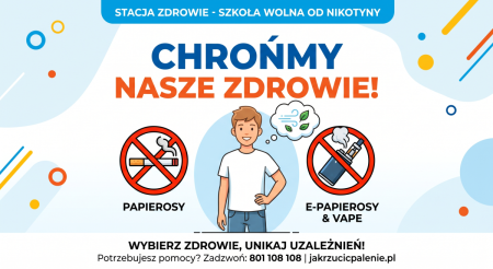 Nasze zasady: Zgodnie z obowiązującym prawem i statutem, na całym terenie naszej szkoły (zarówno w budynkach, jak i na terenie zewnętrznym i przylegającym) obowiązuje bezwzględny zakaz używania jakichkolwiek wyrobów tytoniowych i nikotynowych. Zakaz ten dotyczy uczniów, pracowników oraz wszystkich osób odwiedzających placówkę.