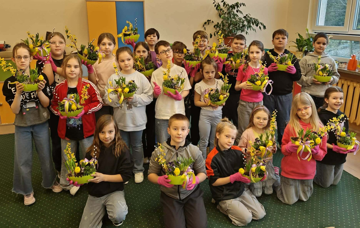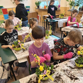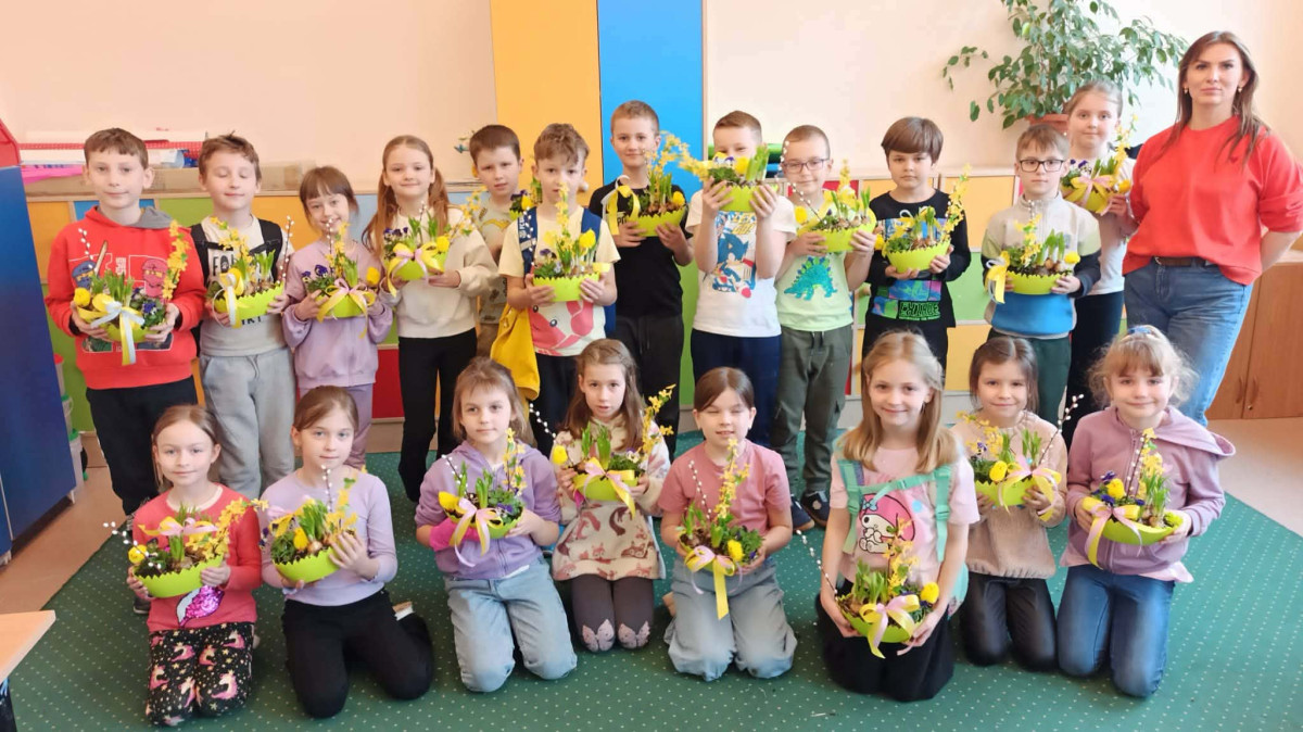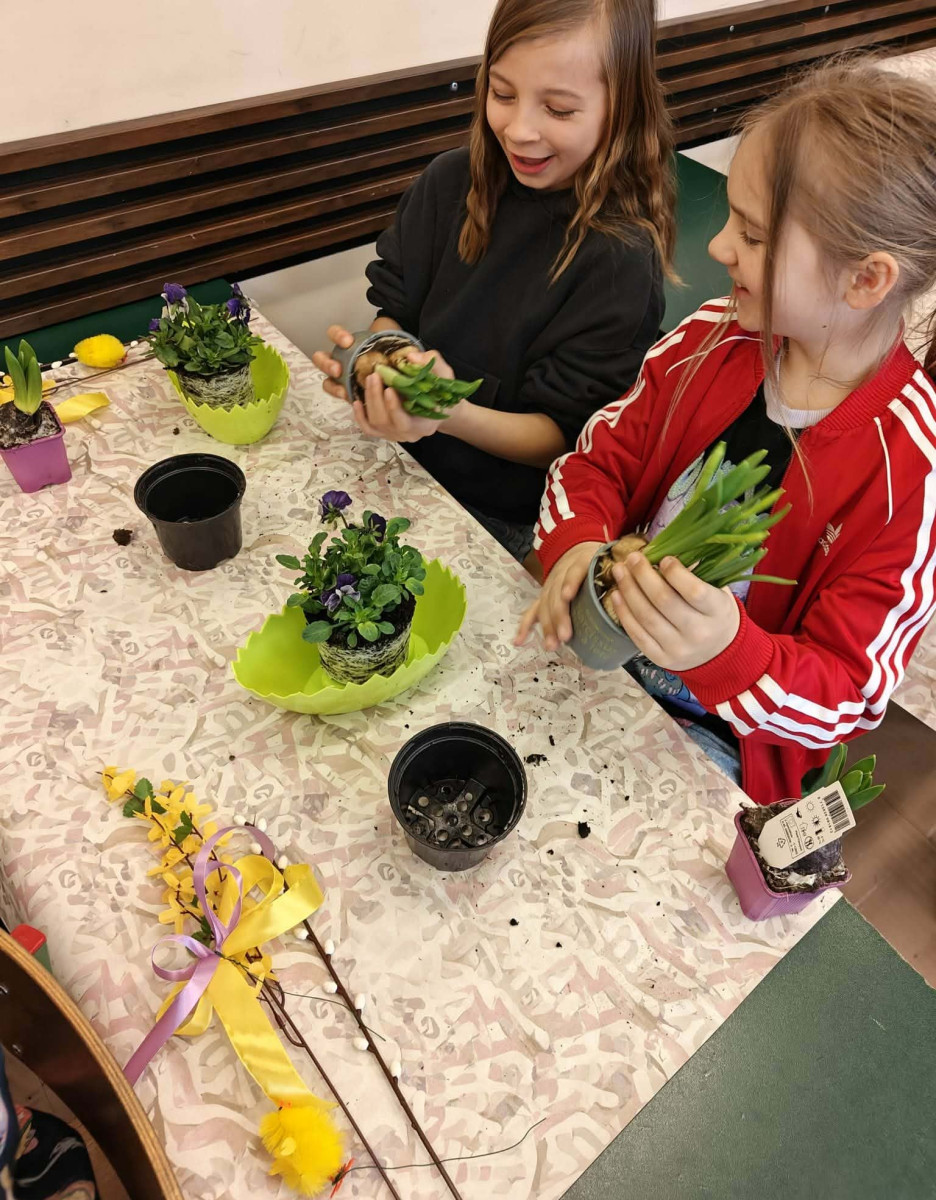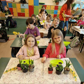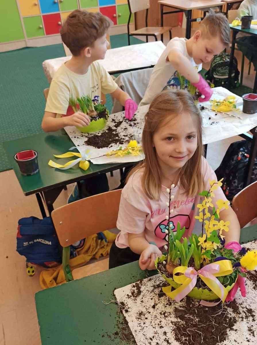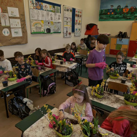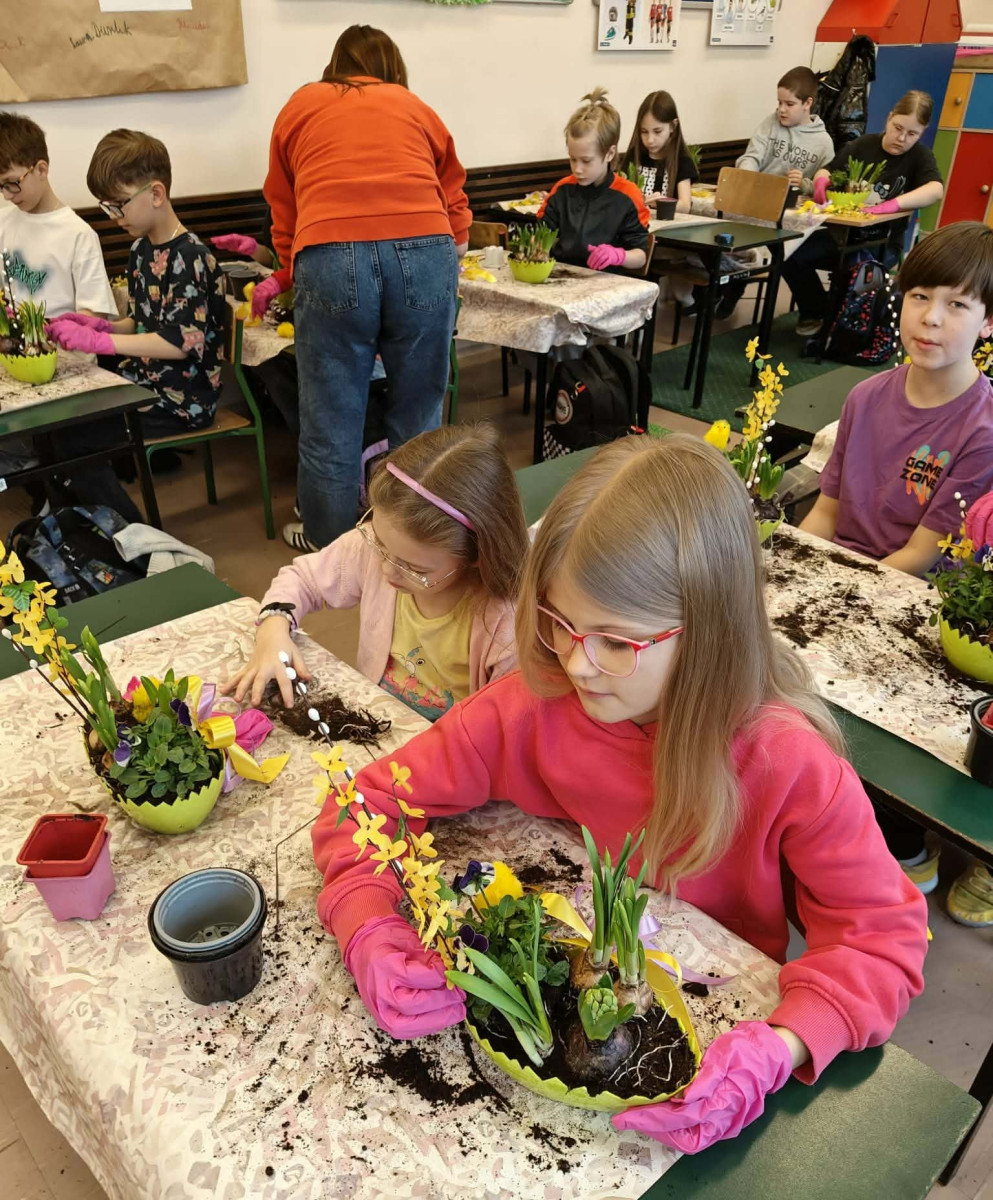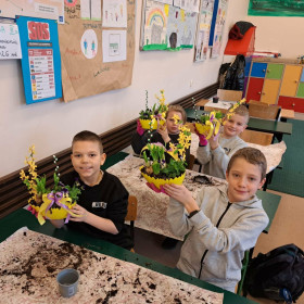 W dniu 30 marca uczniowie klas 1–4 uczestniczyli w wyjątkowych warsztatach florystycznych, podczas których mieli okazję własnoręcznie przygotować żywe stroiki świąteczne. Pod czujnym okiem prowadzącej zajęcia, florystki pani Pauliny, dzieci uczyły się łączyć świeże kwiaty i dekoracje, tworząc unikalne kompozycje, które wprowadziły w klasach świąteczny nastrój.