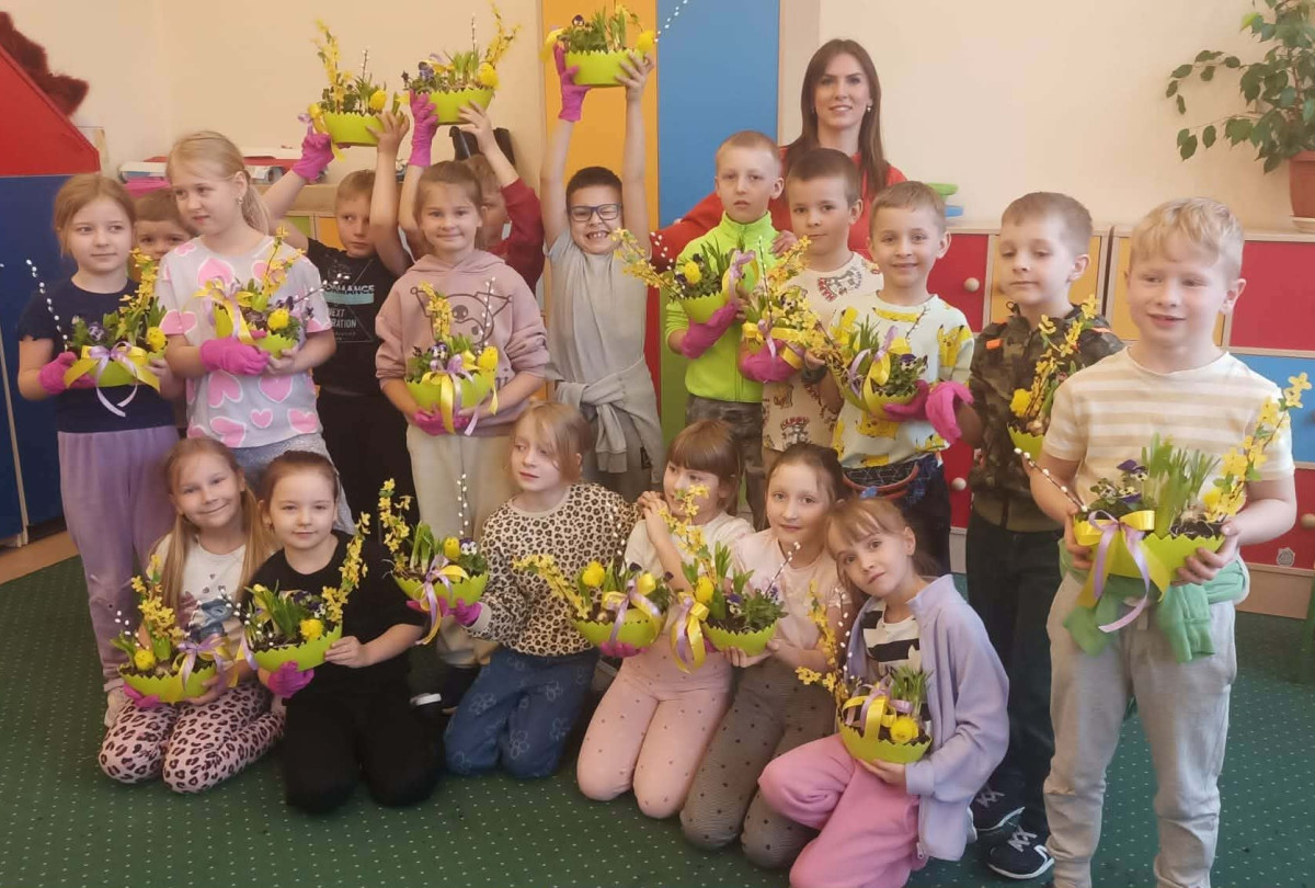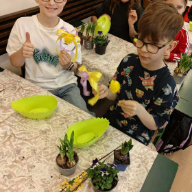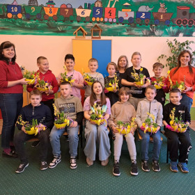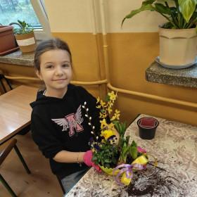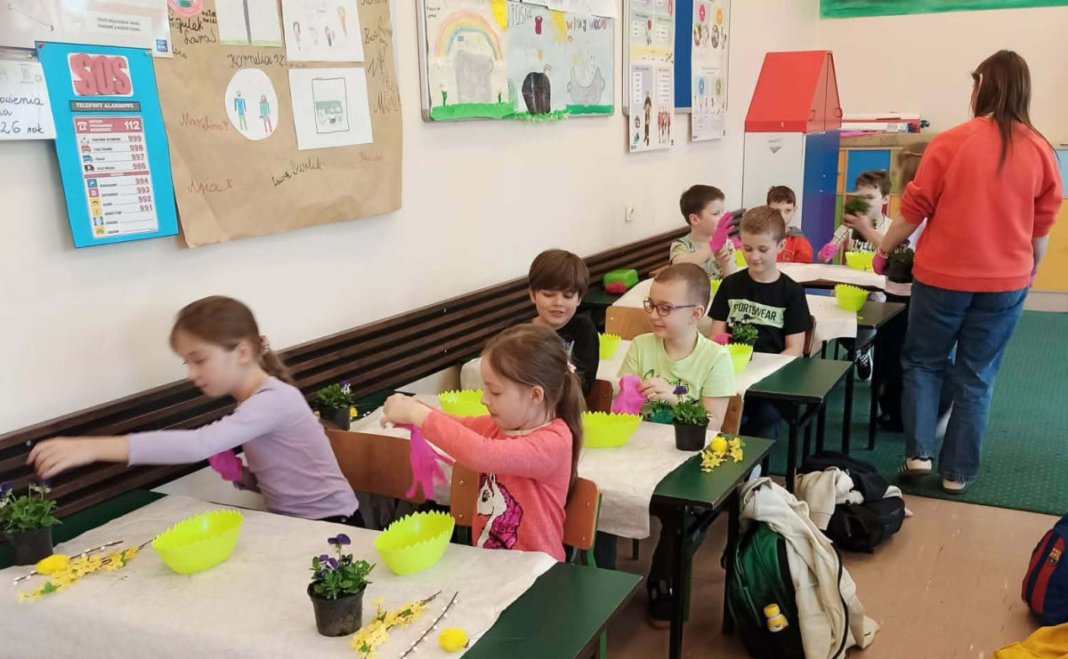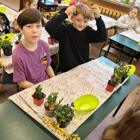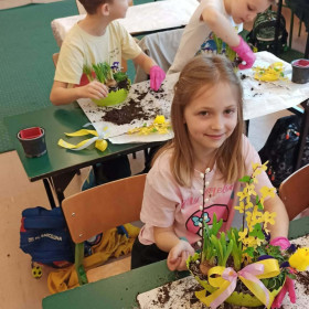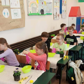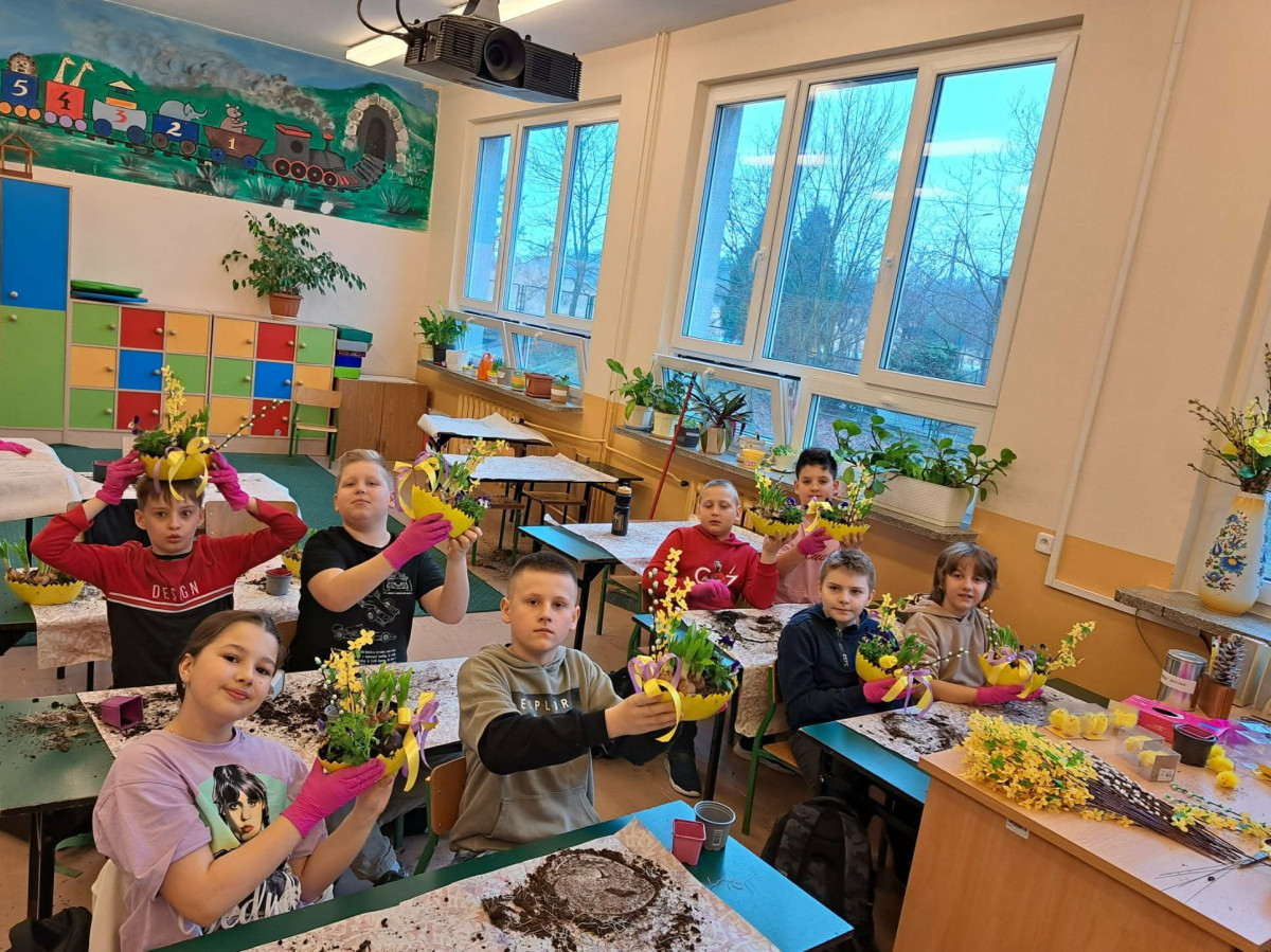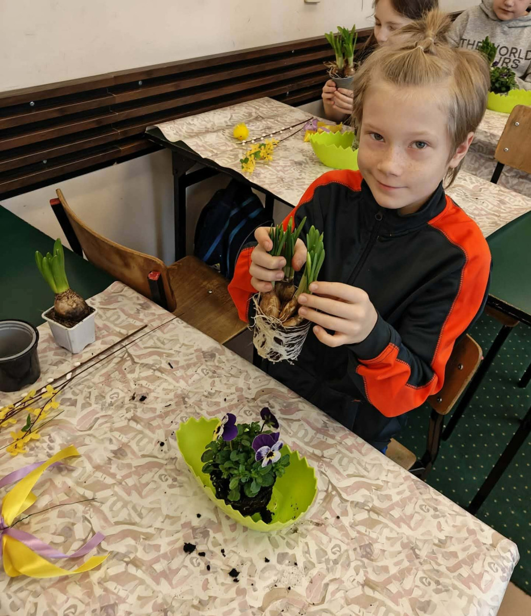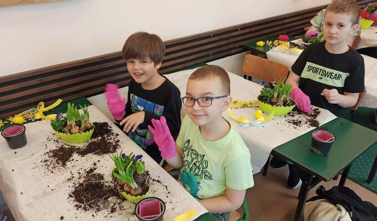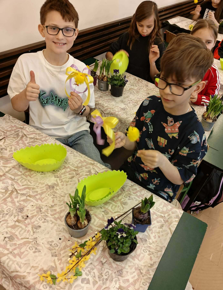 W dniu 30 marca uczniowie klas 1–4 uczestniczyli w wyjątkowych warsztatach florystycznych, podczas których mieli okazję własnoręcznie przygotować żywe stroiki świąteczne. Pod czujnym okiem prowadzącej zajęcia, florystki pani Pauliny, dzieci uczyły się łączyć świeże kwiaty i dekoracje, tworząc unikalne kompozycje, które wprowadziły w klasach świąteczny nastrój.