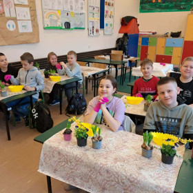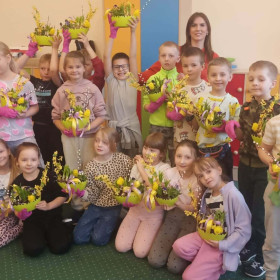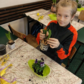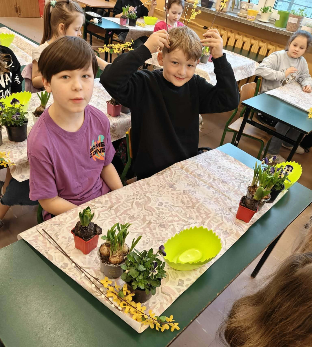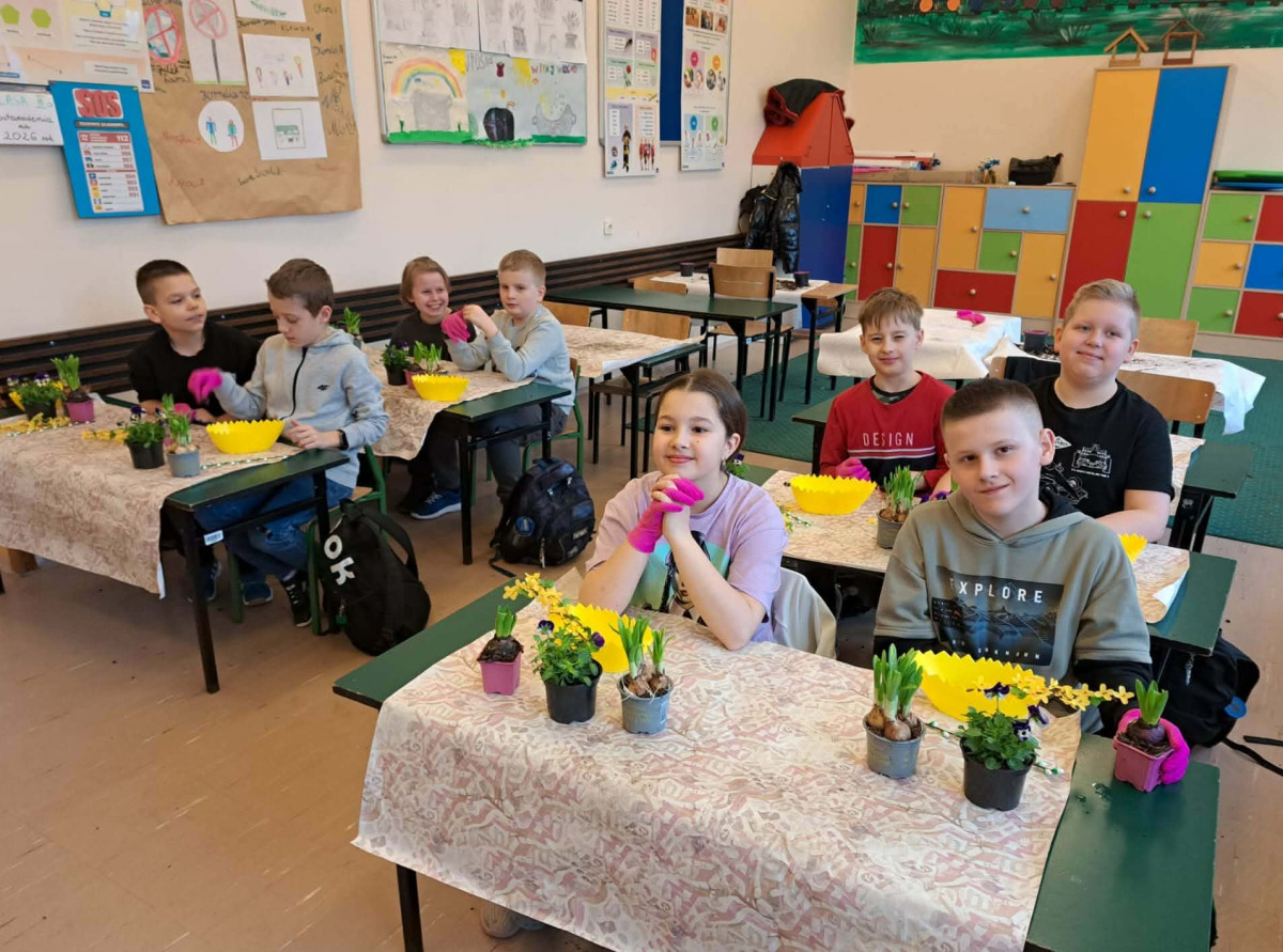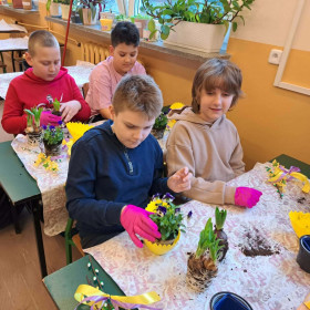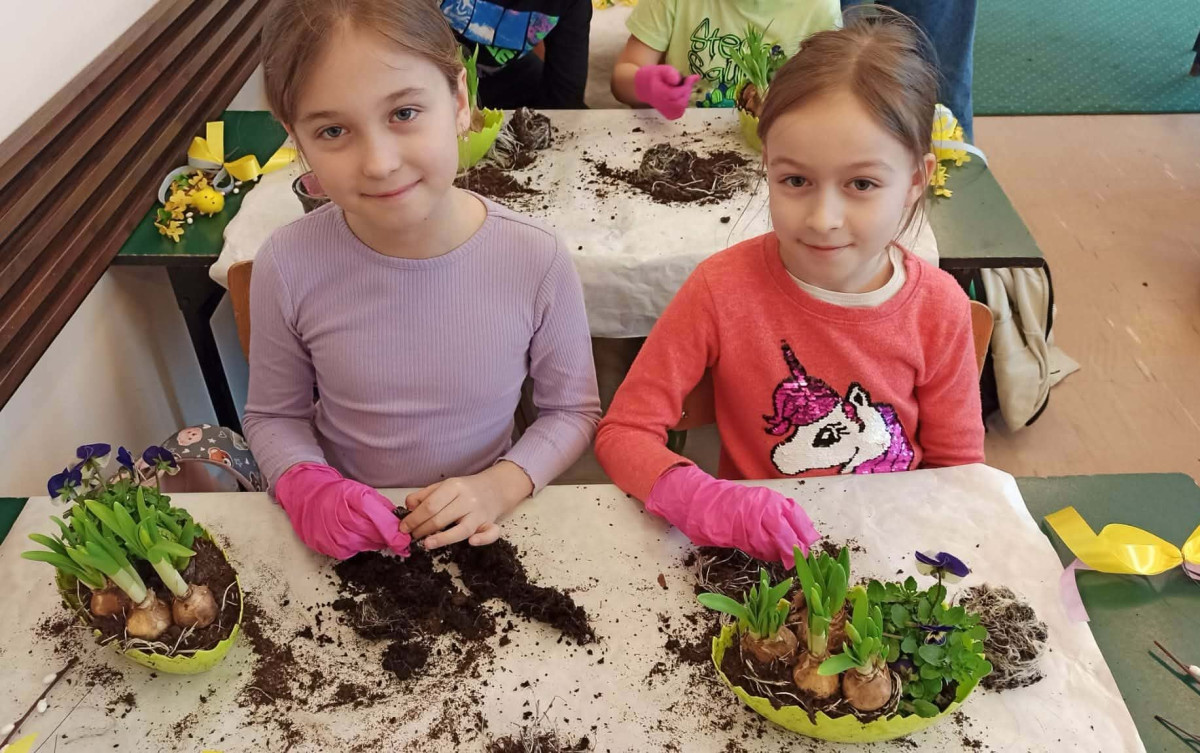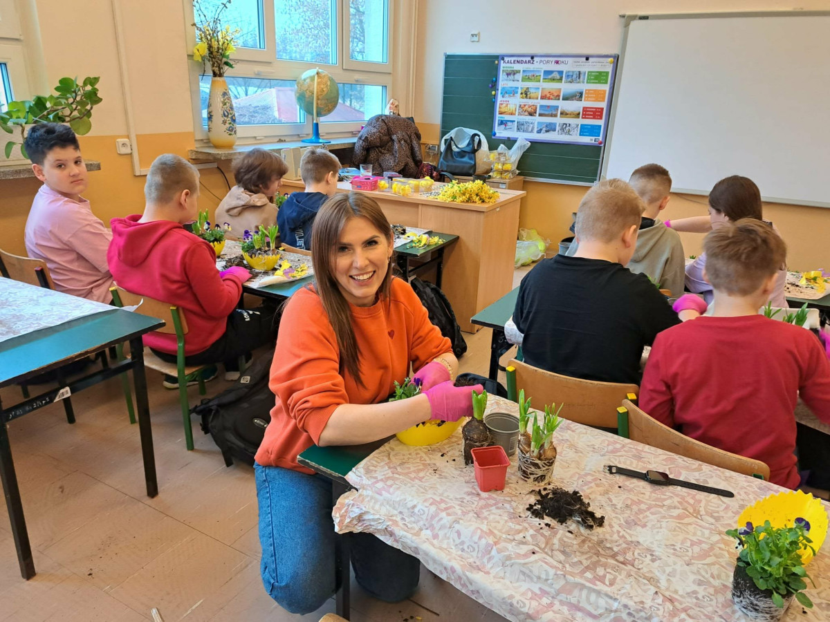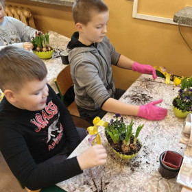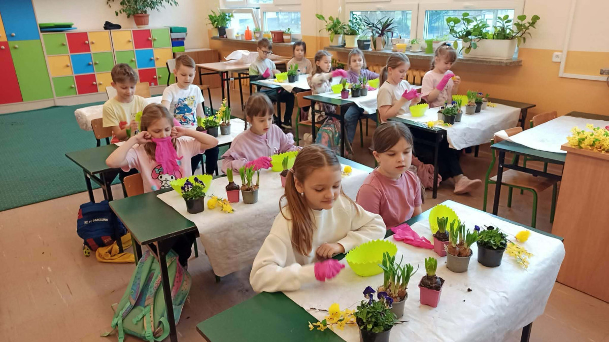 W dniu 30 marca uczniowie klas 1–4 uczestniczyli w wyjątkowych warsztatach florystycznych, podczas których mieli okazję własnoręcznie przygotować żywe stroiki świąteczne. Pod czujnym okiem prowadzącej zajęcia, florystki pani Pauliny, dzieci uczyły się łączyć świeże kwiaty i dekoracje, tworząc unikalne kompozycje, które wprowadziły w klasach świąteczny nastrój.