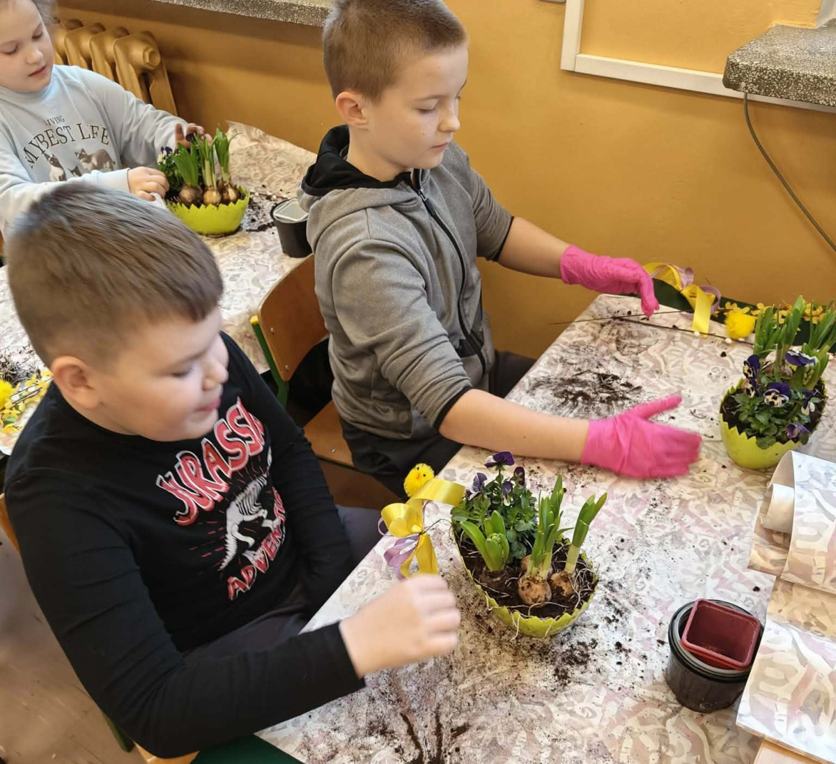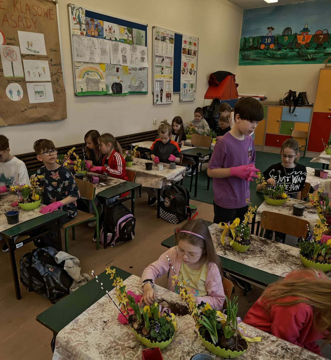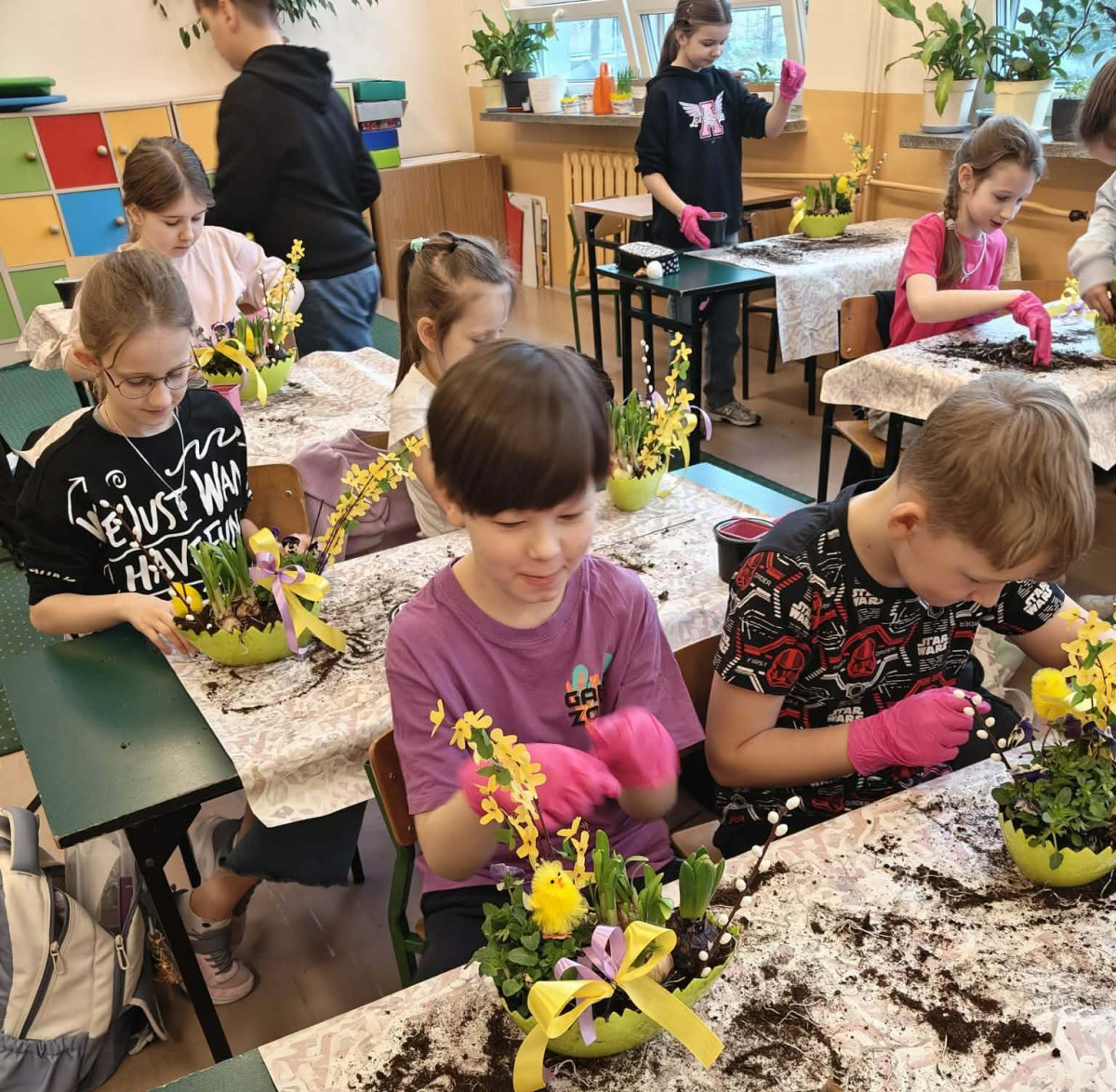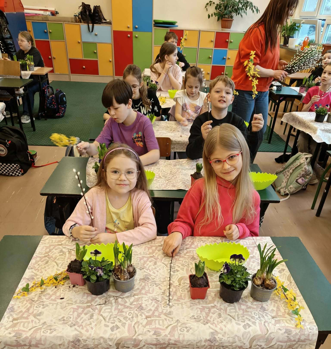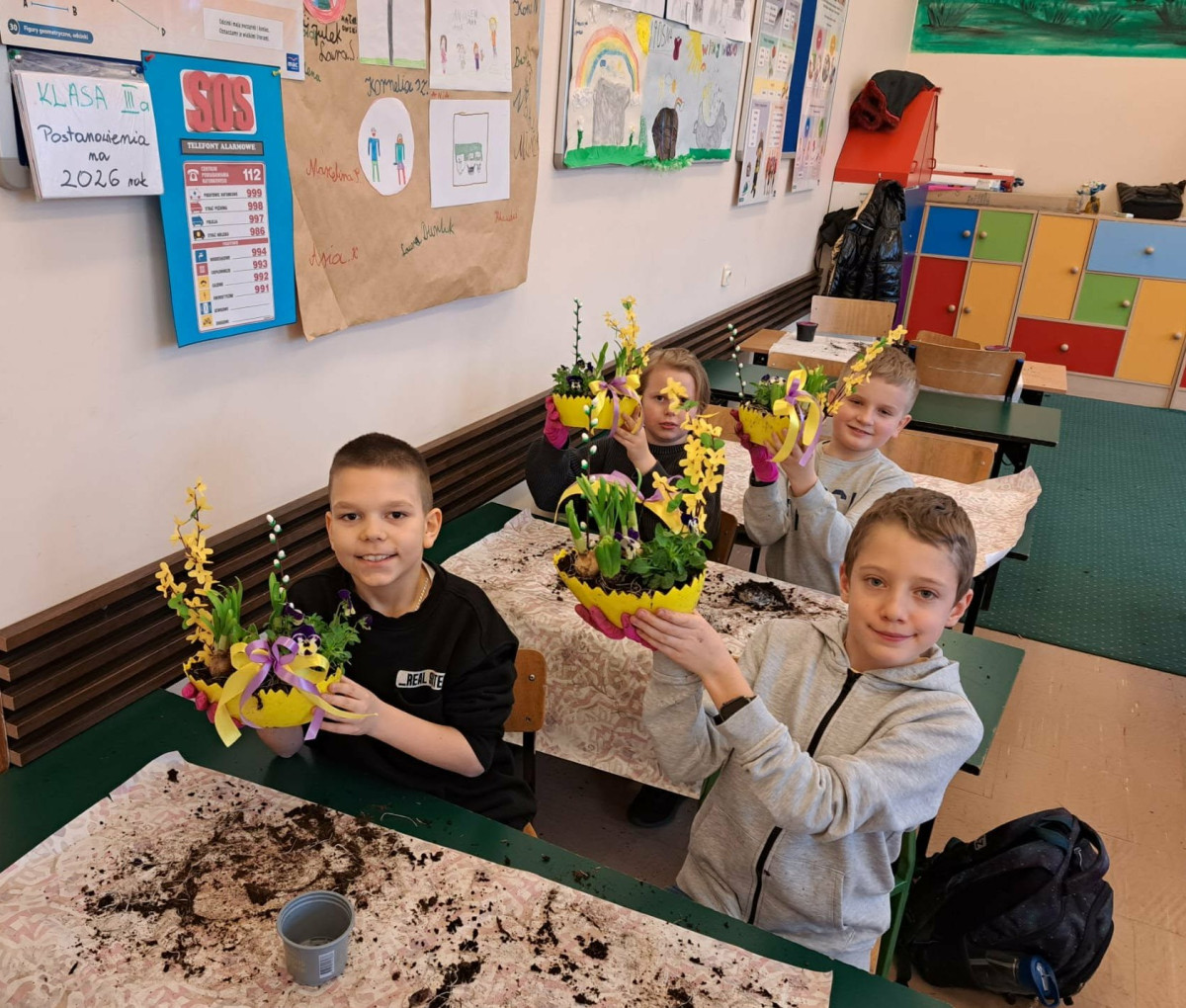 W dniu 30 marca uczniowie klas 1–4 uczestniczyli w wyjątkowych warsztatach florystycznych, podczas których mieli okazję własnoręcznie przygotować żywe stroiki świąteczne. Pod czujnym okiem prowadzącej zajęcia, florystki pani Pauliny, dzieci uczyły się łączyć świeże kwiaty i dekoracje, tworząc unikalne kompozycje, które wprowadziły w klasach świąteczny nastrój.