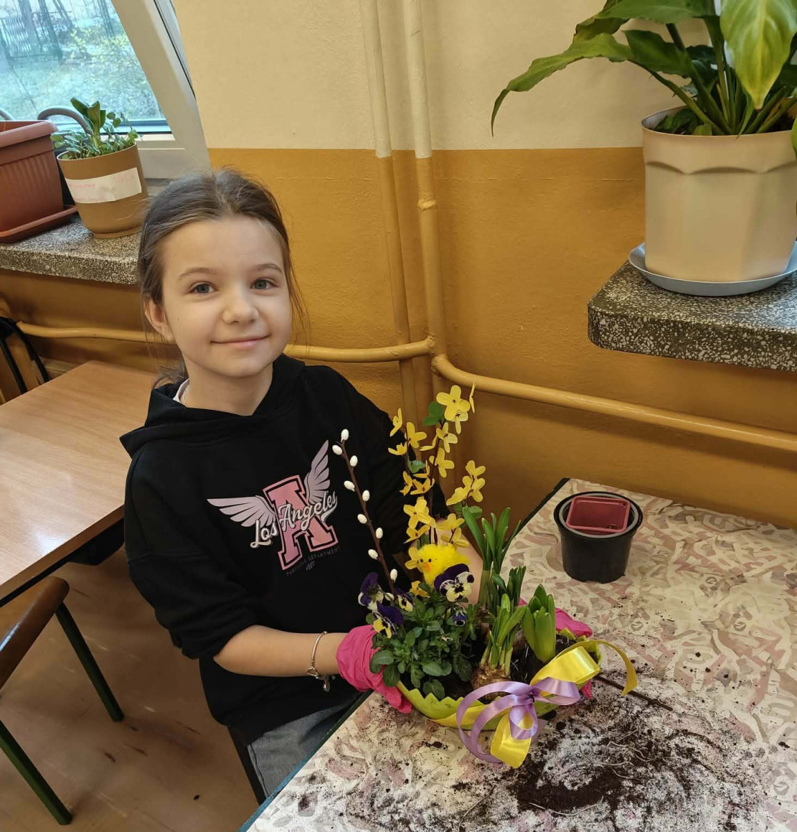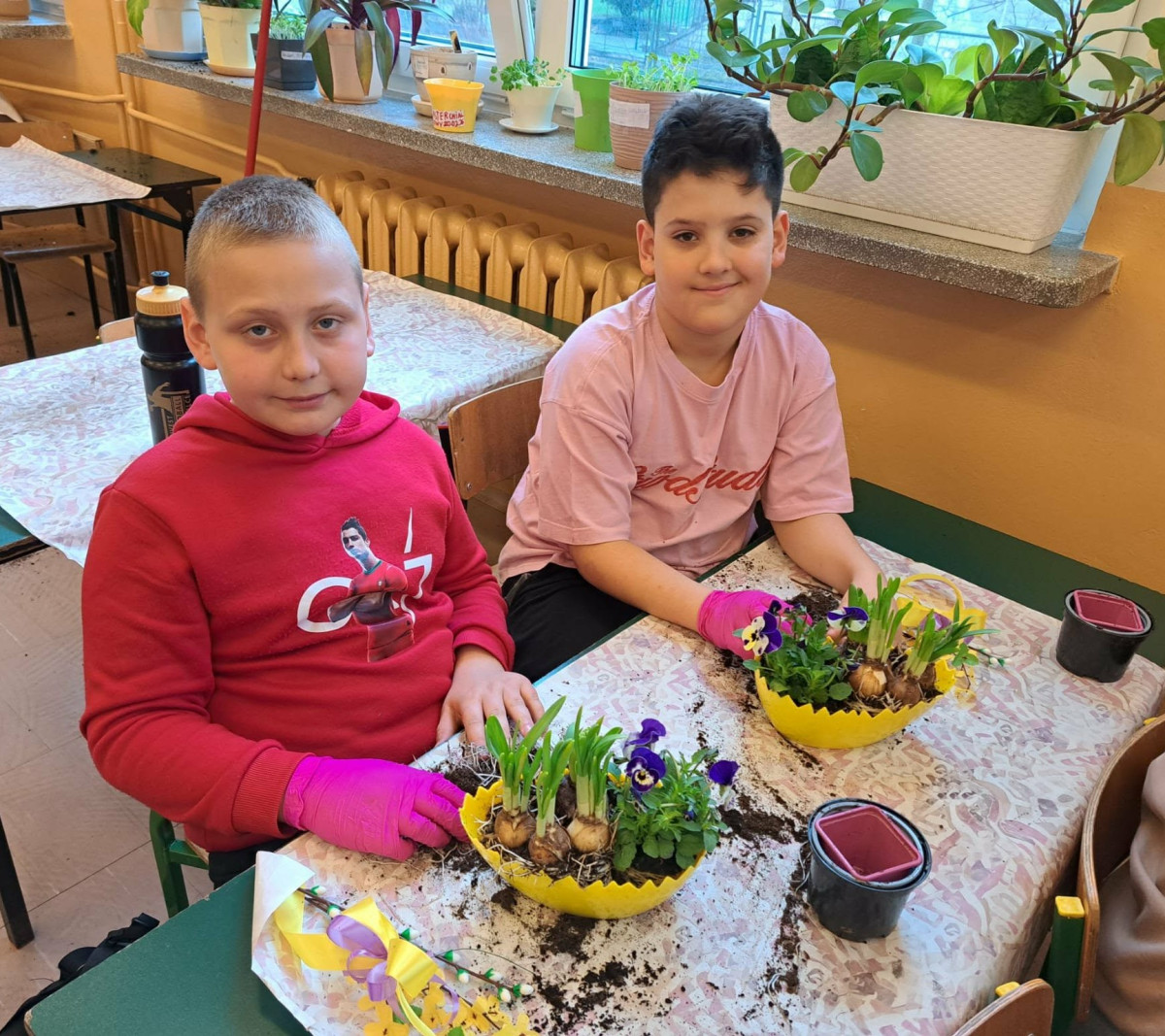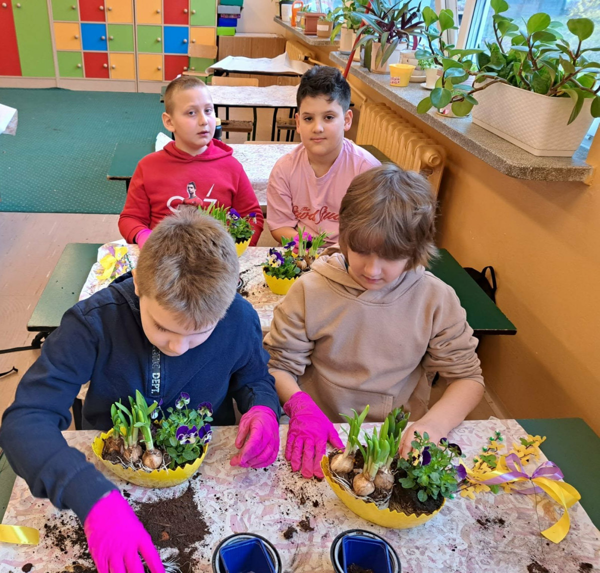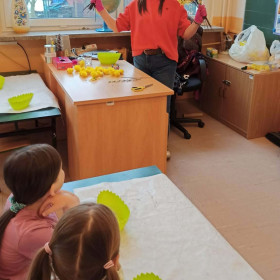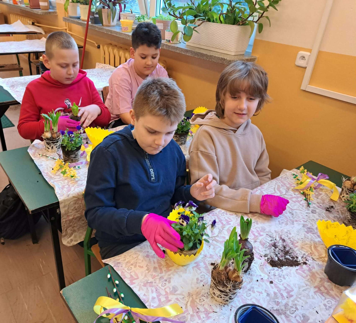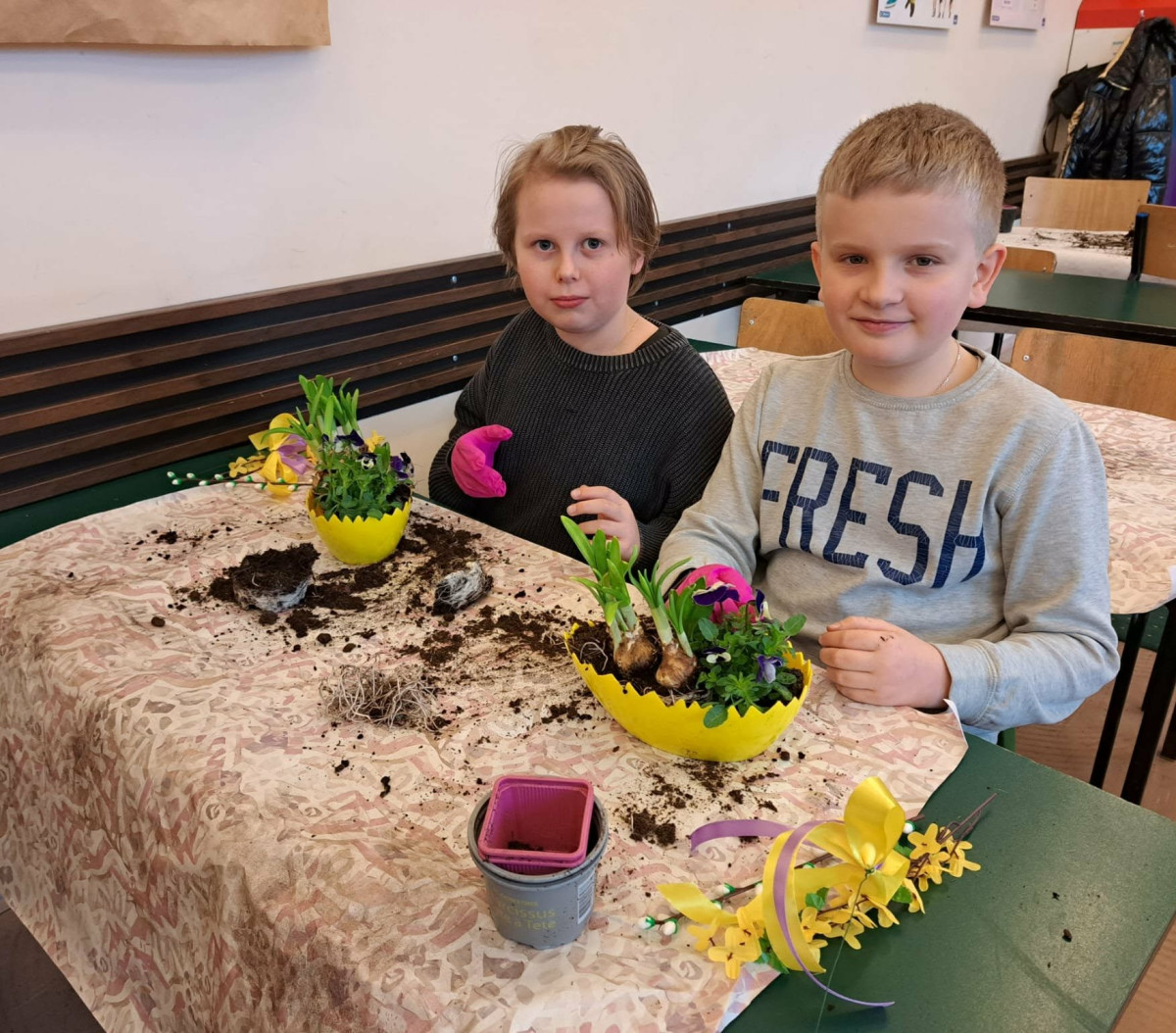W dniu 30 marca uczniowie klas 1–4 uczestniczyli w wyjątkowych warsztatach florystycznych, podczas których mieli okazję własnoręcznie przygotować żywe stroiki świąteczne. Pod czujnym okiem prowadzącej zajęcia, florystki pani Pauliny, dzieci uczyły się łączyć świeże kwiaty i dekoracje, tworząc unikalne kompozycje, które wprowadziły w klasach świąteczny nastrój.